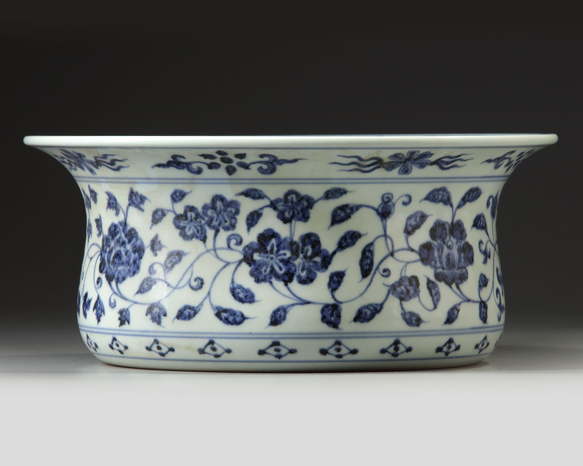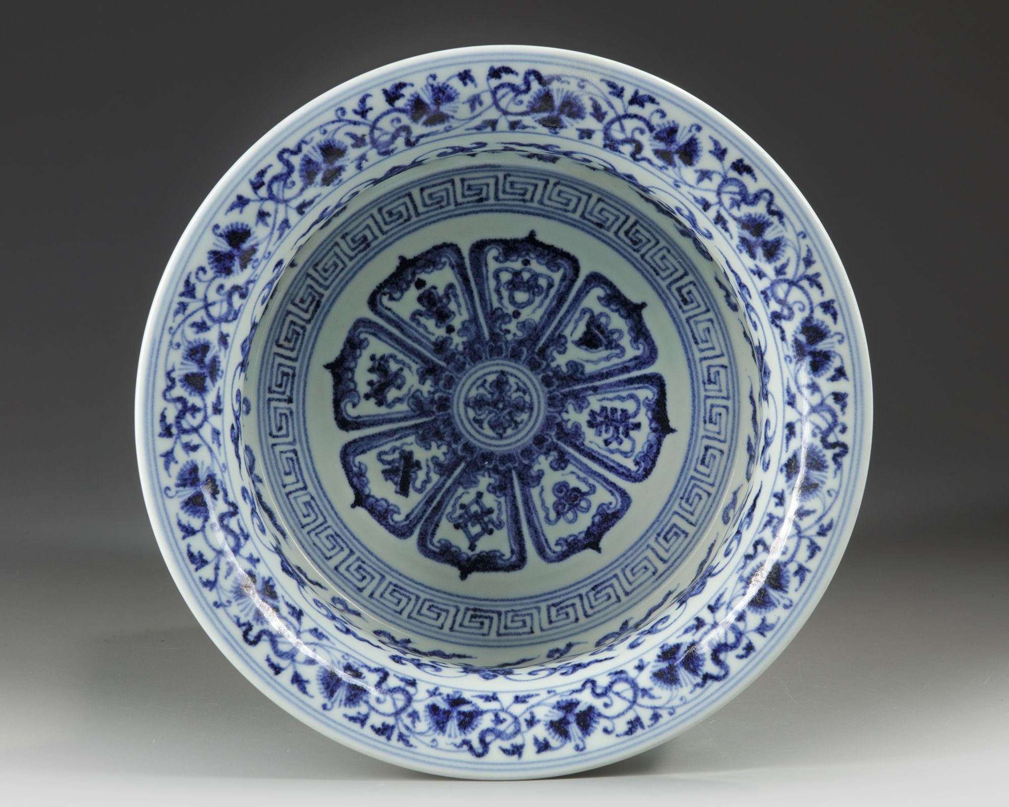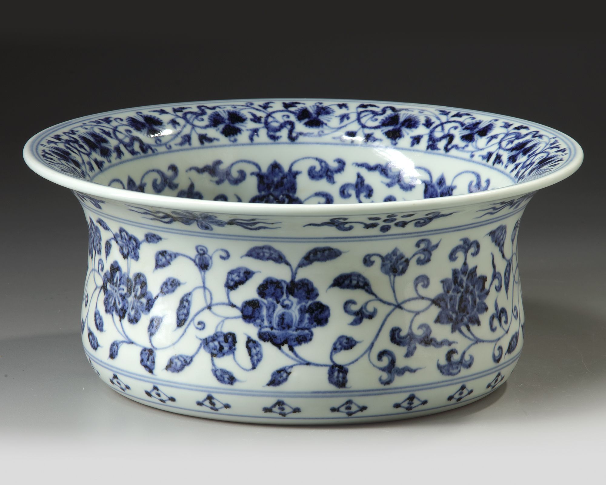 A basin with slightly tapered sides rising to a wide flared rim, the flat interior beautifully and richly painted in cobalt-blue tones, with the more pointed hexafoil rosette, has a rim border of quatrefoil panels with floral sprigs and scroll motifs; see Yamato Bunkakan shozōhin zuhan mokuroku 7. Chūgoku tōji/Chinese Ceramics from the Museum Yamato Bunkakan Collection, Illustrated Catalogue Series no. 7, Nara, 1977, no. 134. 14 cm. height, 32.5 cm diam.