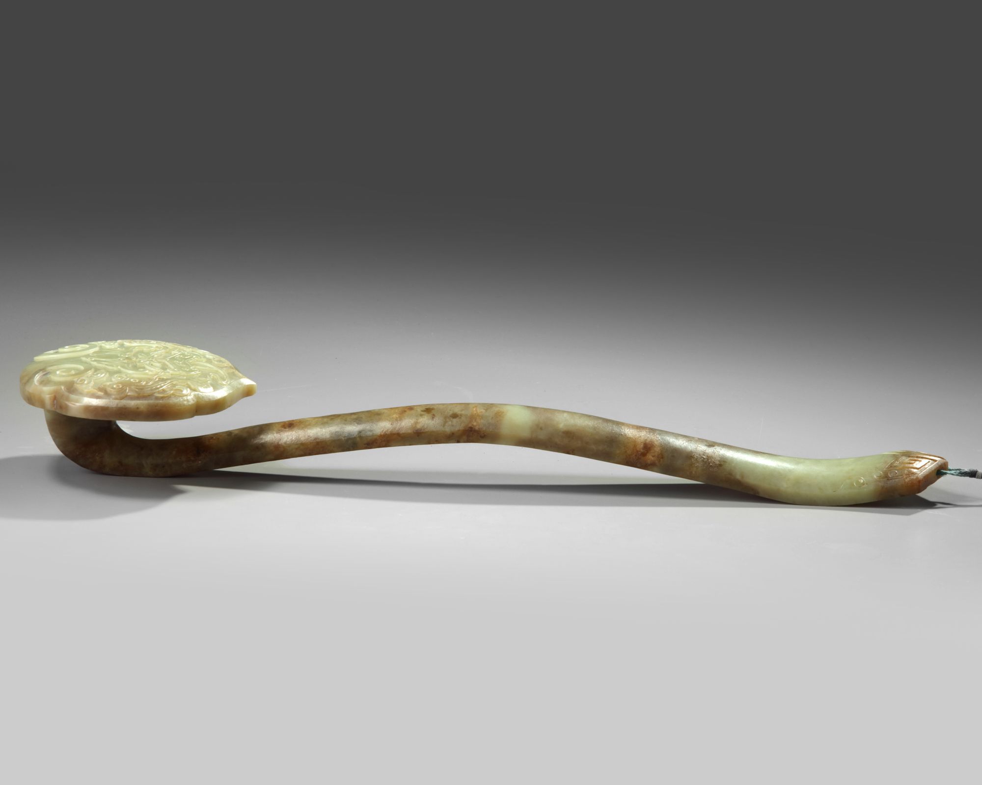 The ruyi-shaped head is carved in relief with a bat holding a beribboned chime, flanked by twin carp, all below two cloud scrolls. The tapered base of the sceptre is carved with two squared scrolls. The stone is of a celadon tone with russet inclusions. 42.5 by 11.5 by 5 cm.