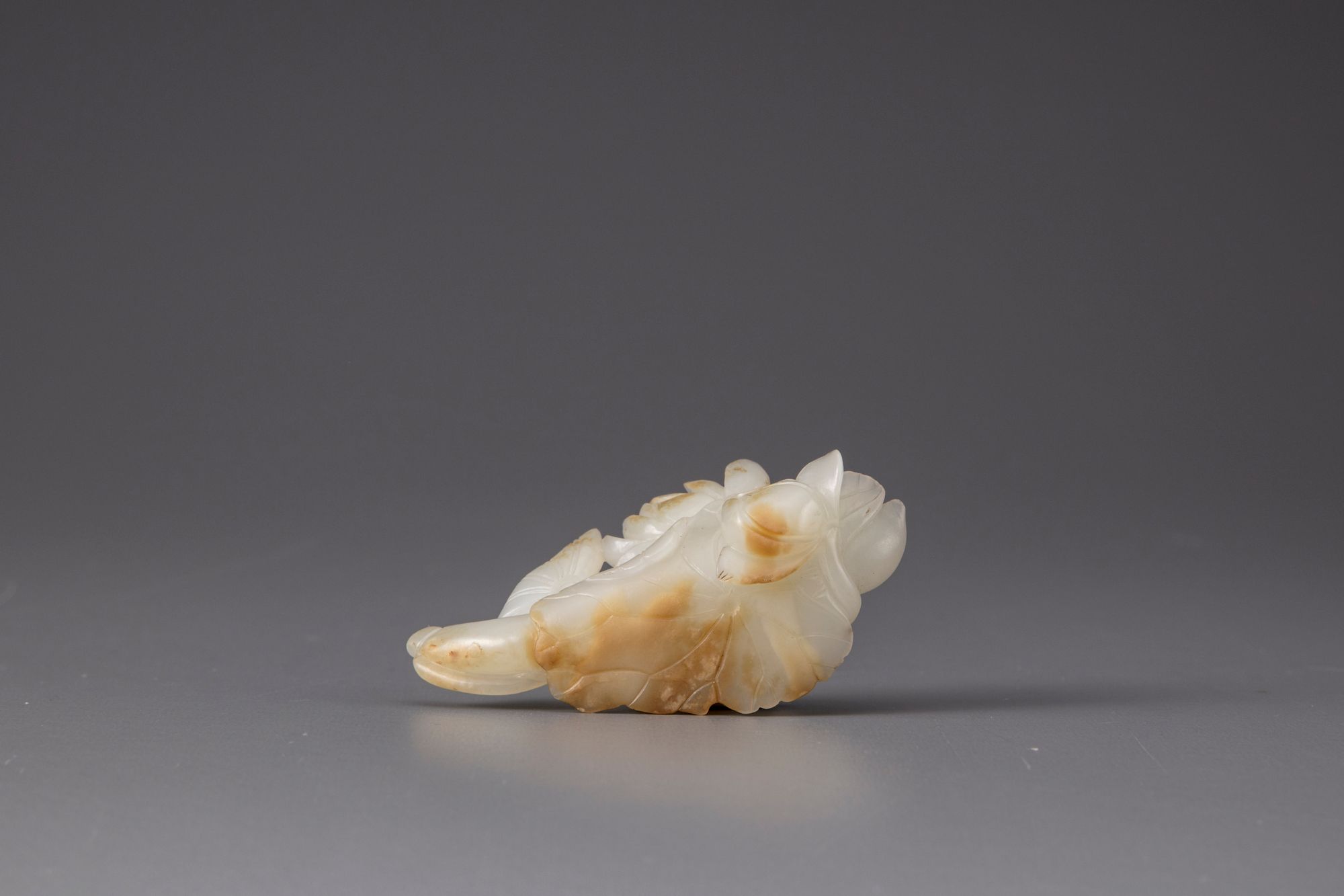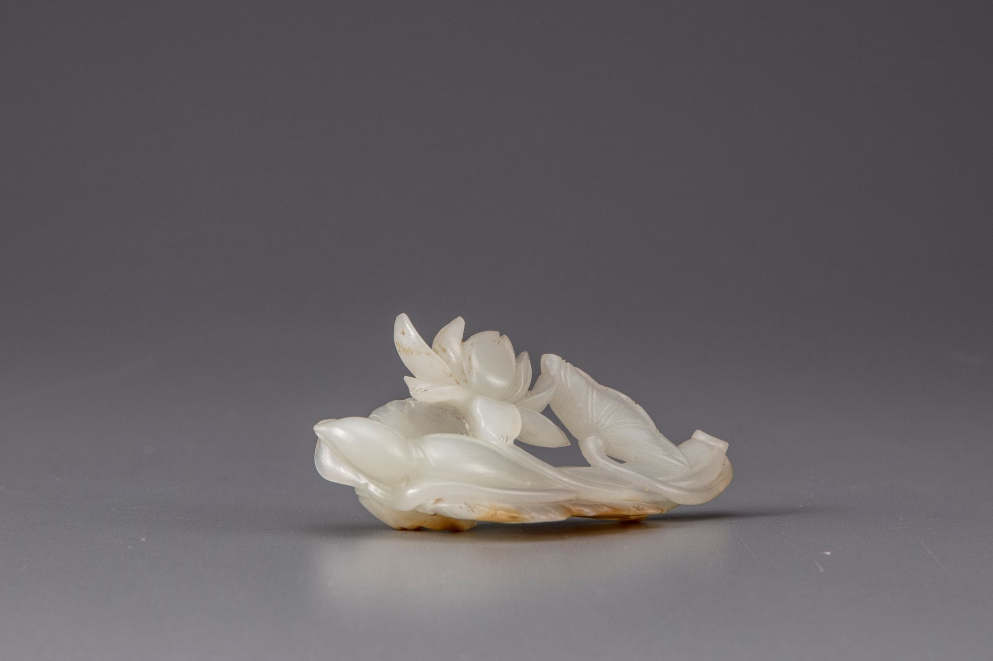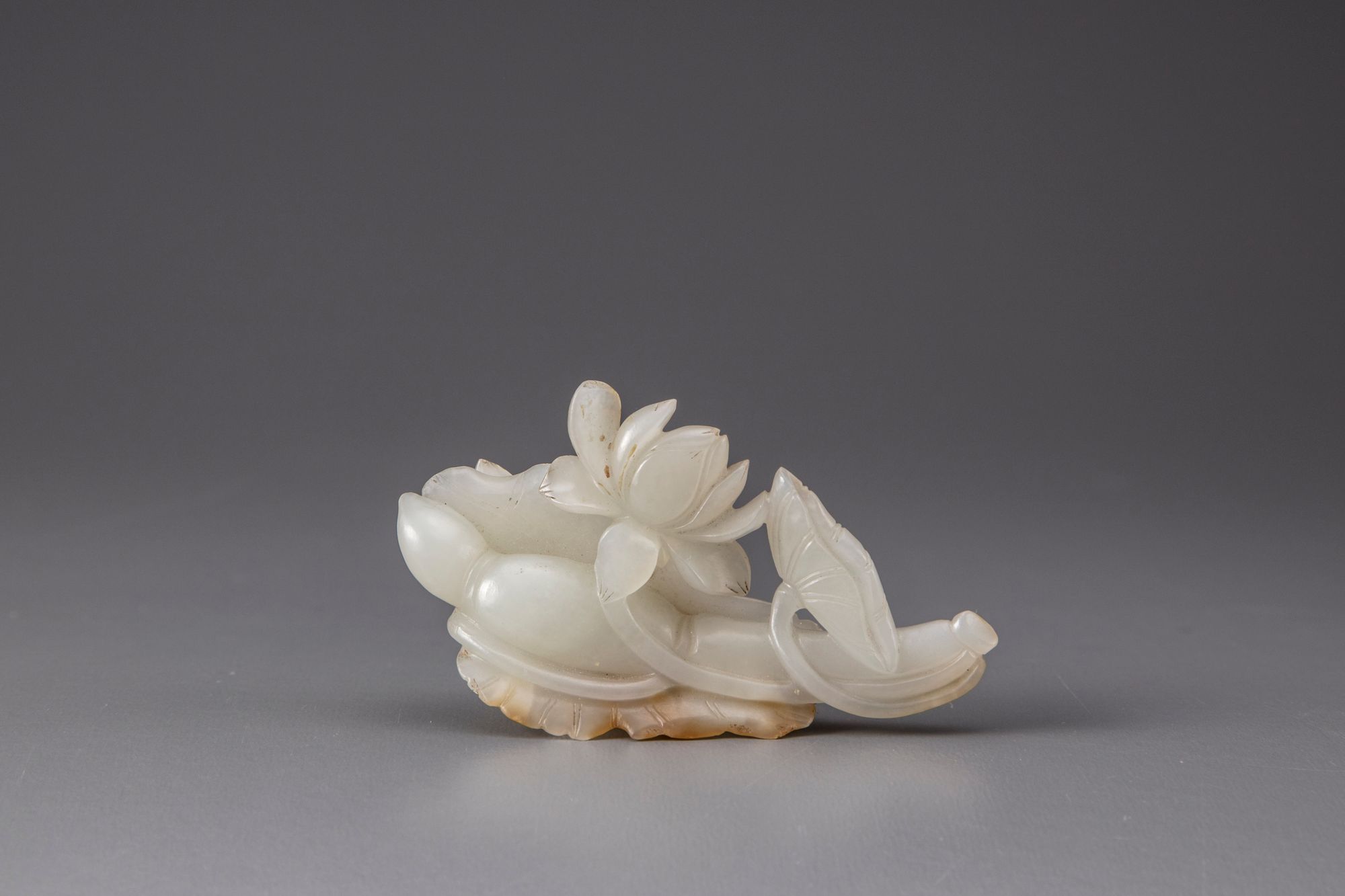 The piece is carved in the round as a lotus root resting upon a large lotus leaf, attached to two blossoming lotus flowers. The stone is of an even tone with russet inclusions to the bottom surface.