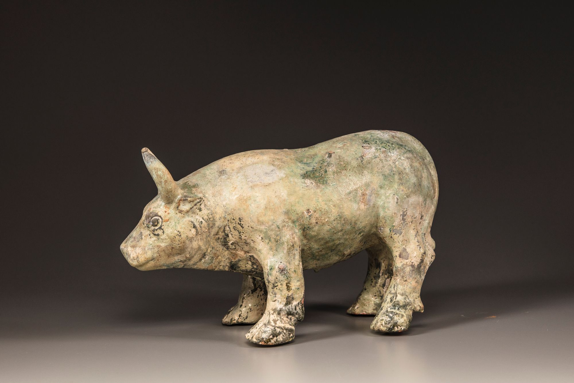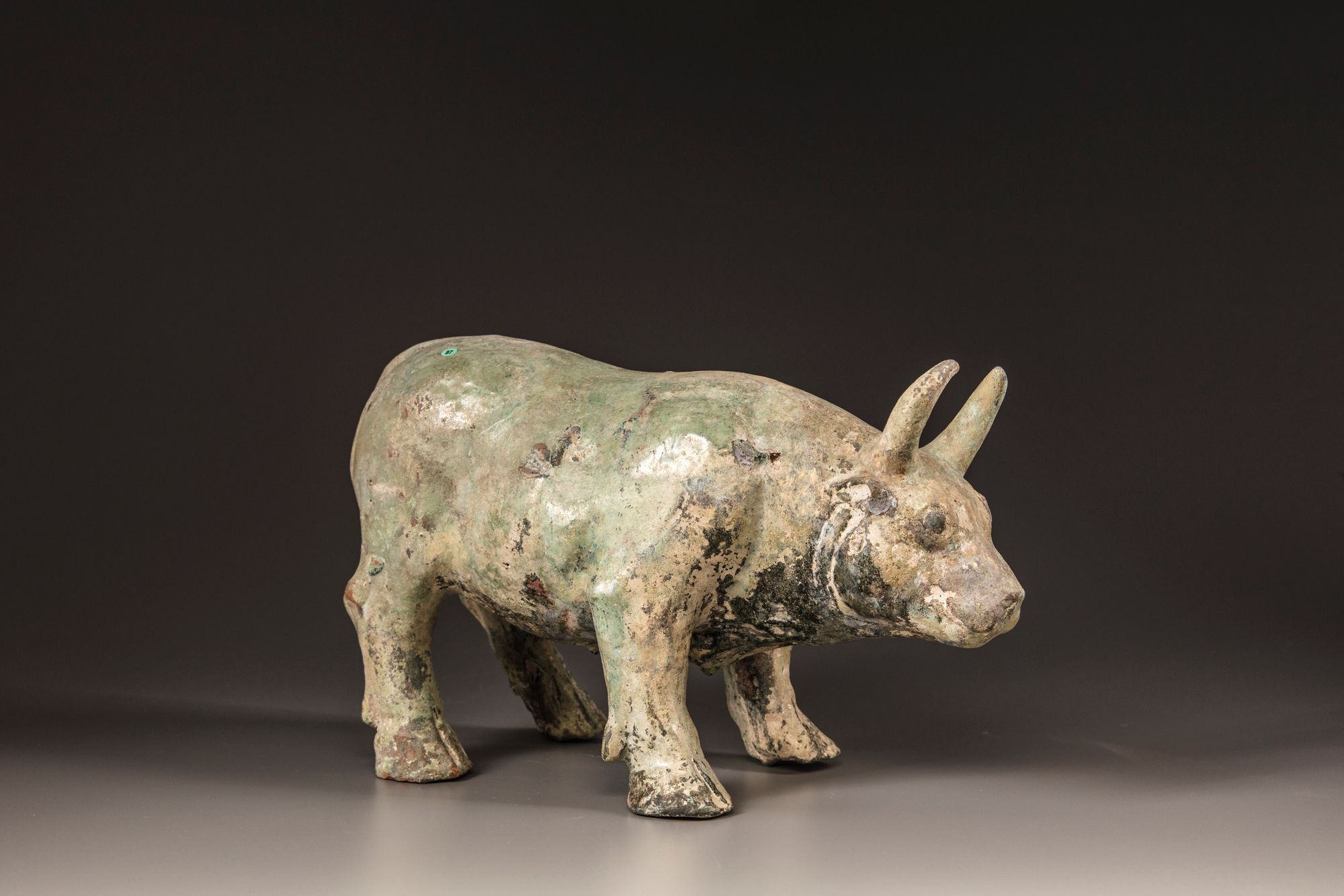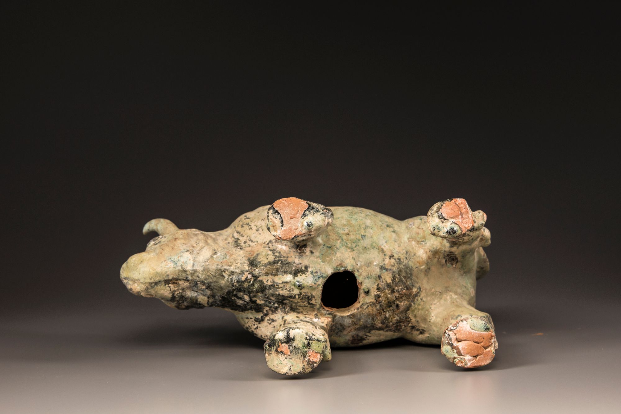 Condition: with areas of restoration and associated overpainting, including to the body and the horn; chips to the glaze and a few firing flaws.