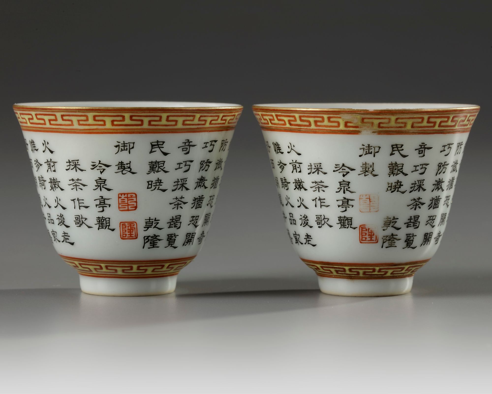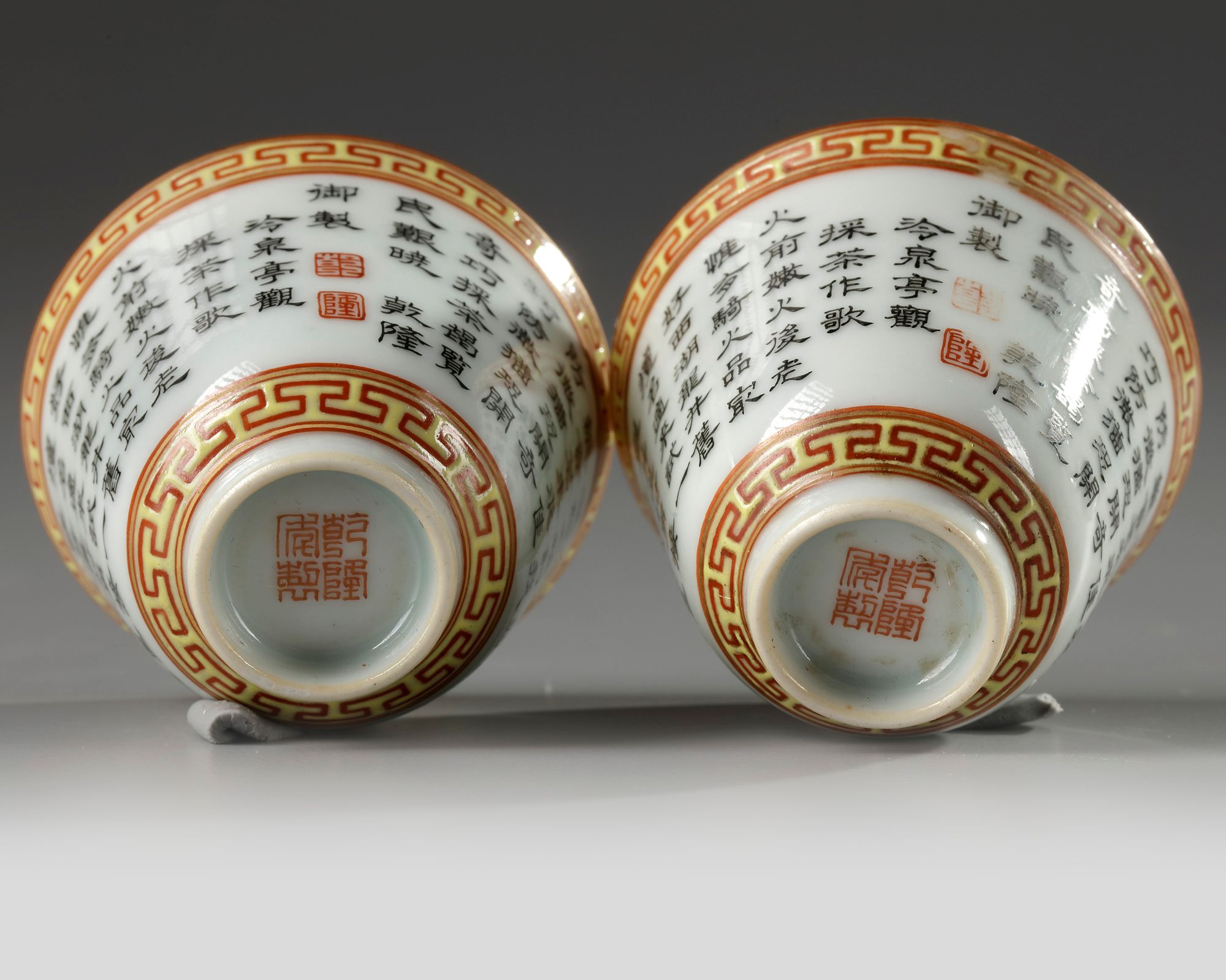 Each cup is decorated with a poetic inscription, with an apocryphal 'Qianlong yuzhi' signature and two seal marks. Each base with an apocryphal Qianlong mark.