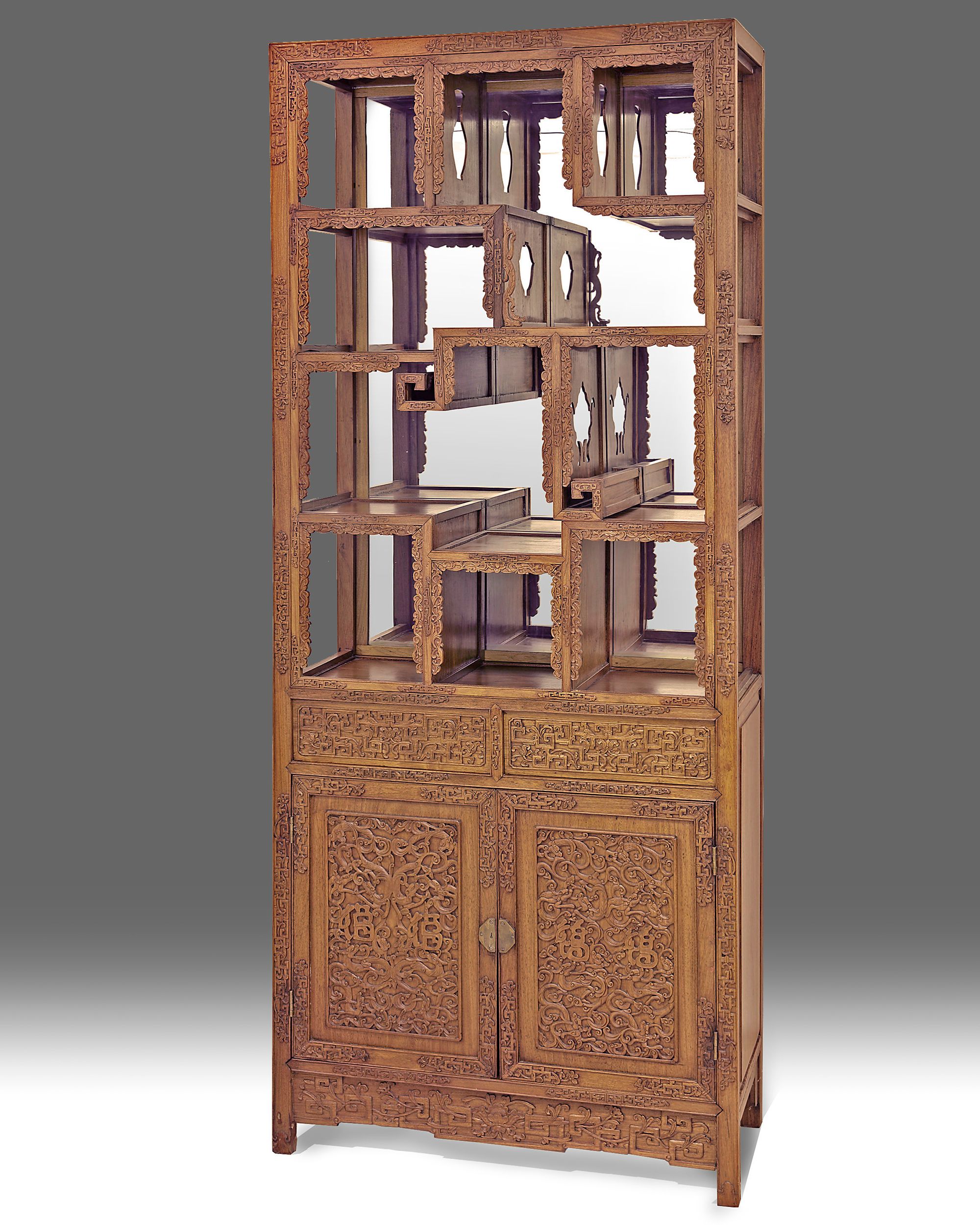 The cabinet is constructed of shelves of various sizes and shapes separated by upright panels with silhouette vases and bowls, all with various floral openwork friezes. The cupboard to the lower section is decorated with carved floral designs and two stylised Chinese characters, and affixed with a decorative lockplate.