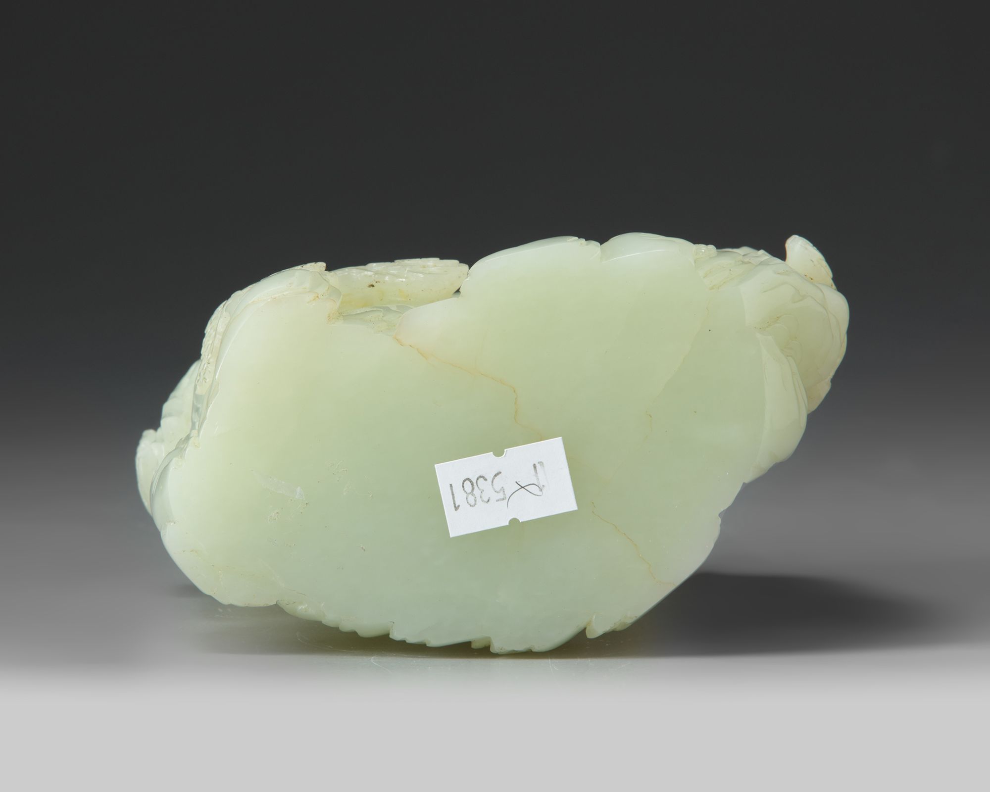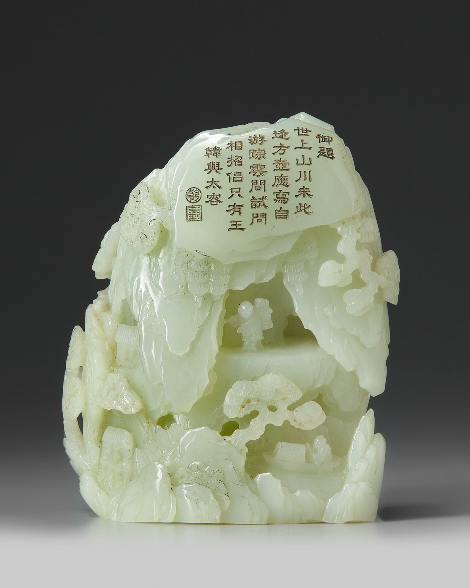 The jade mountain is carved in the round with stairs leading to pavilions in rocky grottoes all amongst gnarled pine and wisteria trees. The reverse is carved with an imperial poem and two seal marks reading ‘qian’ and long’ and two figures.