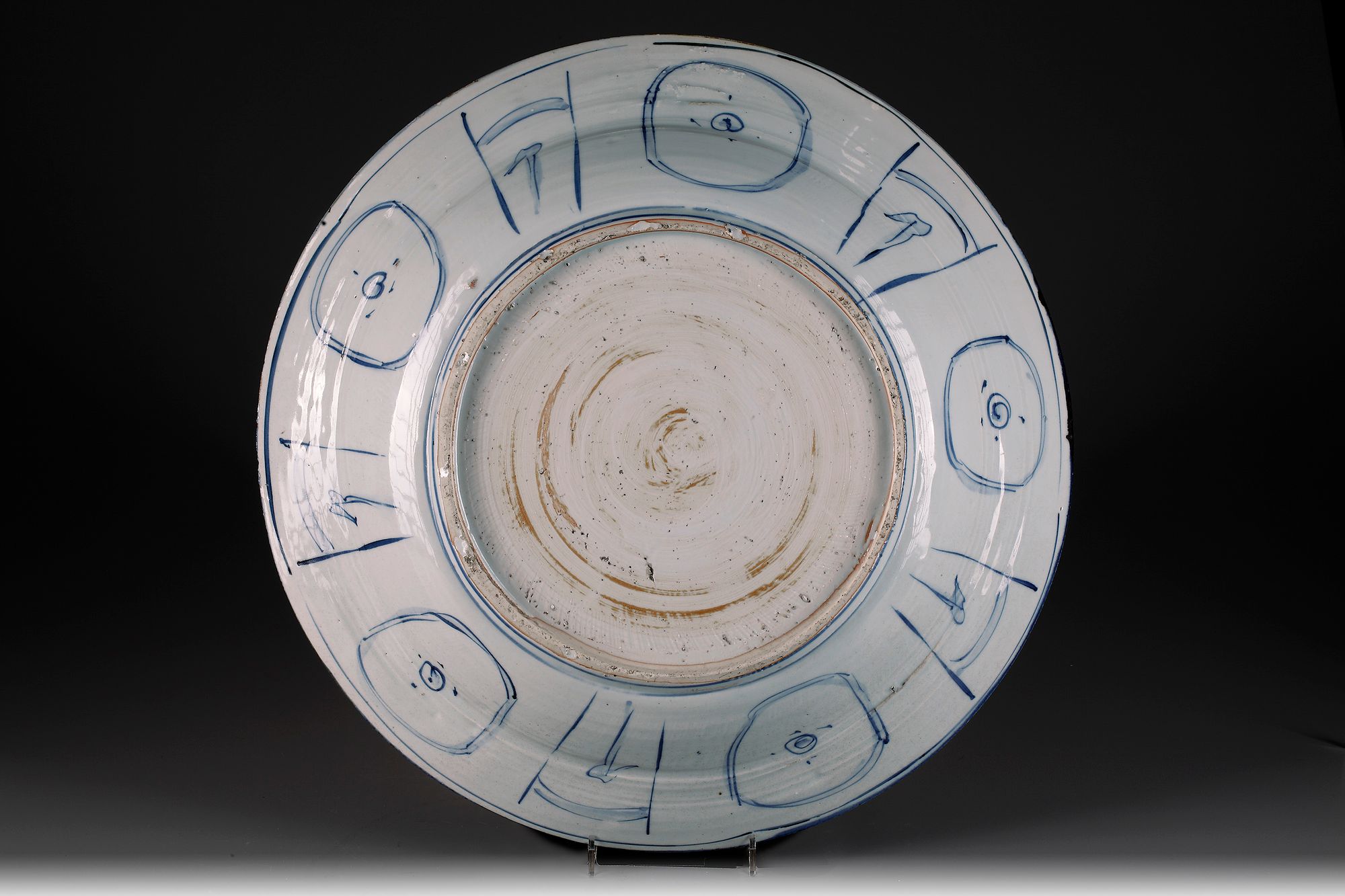 A large deep dish painted with a walking man carrying a parasol on a rocky promontory and pointing to a fisherman in a boat. All in a sunlit mountainous river scene with a pagoda and trees within a double-ring medallion. The border with a continuous scene of four pairs of seated men wearing long robes separated by pine, willow, prunus and bamboo, the underside with five freely painted panels each enclosing a pearl.
