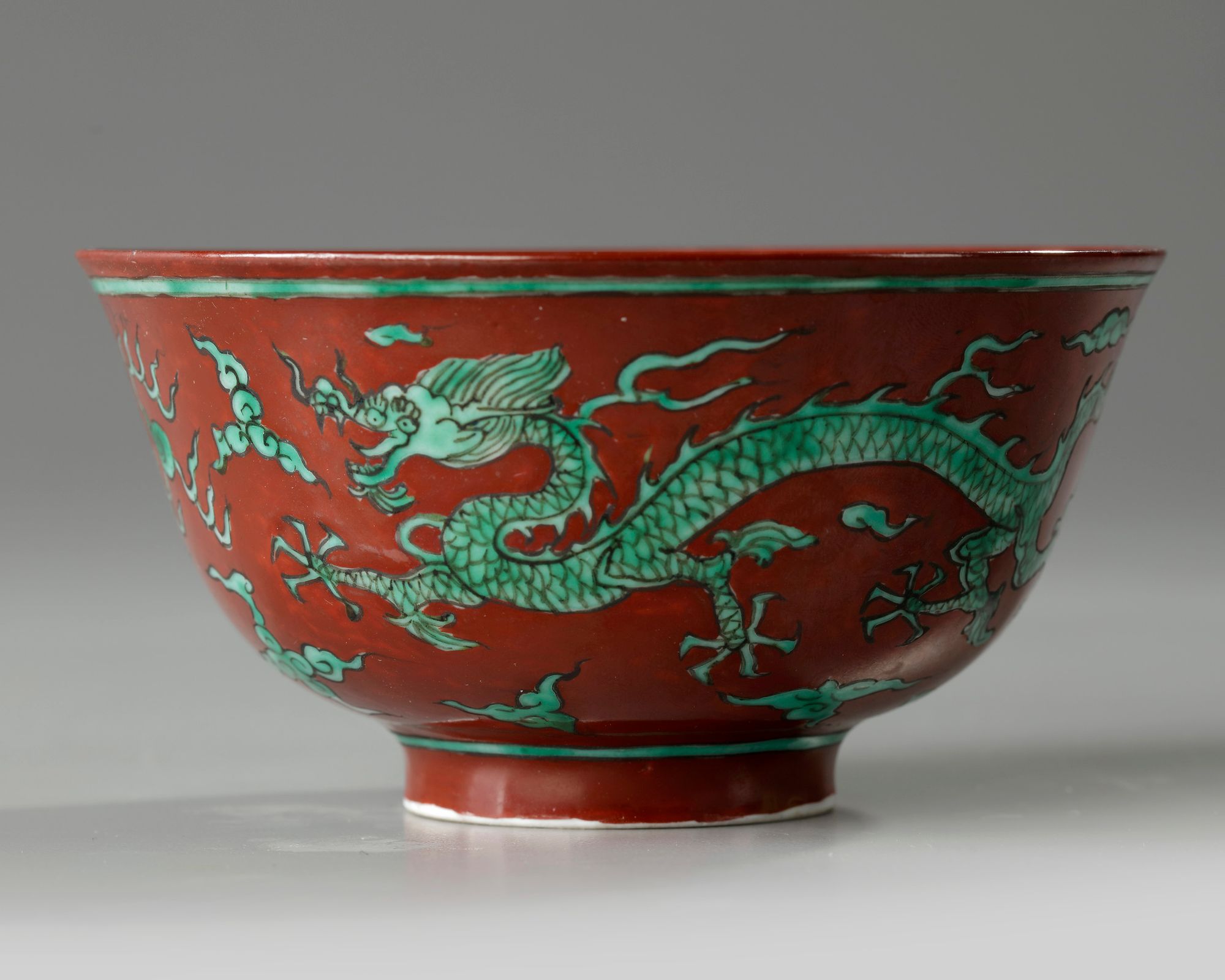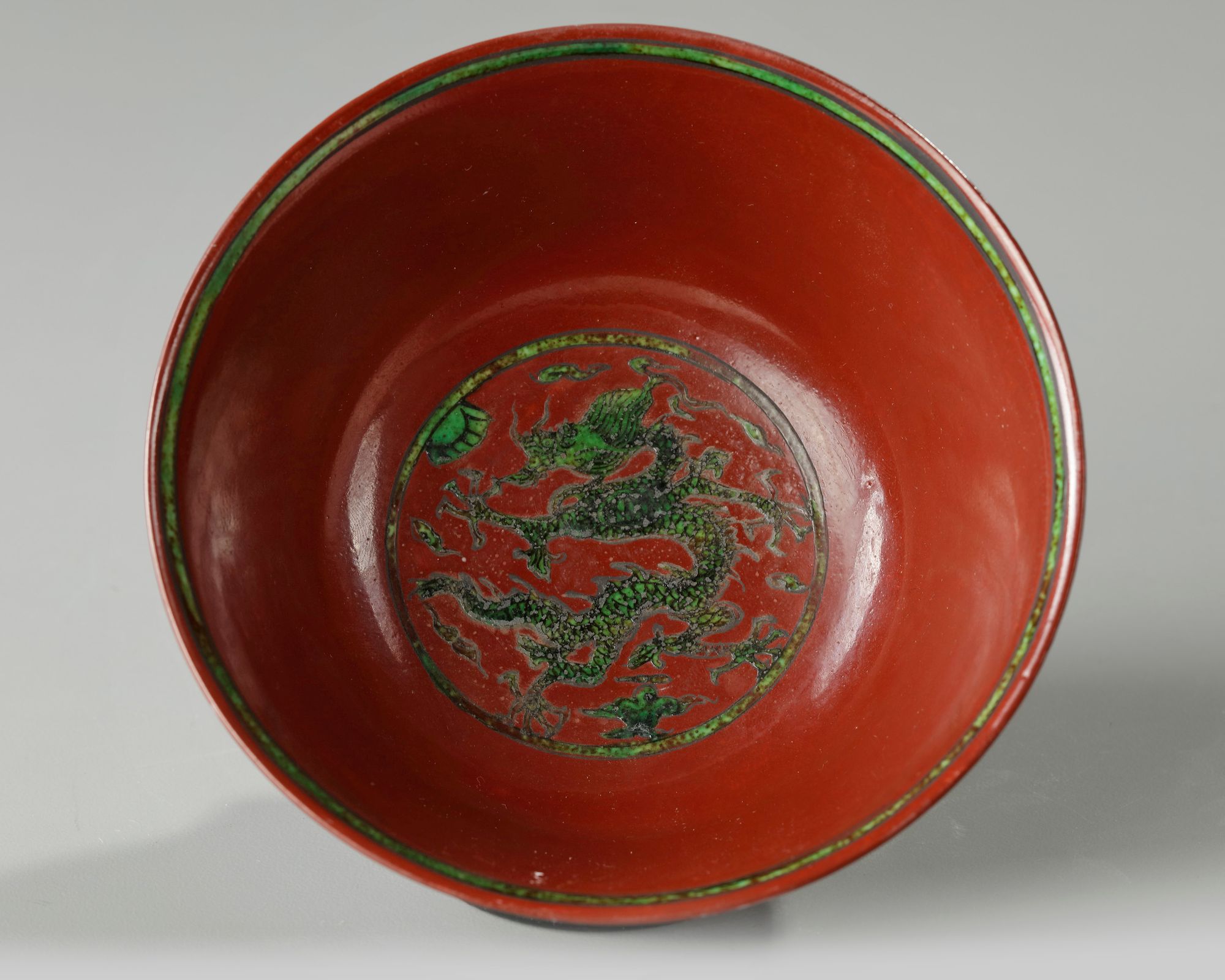 The exterior is decorated with two green-enamelled striding dragons chasing the flaming pearl, the interior with a further dragon roundel. The base with an apocryphal Wanli mark. all reserved on an opaque red-enamelled ground.