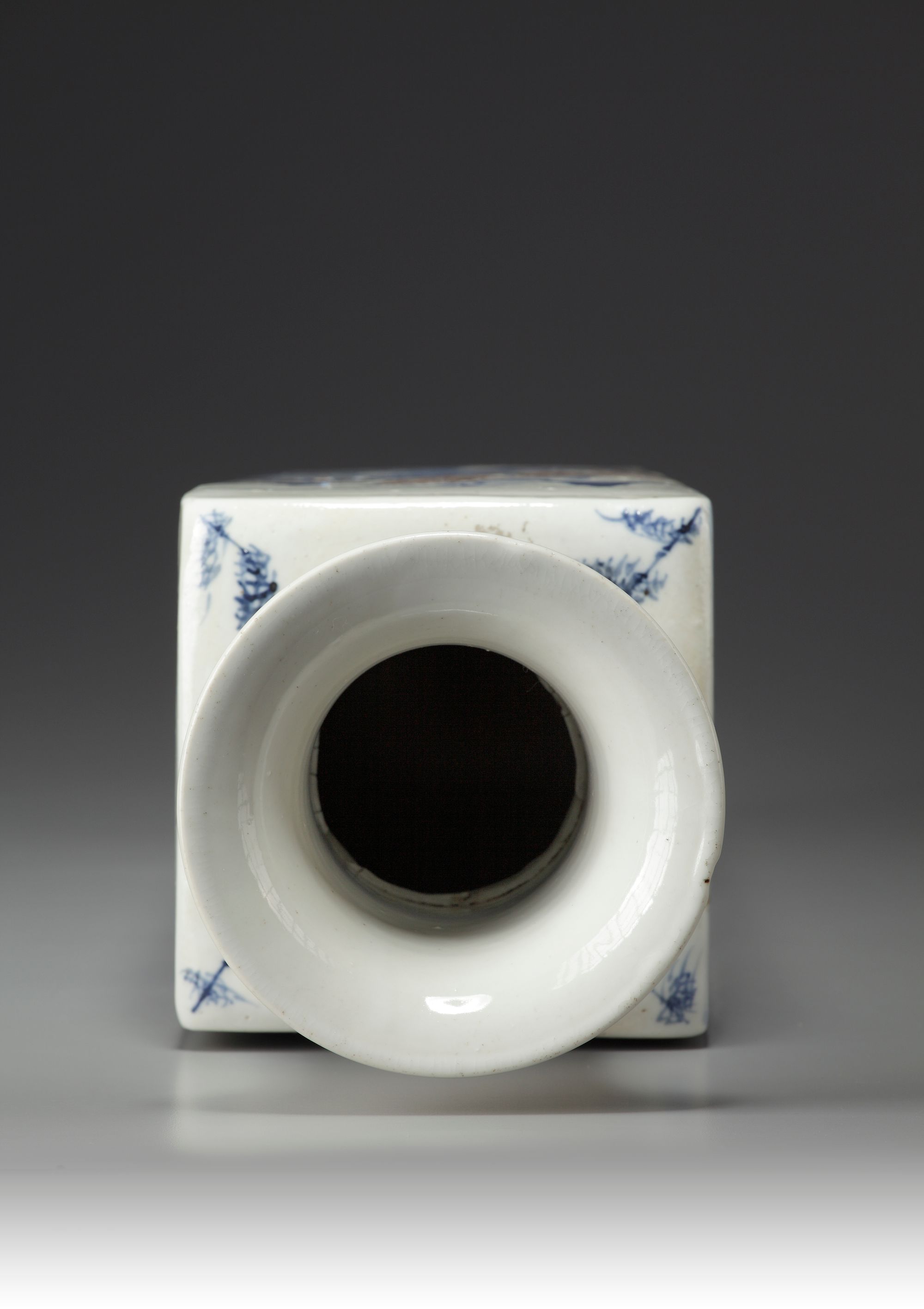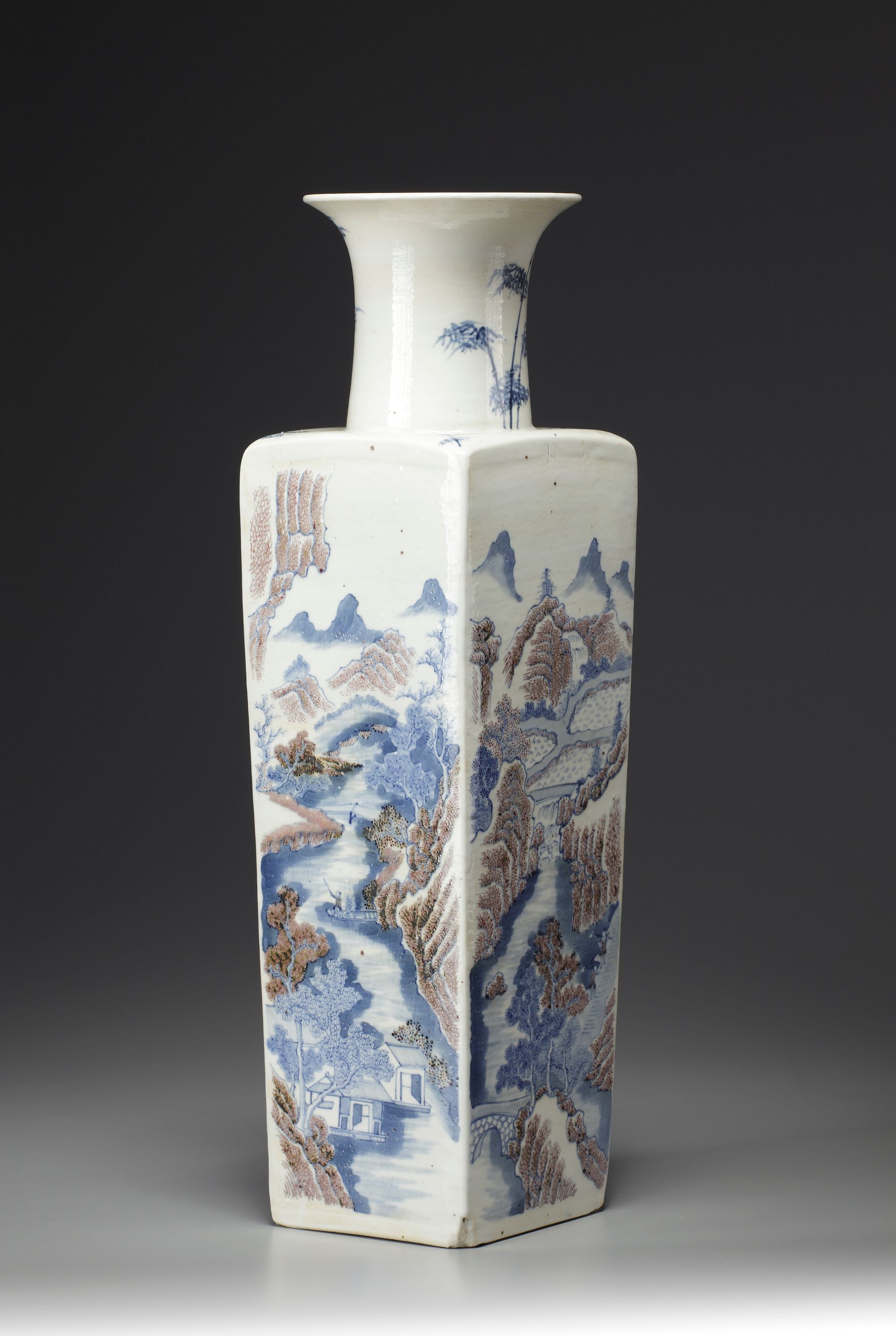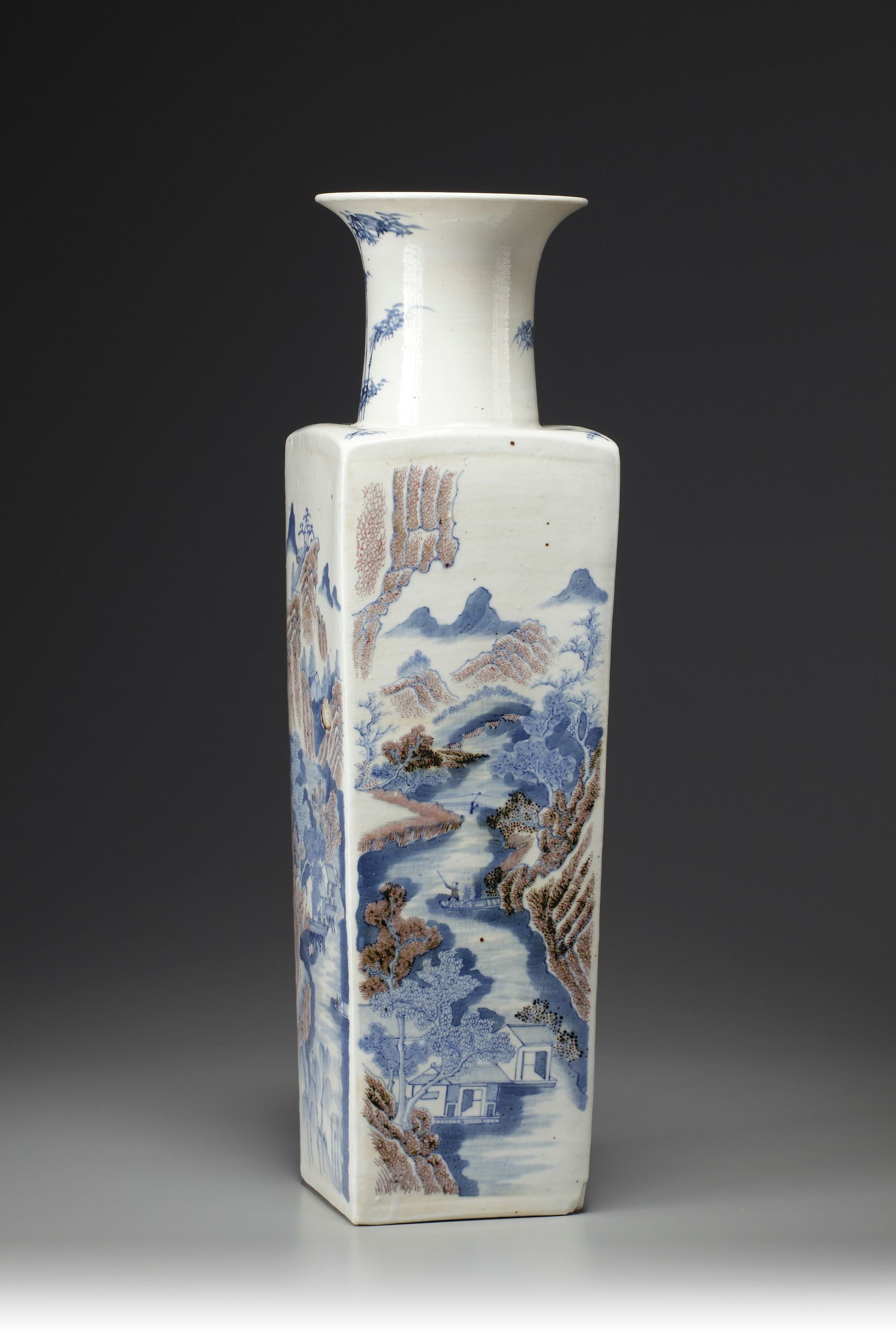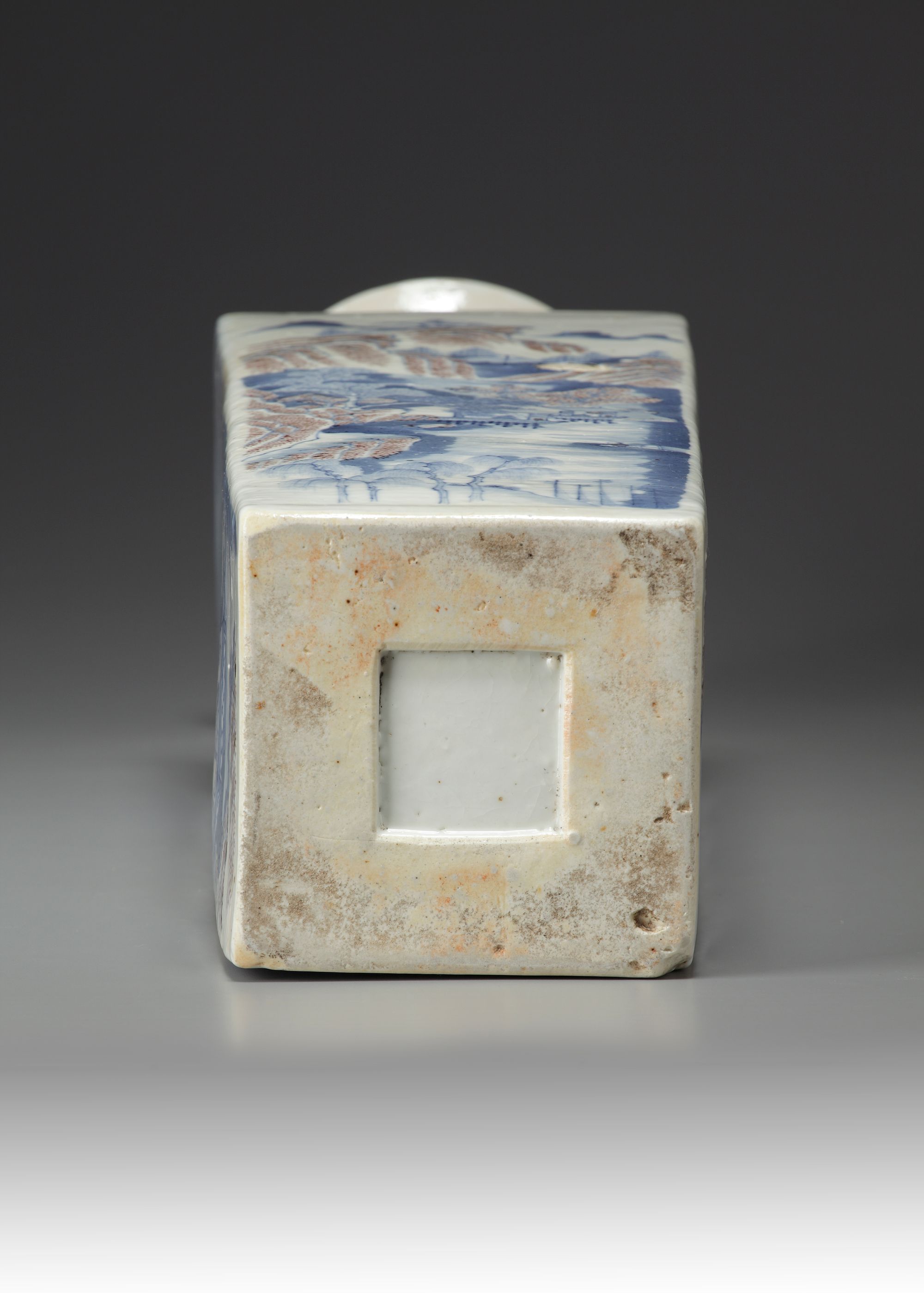 Each side decorated in underglaze blue and iron red depicting a mountainous river landscape.