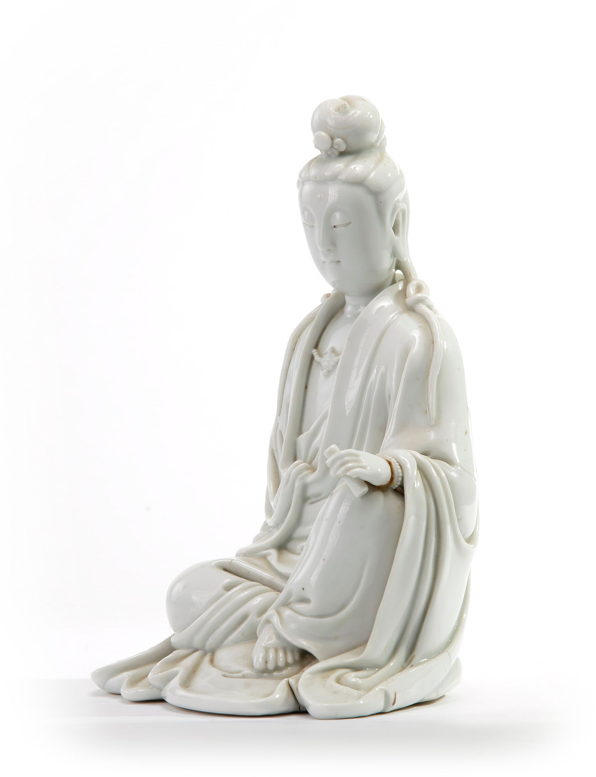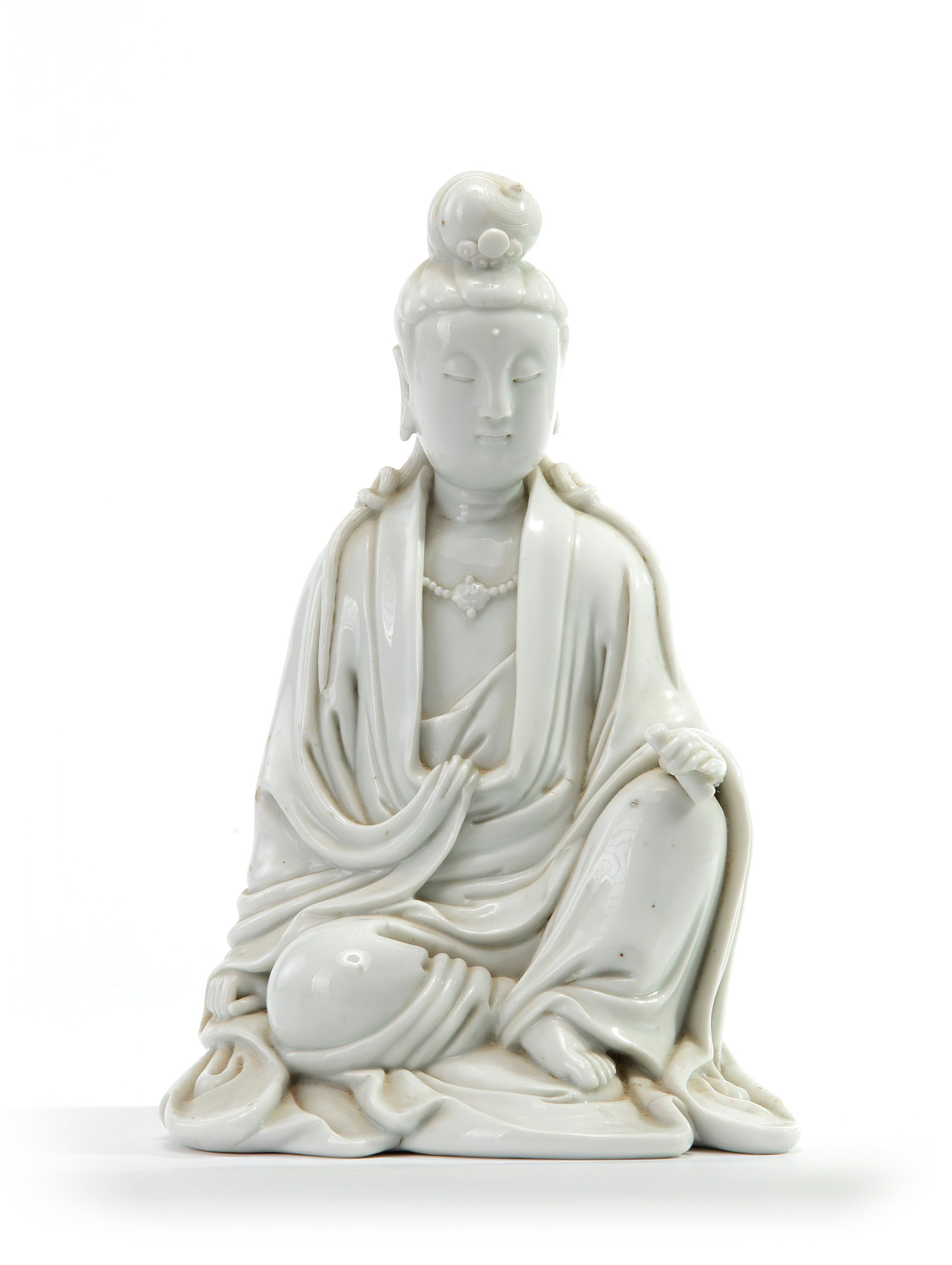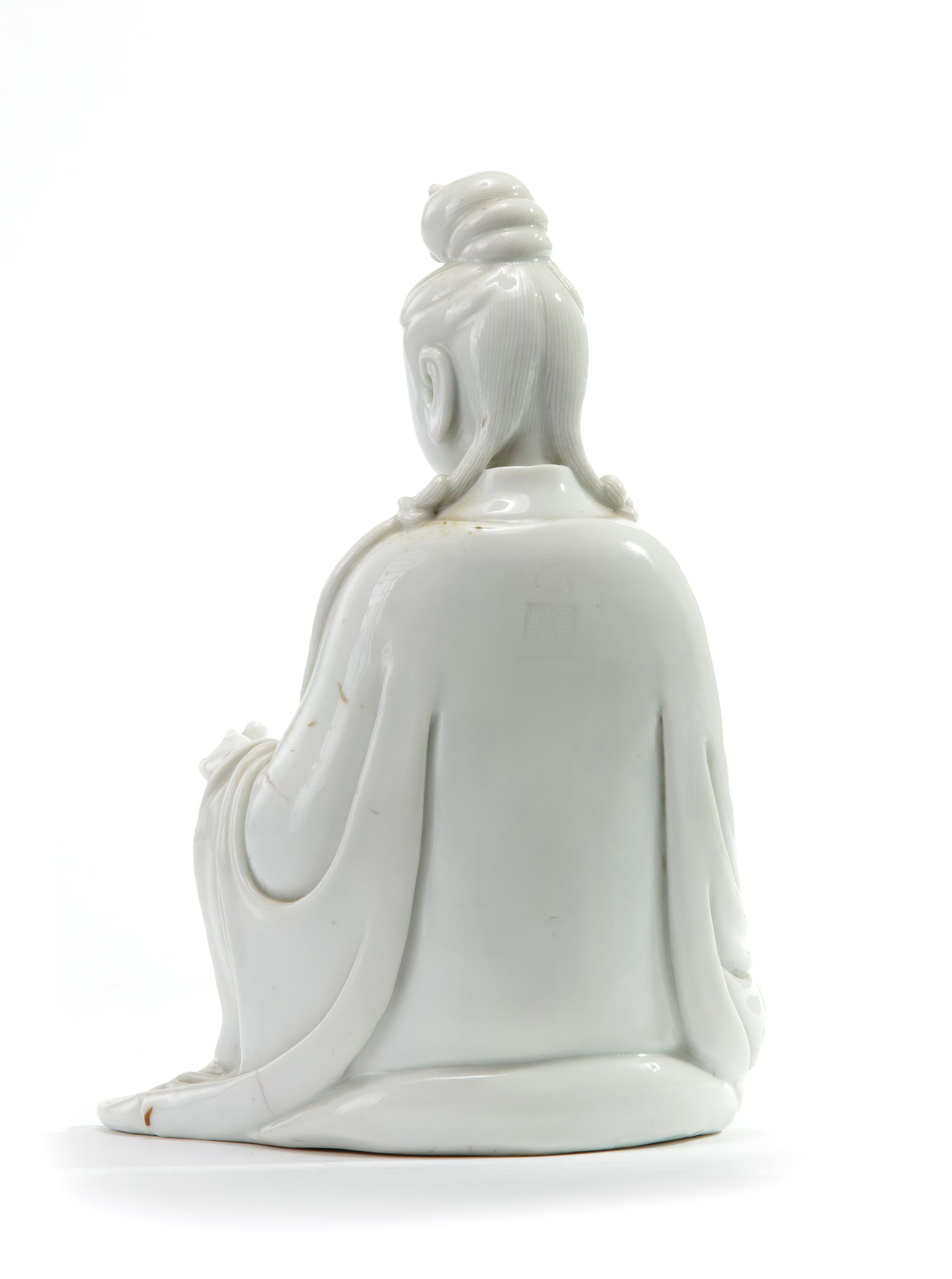 The Goddess of Mercy is modelled with a serene expression and downcast eyes below her hair tied in a topknot and in two sections on either shoulder. She wears long robes slightly open at the front to reveal a beaded necklace with a double ruyi-head pendant. She is seated in Royal Ease with her left hand holding a scroll. The reverse is stamped with a shaped seal mark reading 'De Yin' and a seal mark reading 'jin feng' which may be translated as 'carefully sealed'.