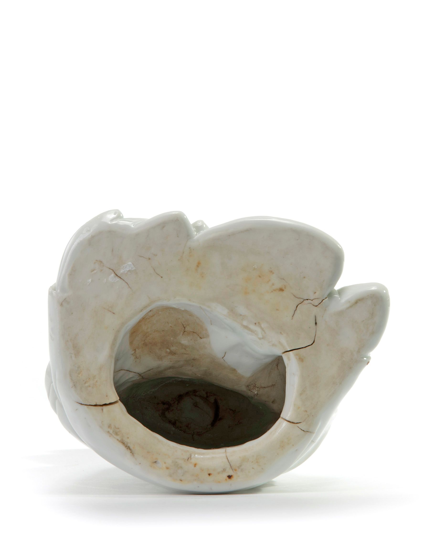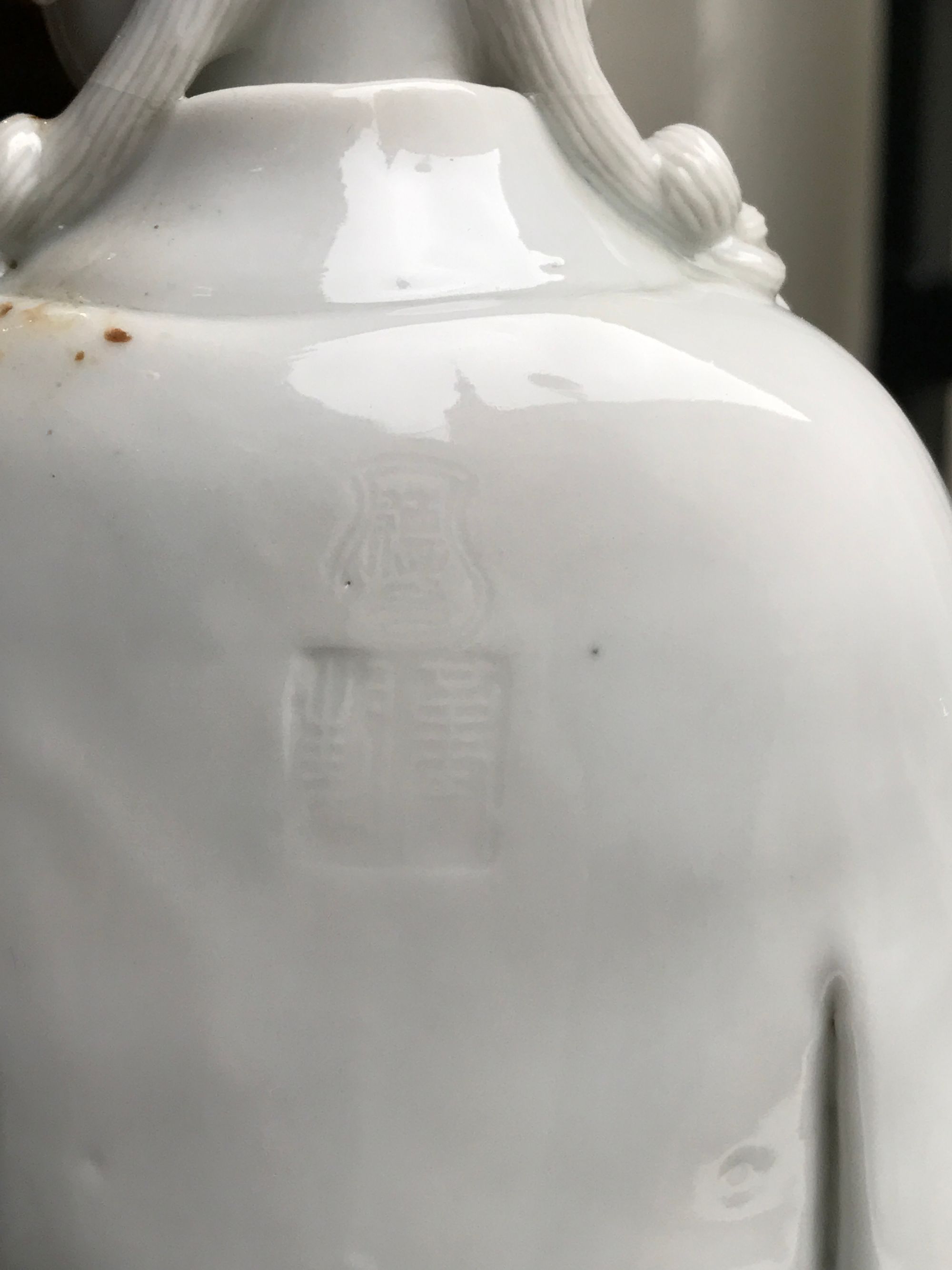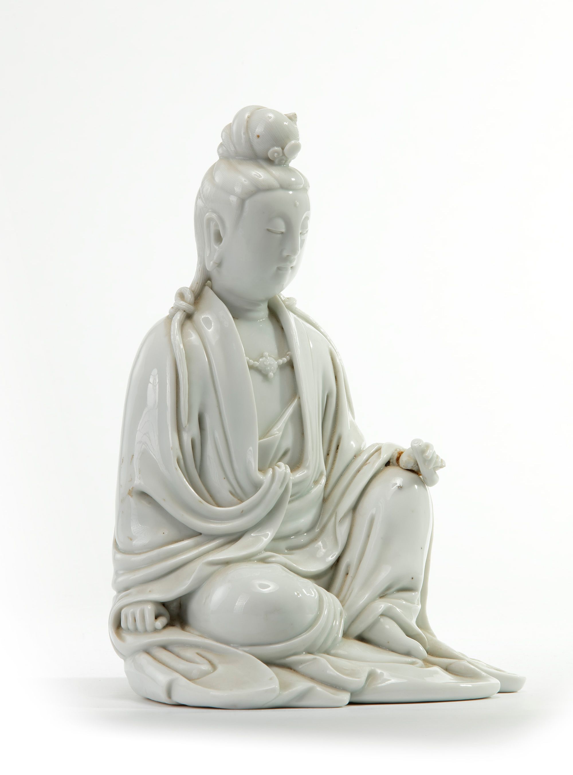 The Goddess of Mercy is modelled with a serene expression and downcast eyes below her hair tied in a topknot and in two sections on either shoulder. She wears long robes slightly open at the front to reveal a beaded necklace with a double ruyi-head pendant. She is seated in Royal Ease with her left hand holding a scroll. The reverse is stamped with a shaped seal mark reading 'De Yin' and a seal mark reading 'jin feng' which may be translated as 'carefully sealed'.