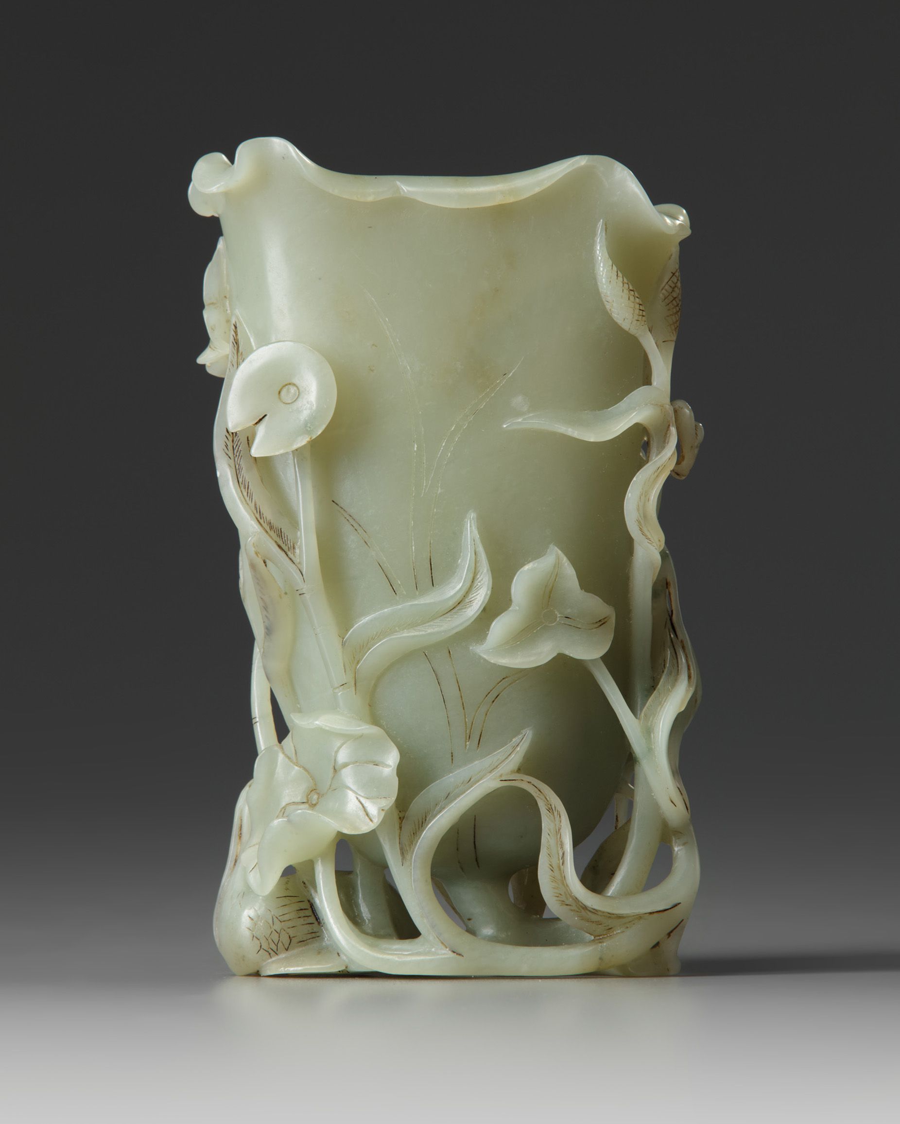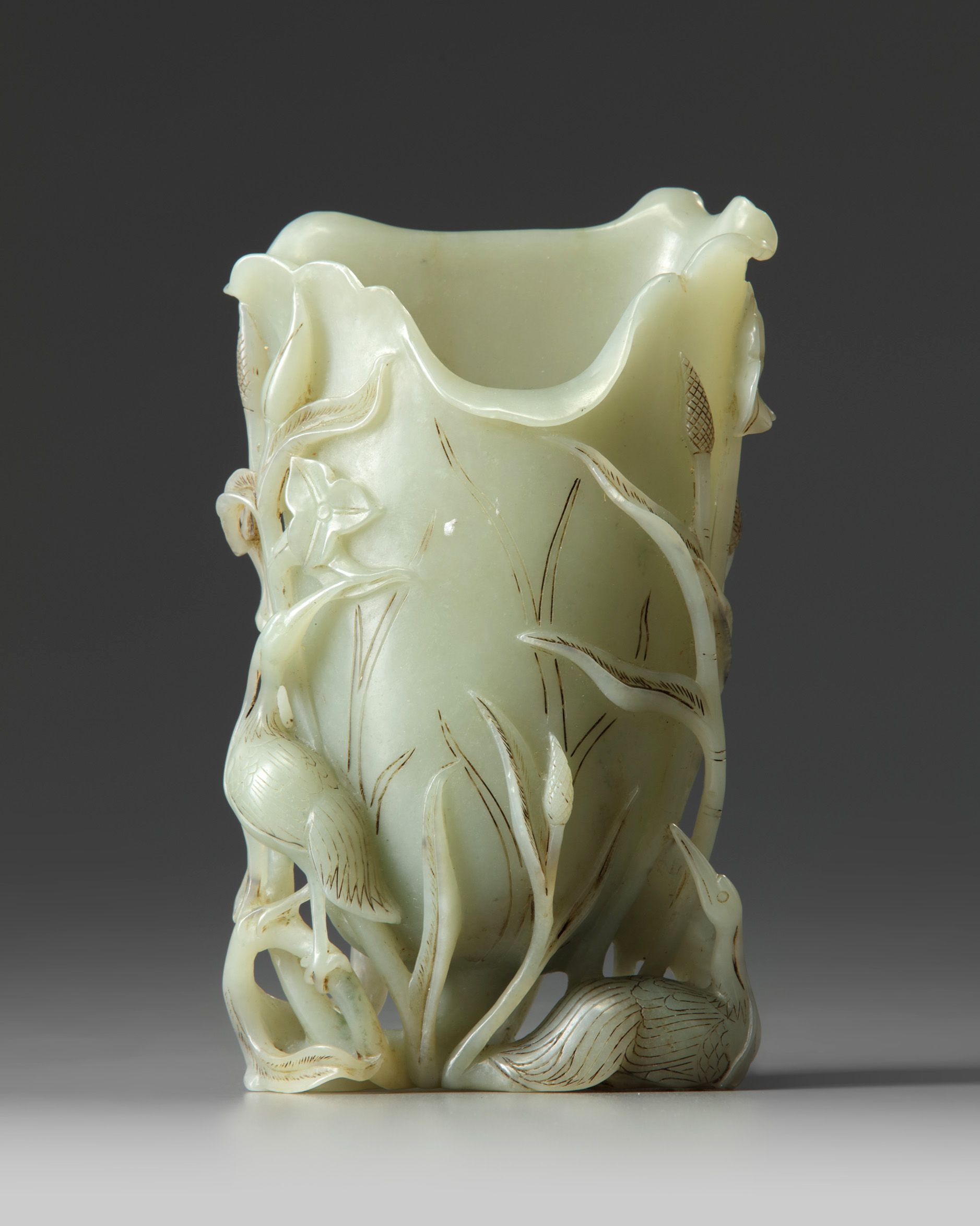 The vase is carved as a large upturned lotus leaf, with the edges of the leaves turned in and outwards, all beside cranes and openwork waterweeds. The stone is of an even celadon tone.
