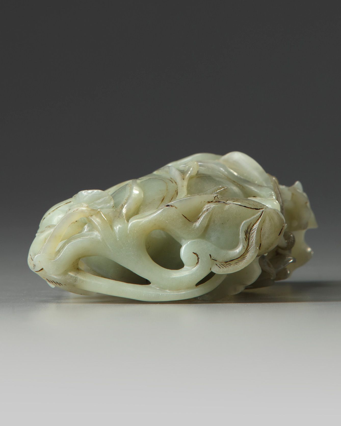 A Chinese celadon jade ‘crane and lotus’ spill vase