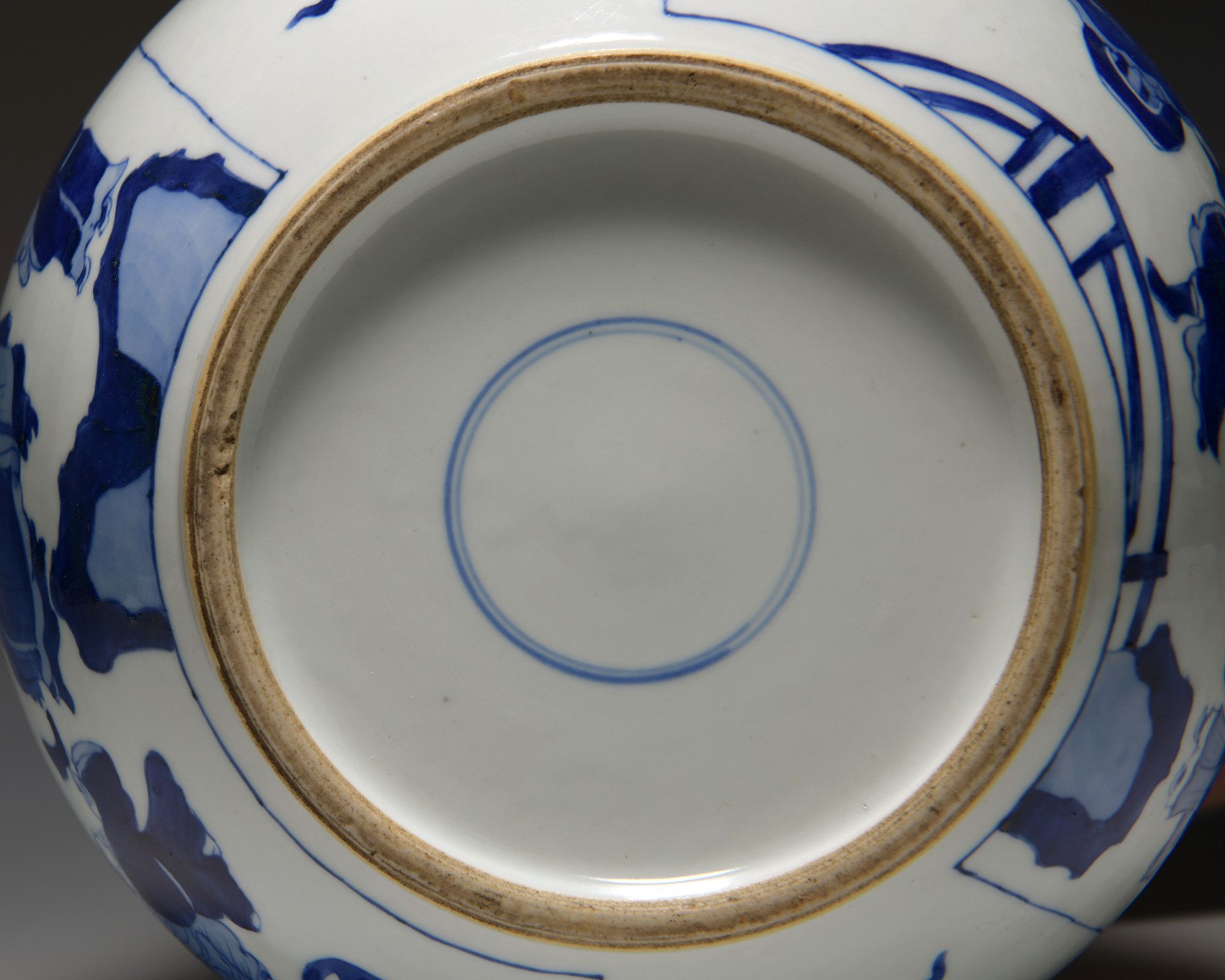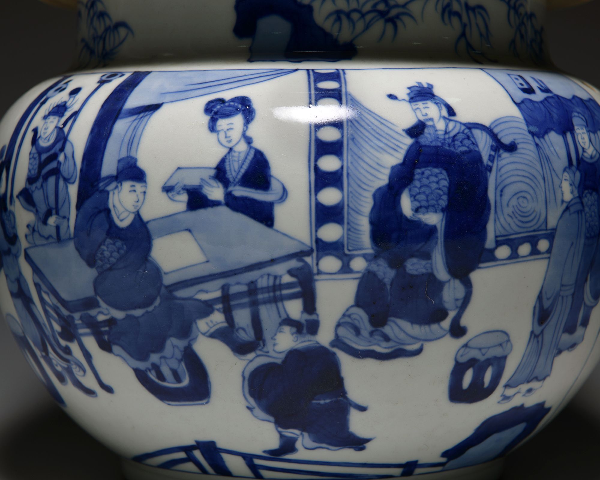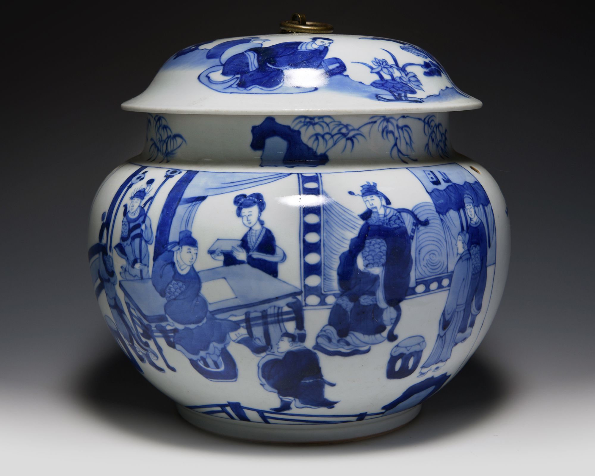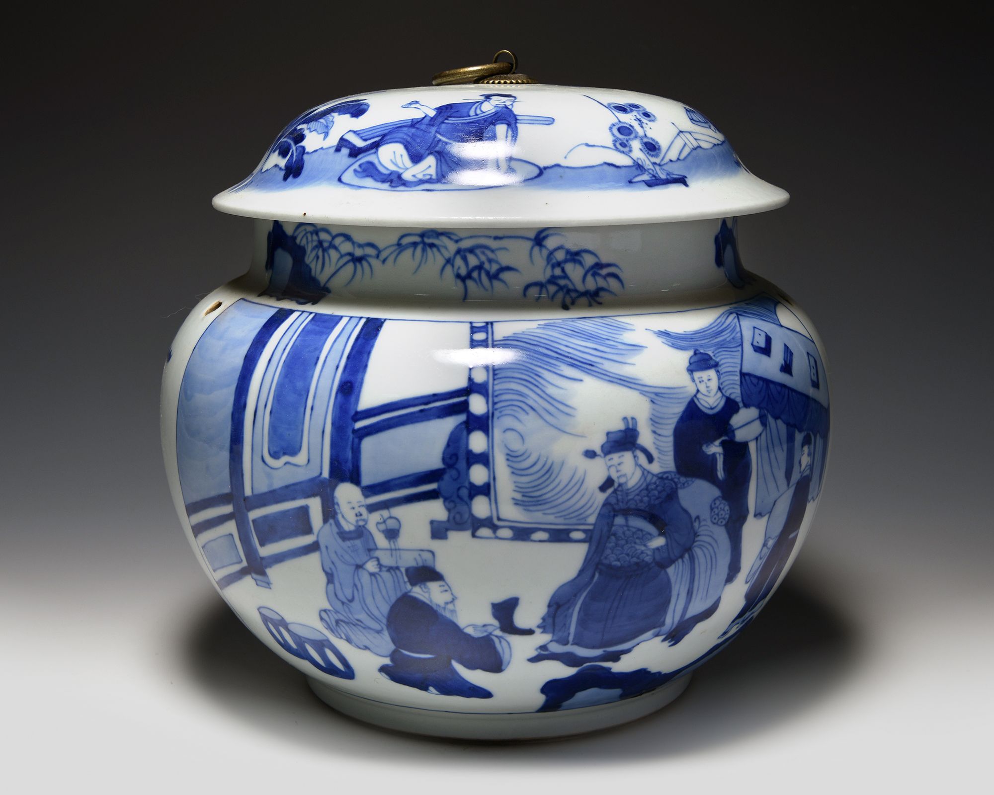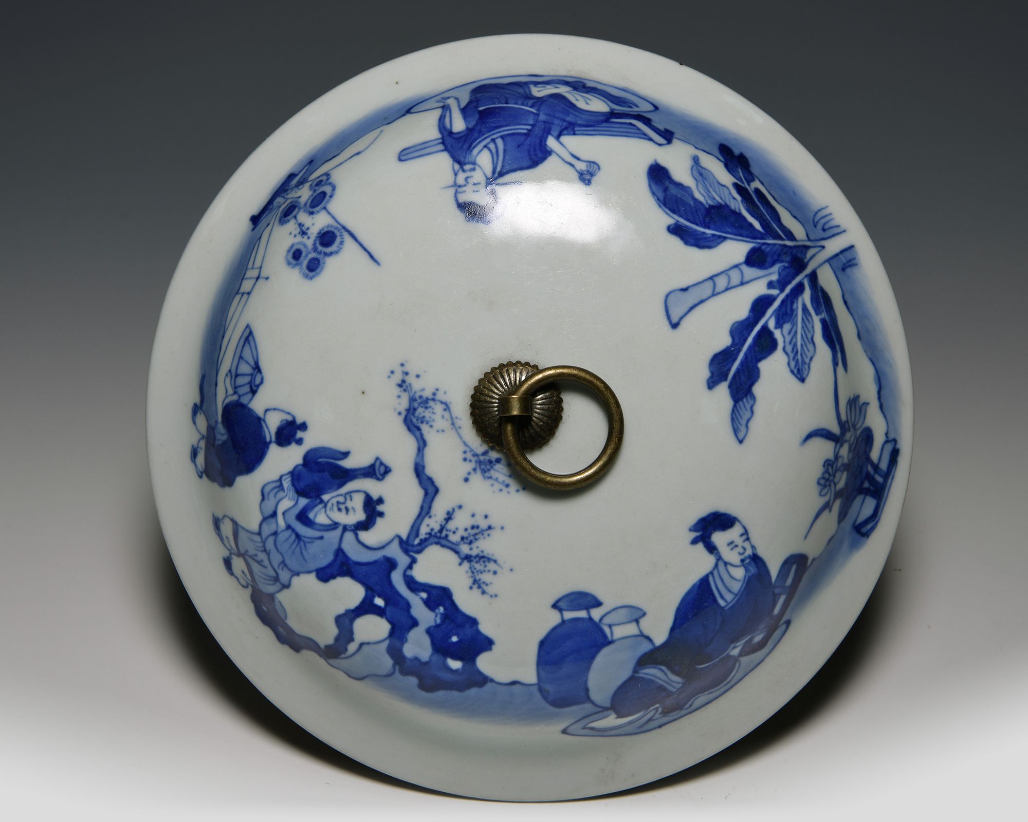 A Chinese porcelain pot decorated with two panels enclosing a dignitary served presents with attendants and servants, further stylised with jars knotted with ribbons and flower sprays. The cover painted with seated scholars and kids in a fenced garden. 19.5 cm. height, 21 cm. width