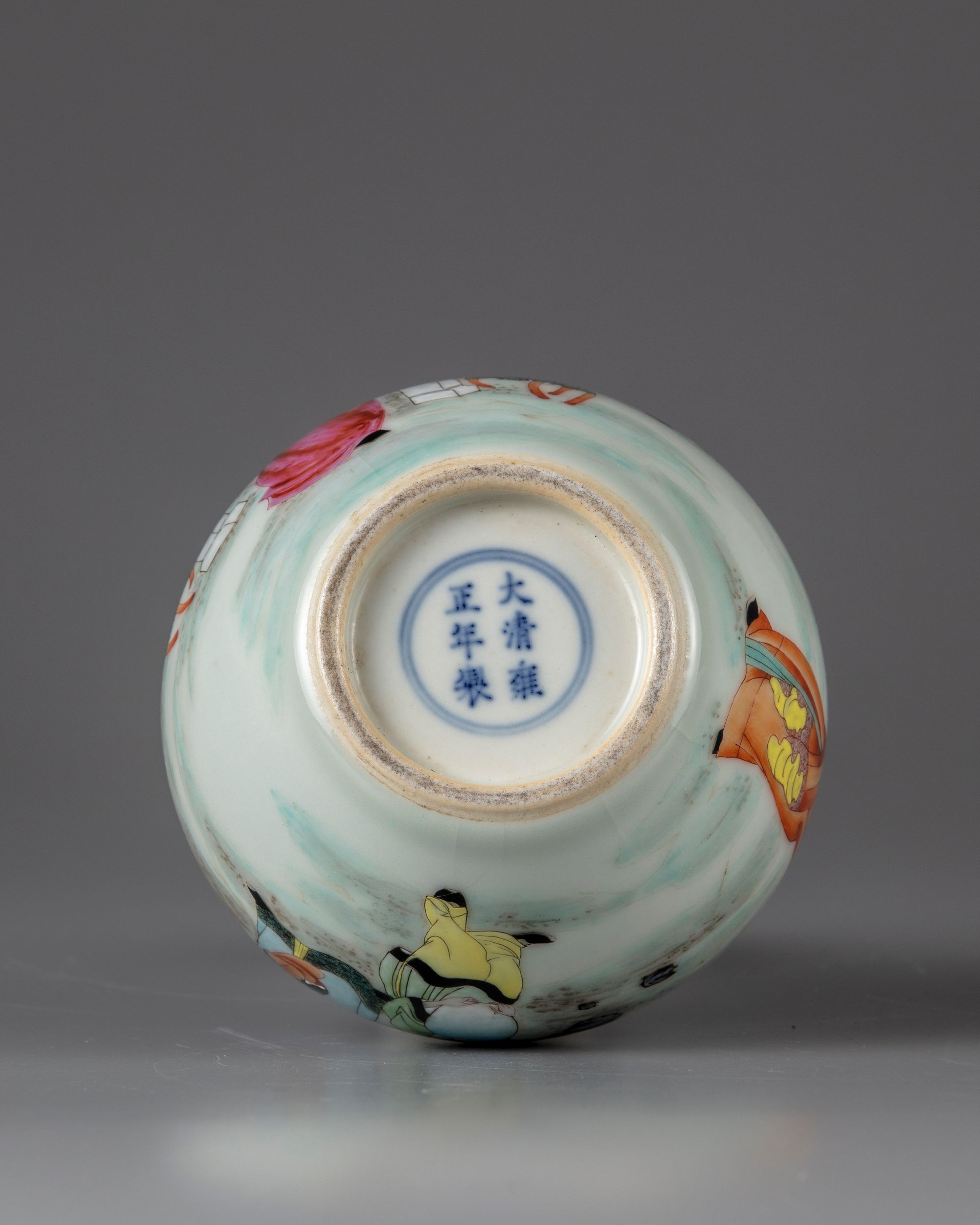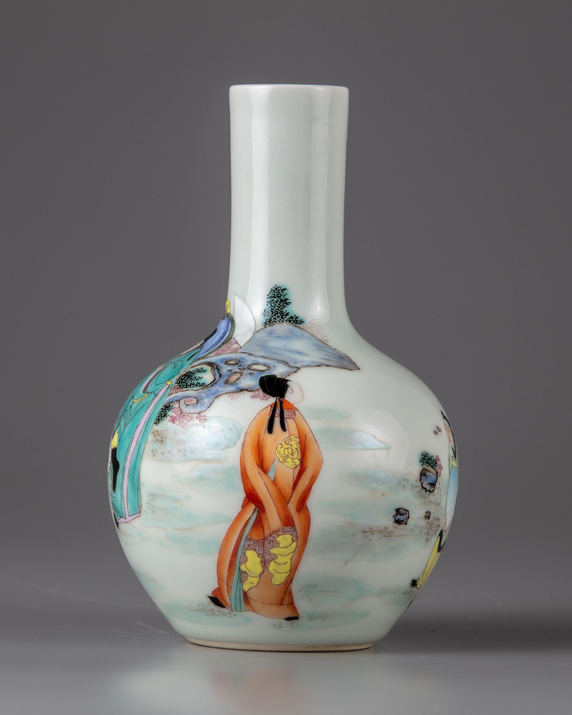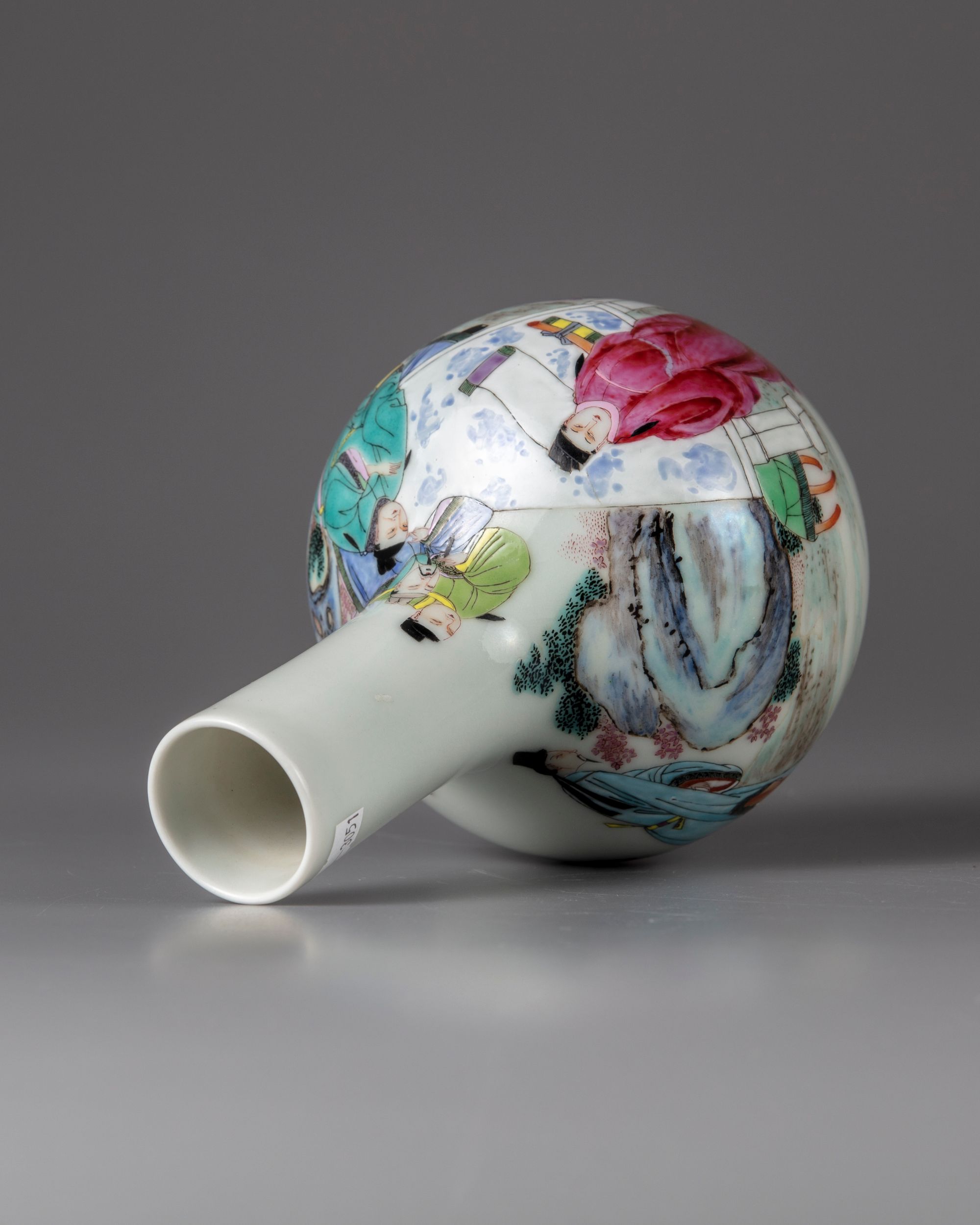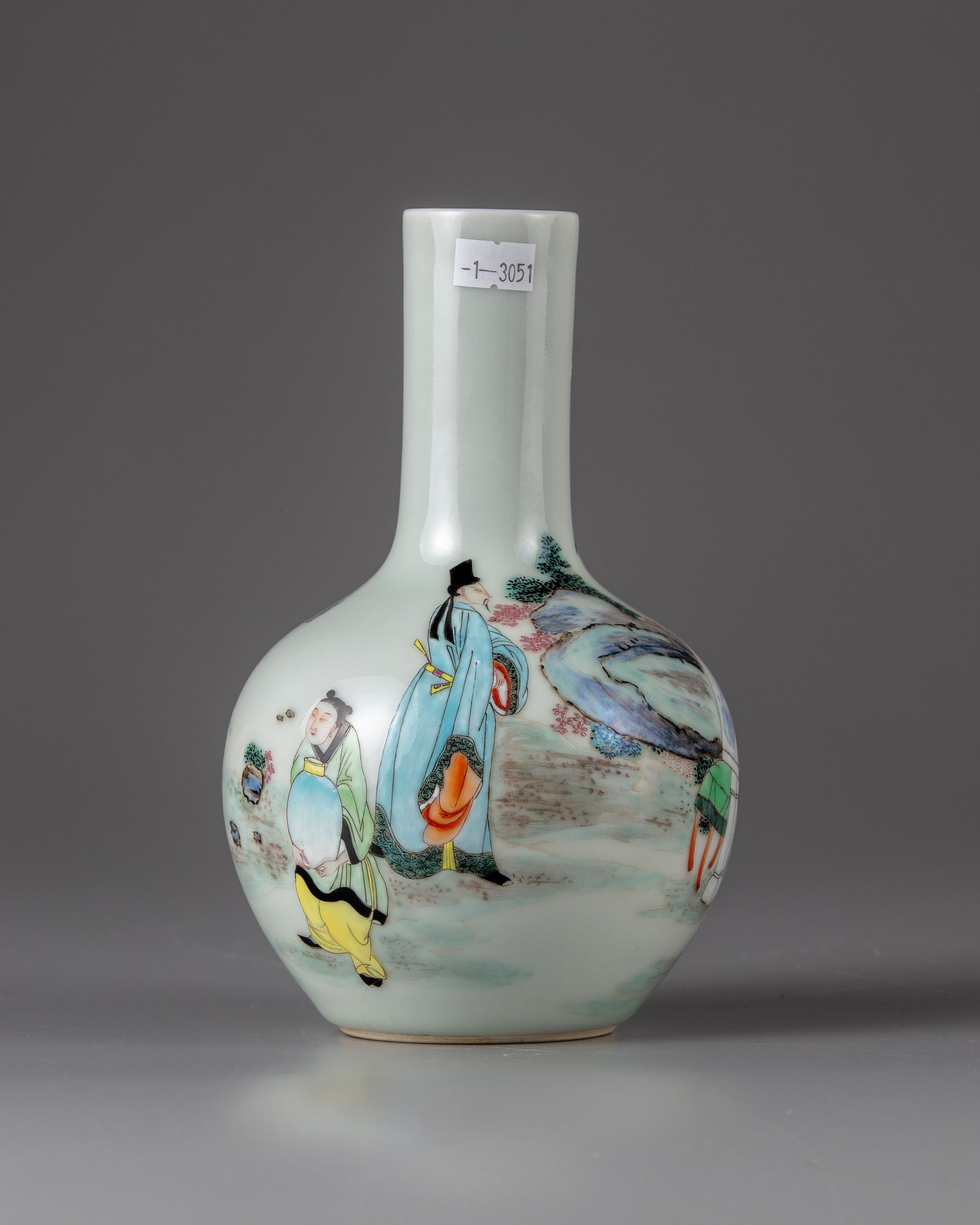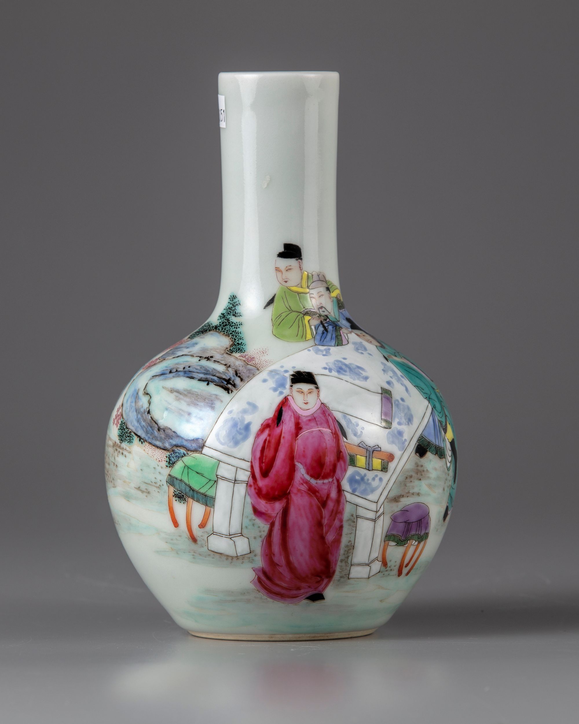 The vase is decorated in colourful enamels with figures studying a scroll on a table with attendants beside a rock work. With a Yongzheng six character mark to the bottom within a double circle.