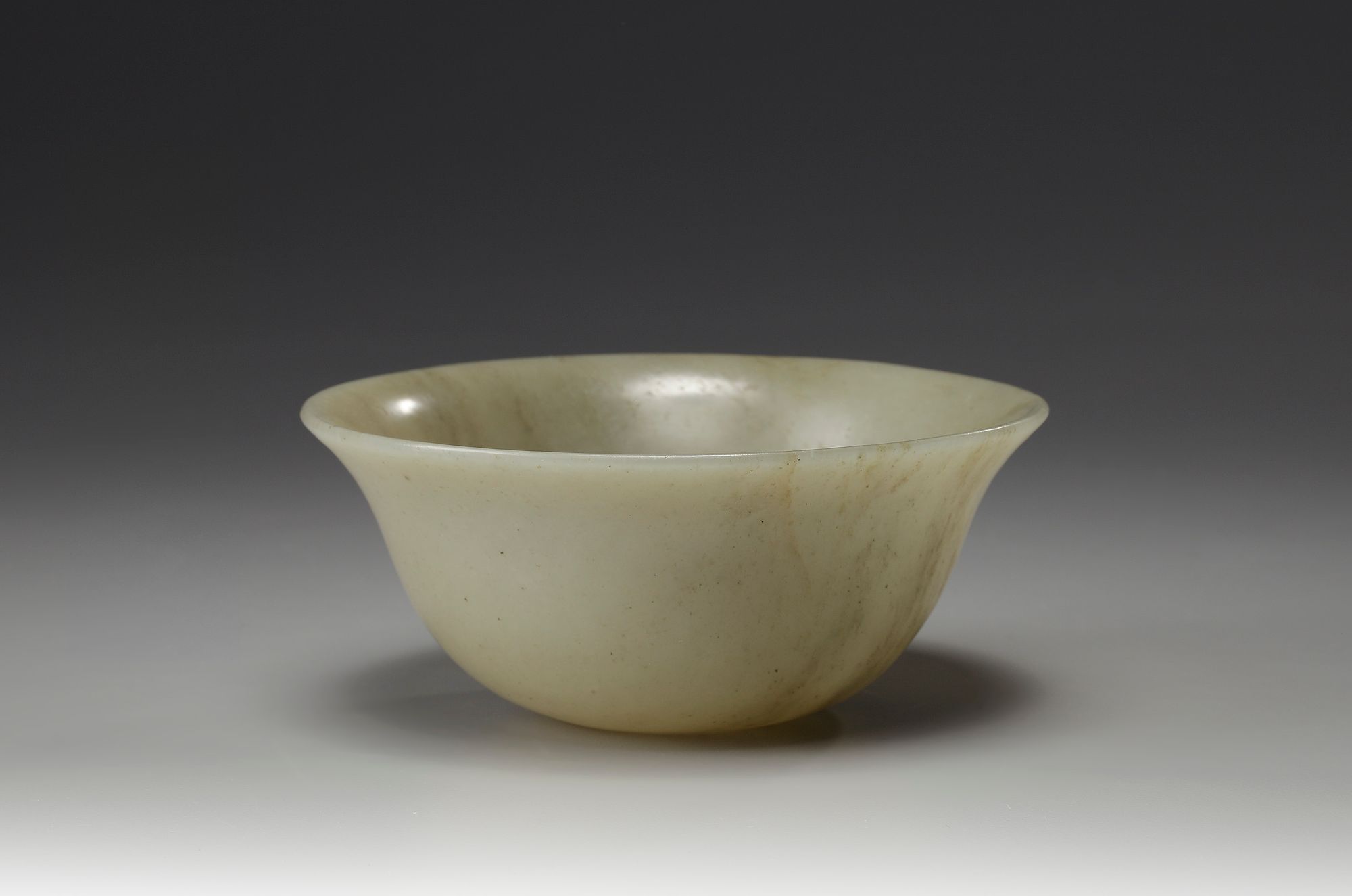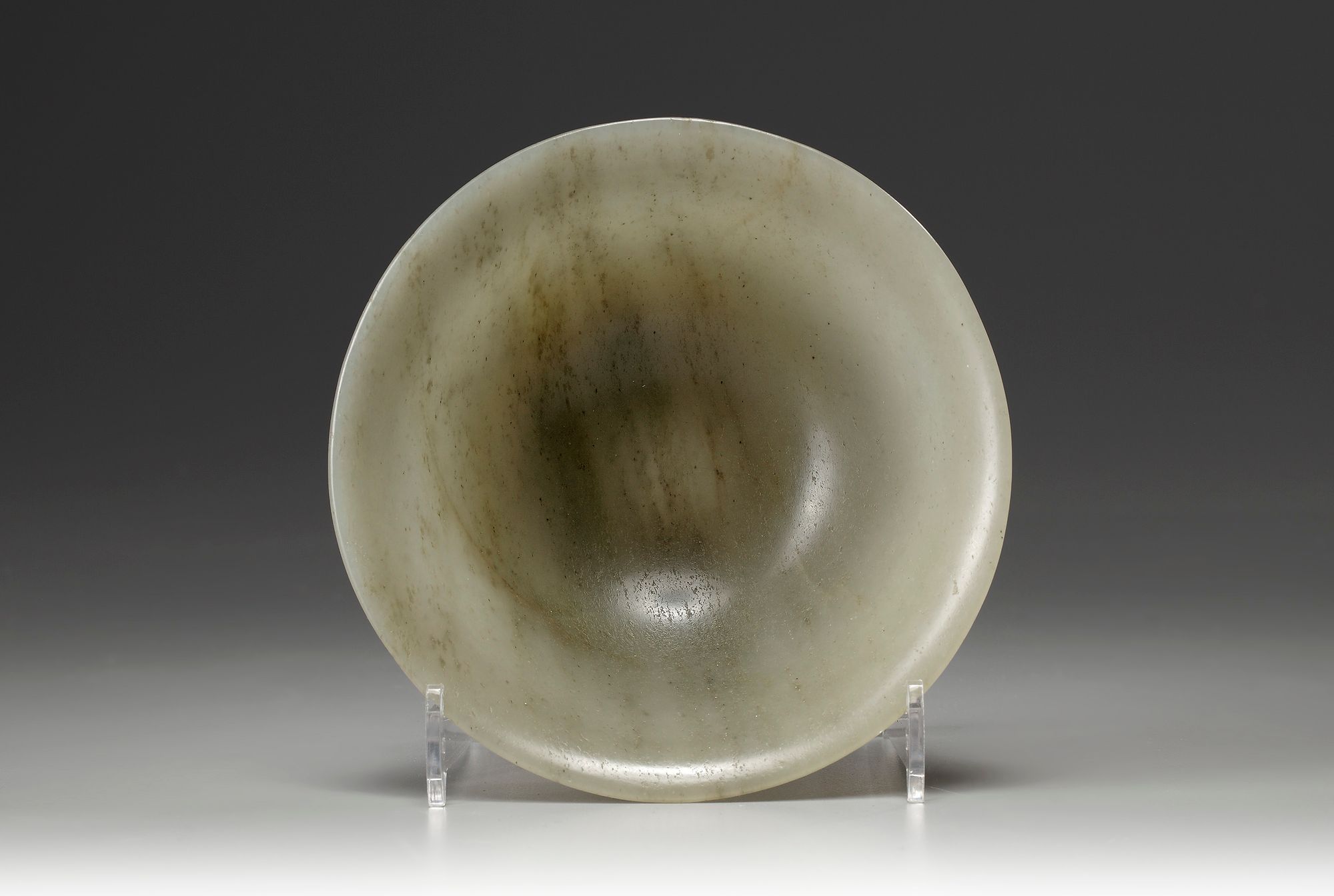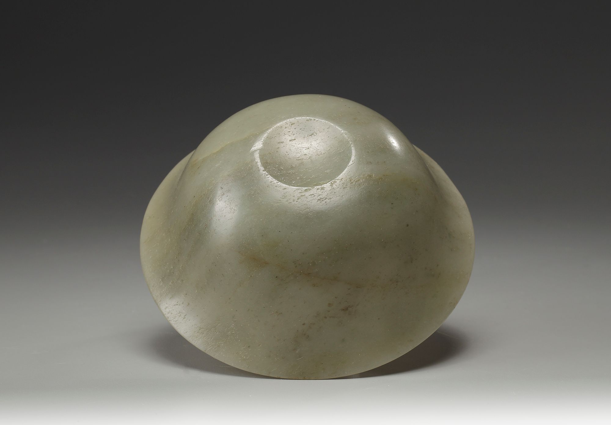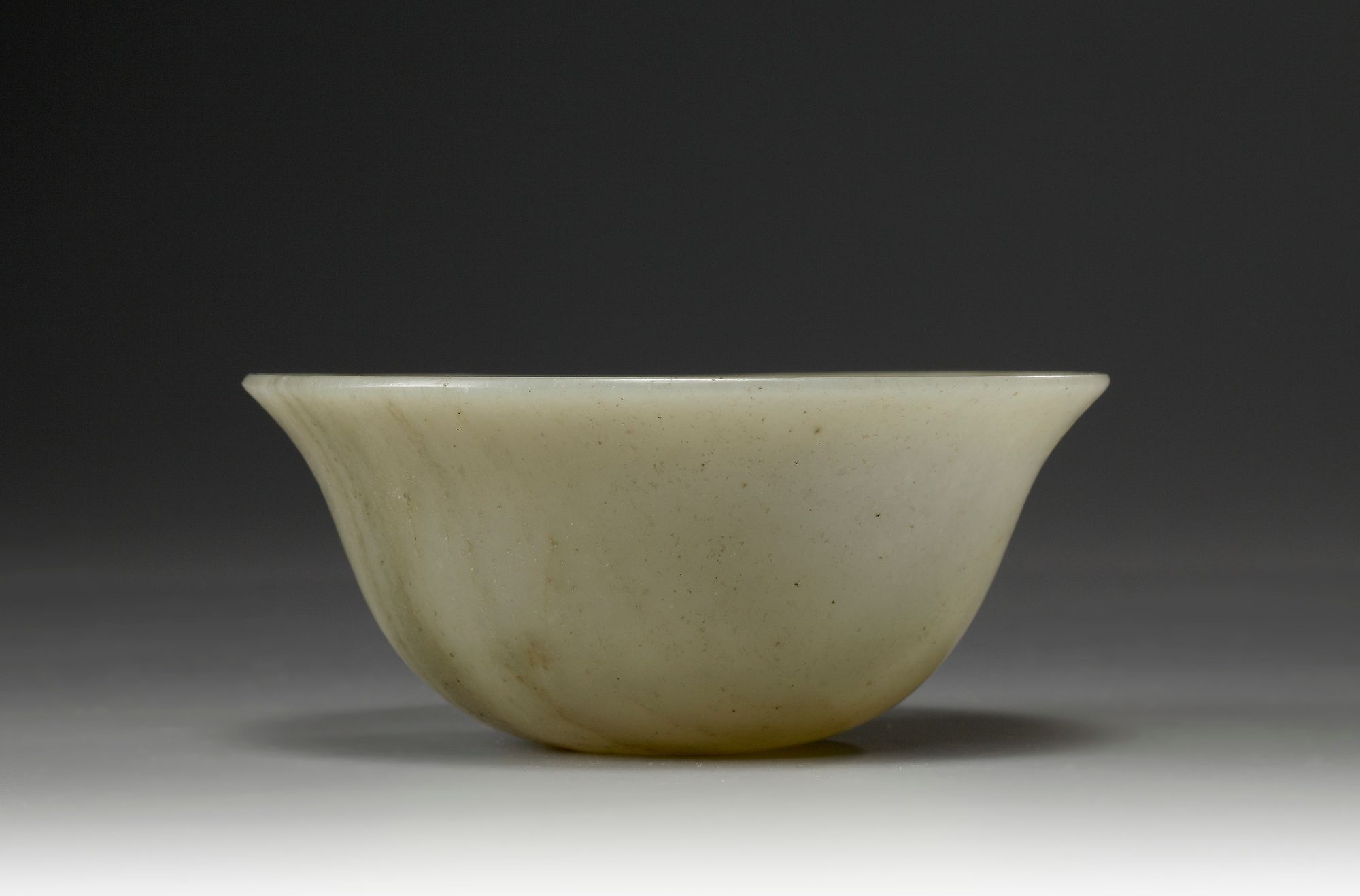 The bowl is of rounded form with a slightly flared rim. The stone is of a greyish green tone.