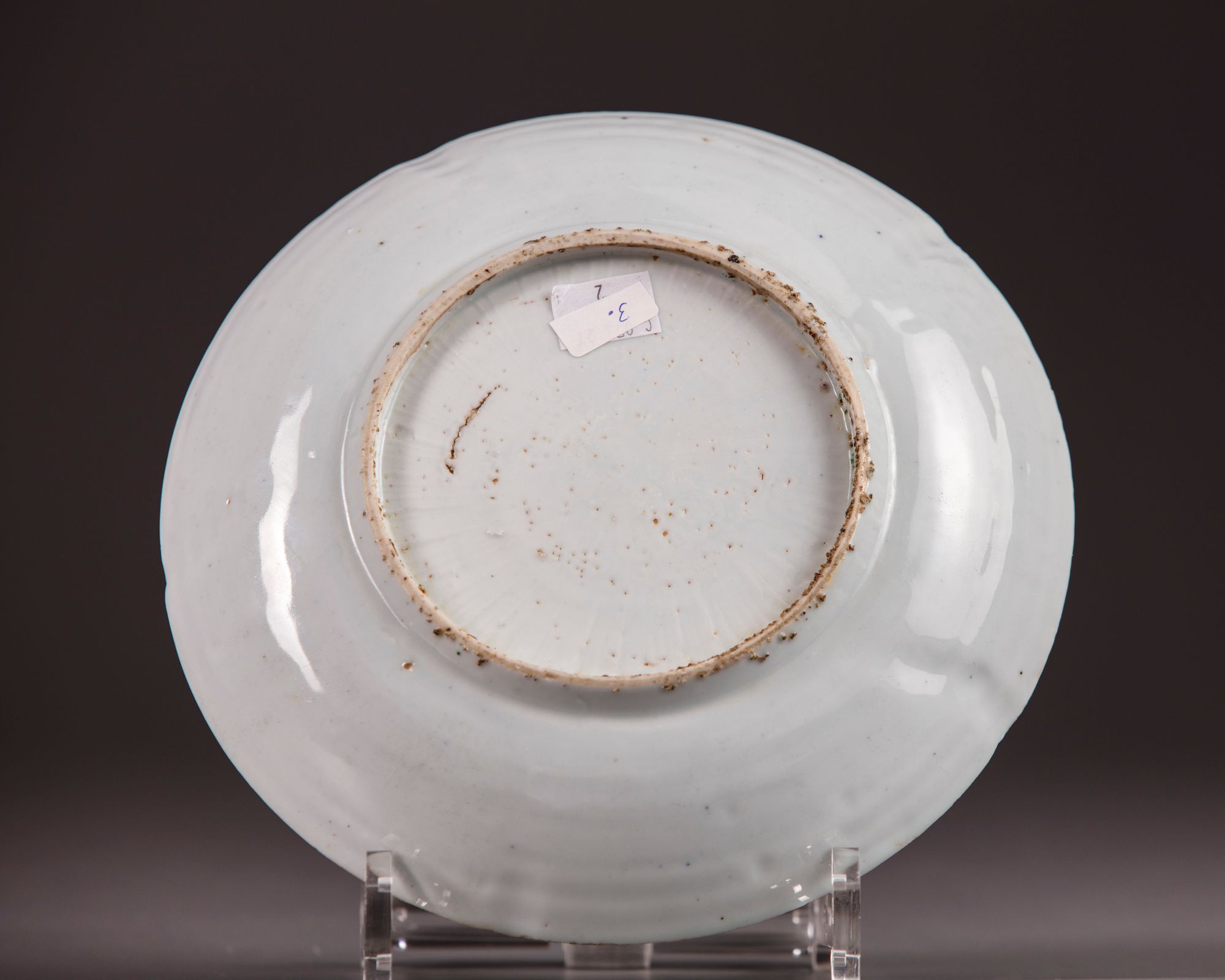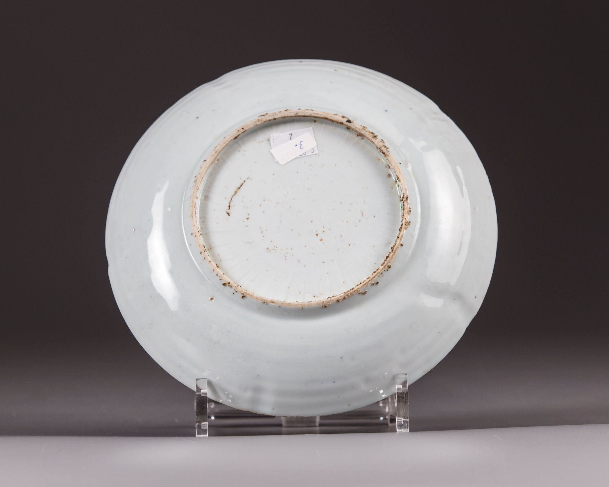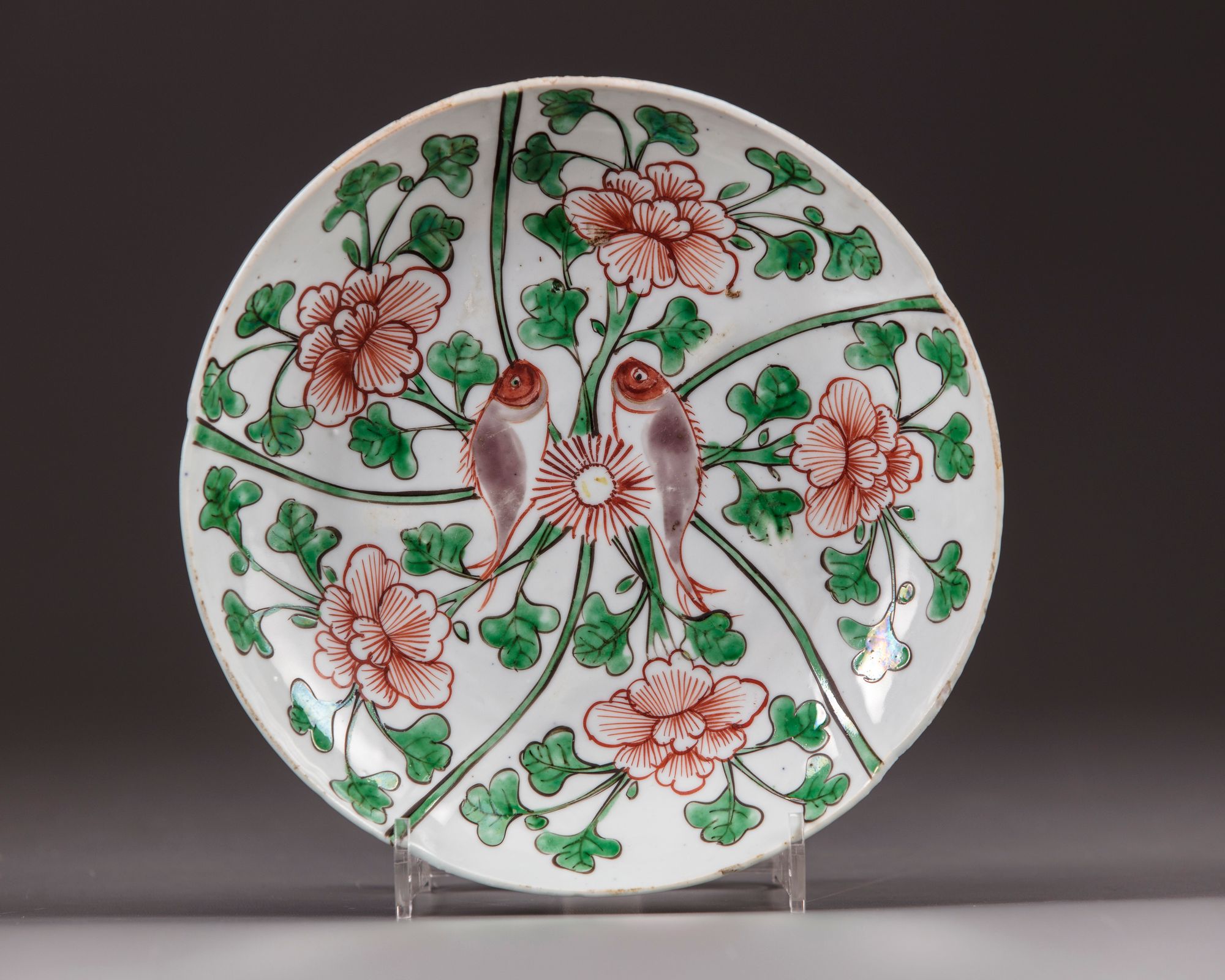 The dish is decorated with moulded panels twin fishes to the center with peony sprays radiating from the center to the rim.