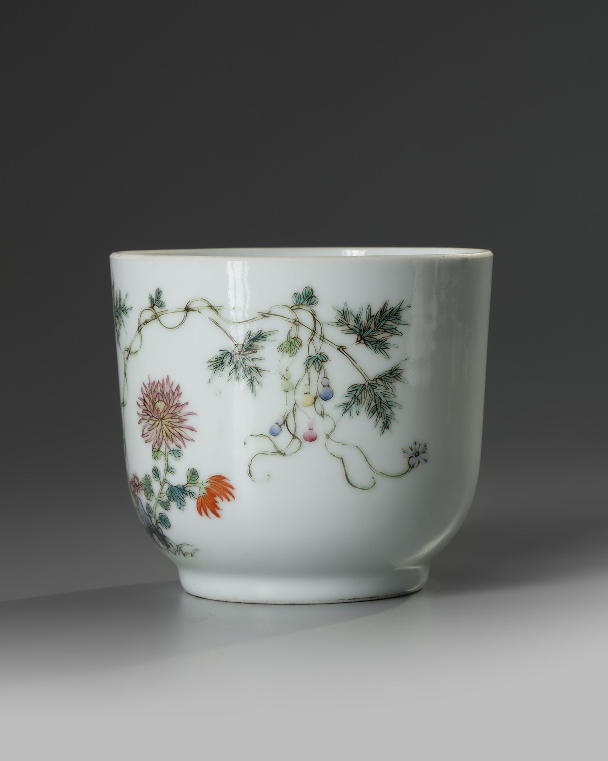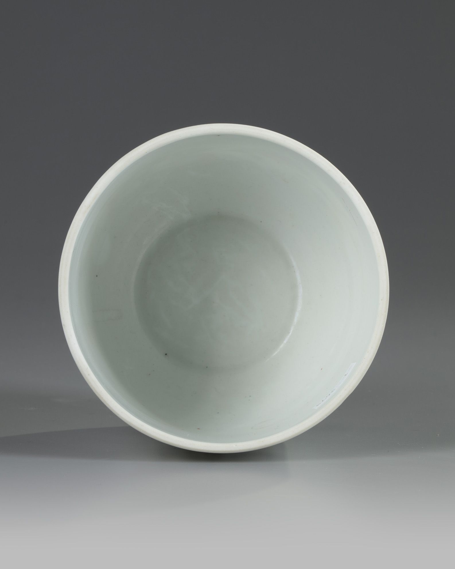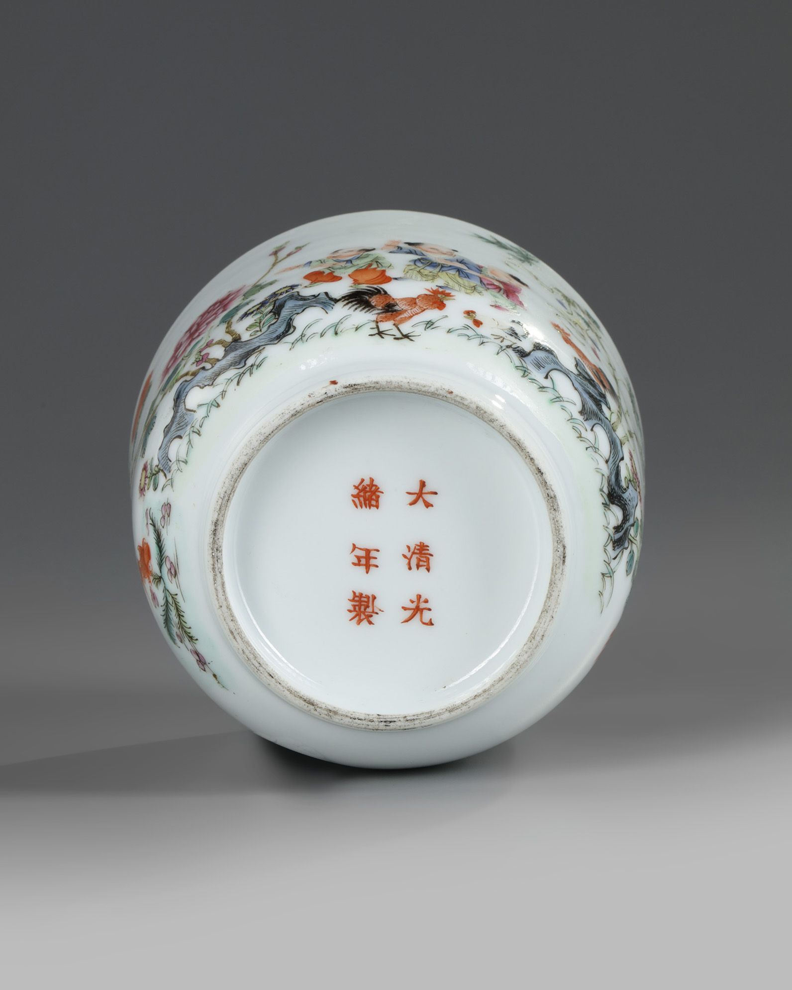 The bowl is decorated with a scene of three boys at play amongst roosters, beside blossoming peonies and bamboo shoots. The base with a Guangxu six-character mark in iron red.