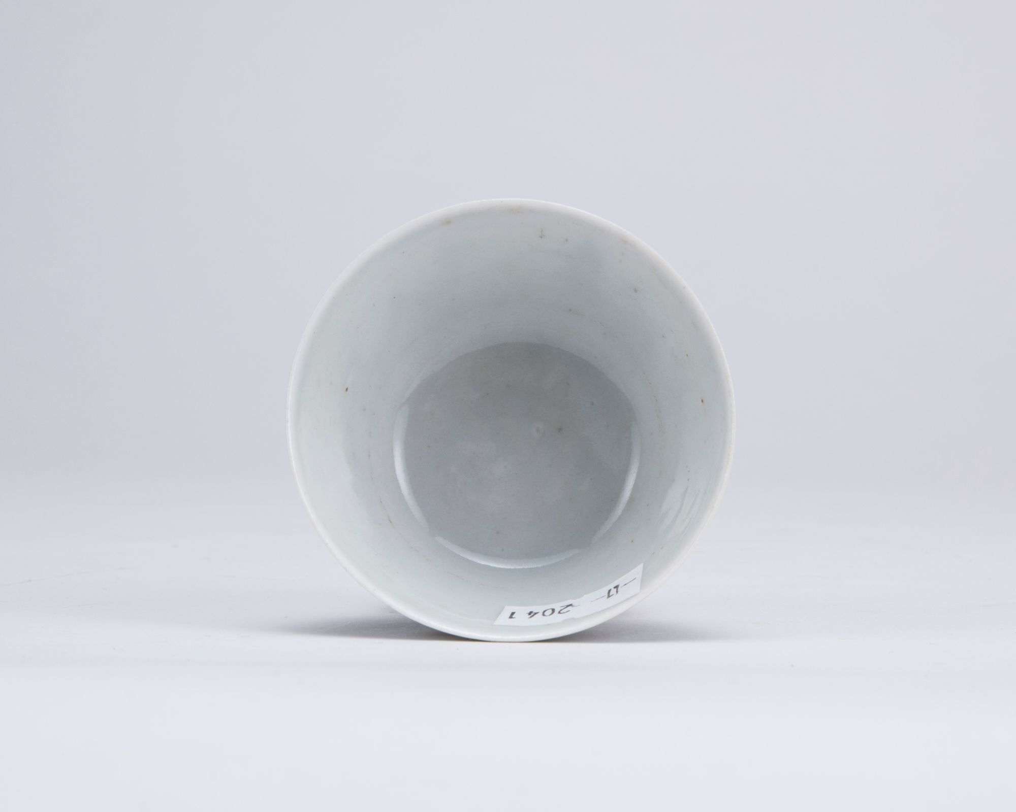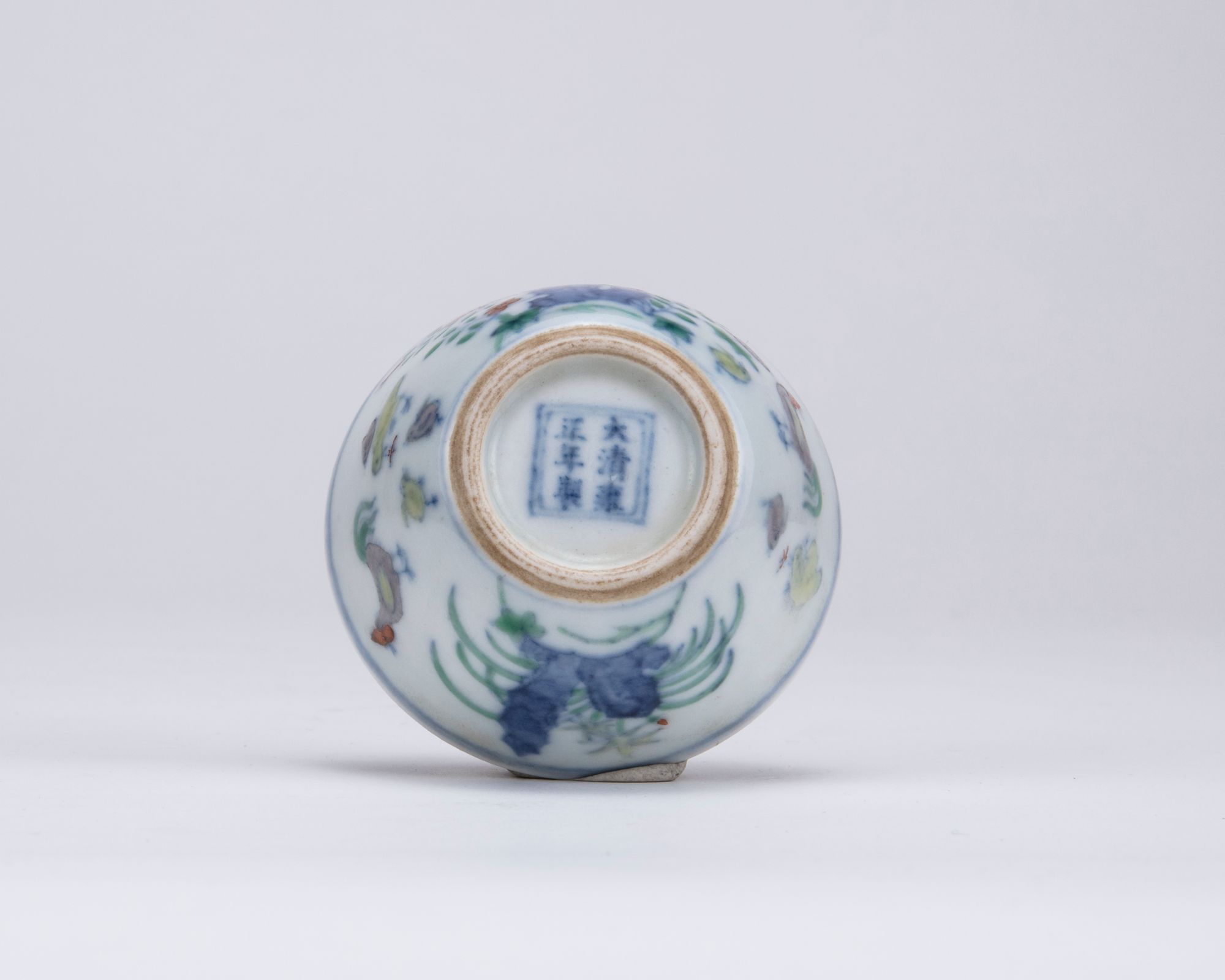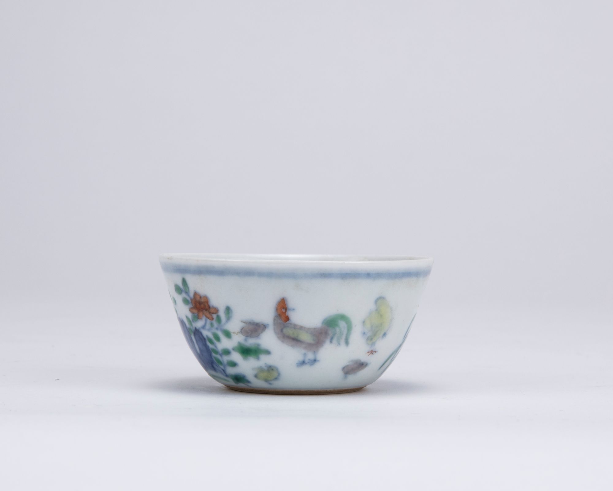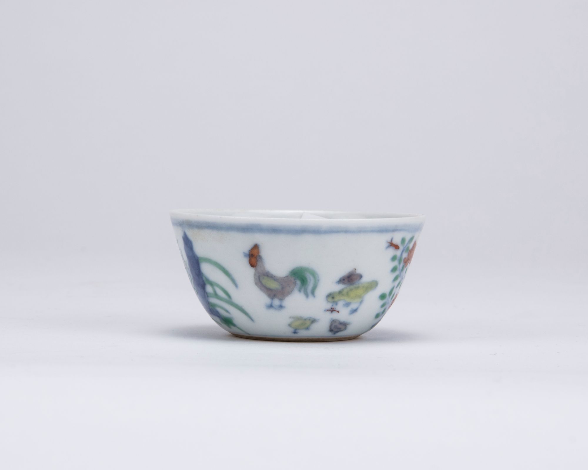 The cup is decorated in doucai style with underglaze blue washes and outlines and overglaze green, red, yellow, and brown enamels, the exterior is decorated with a rooster, hen and chicks amongst lilies and peony shrubs behind rocks. There is an apocryphal Yongzheng mark on the base.