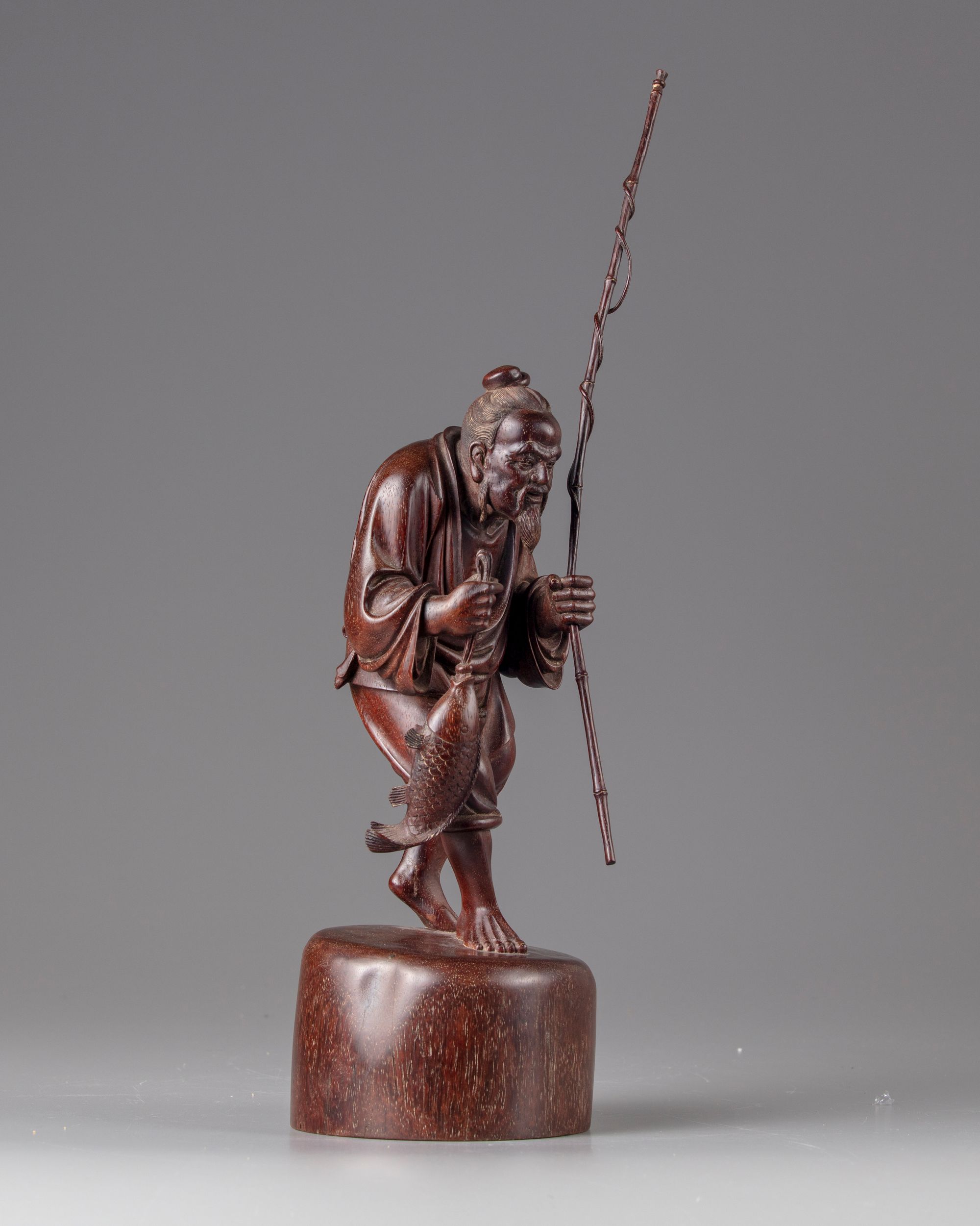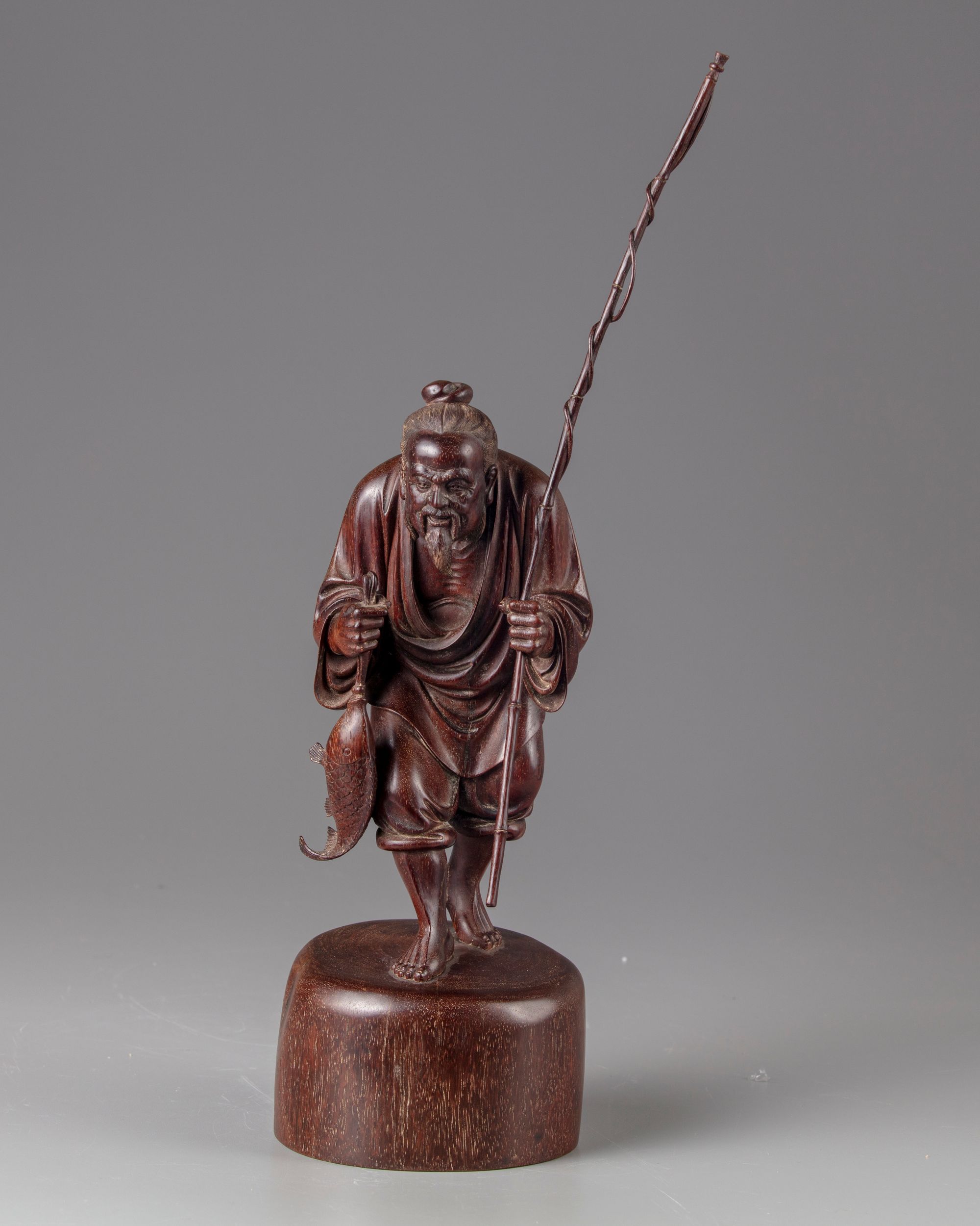 The figure is carved standing, holding a fish is his hand with a fish hook in the other hand ,wearing robes till his knees and his hair in a knot. On a large wooden stand A height of 42.50 cm measured to the top of the separate rod. A height of 29.50 cm of the figure itself without the rod.