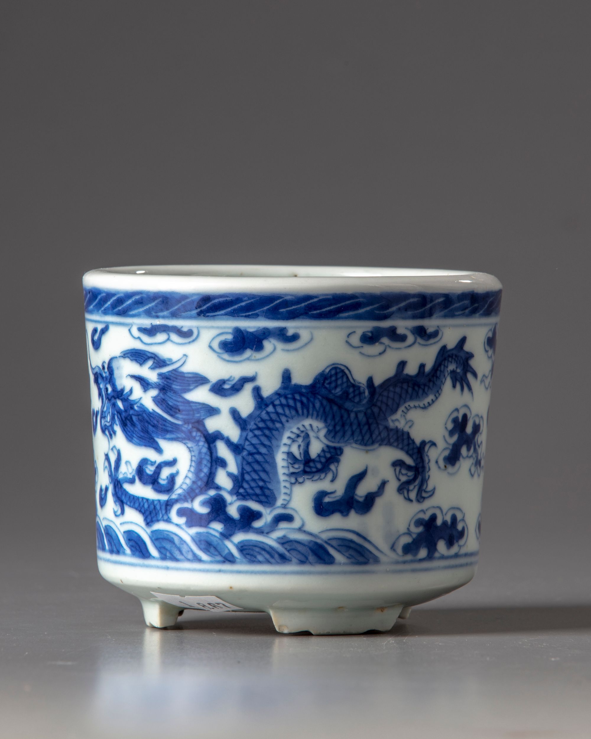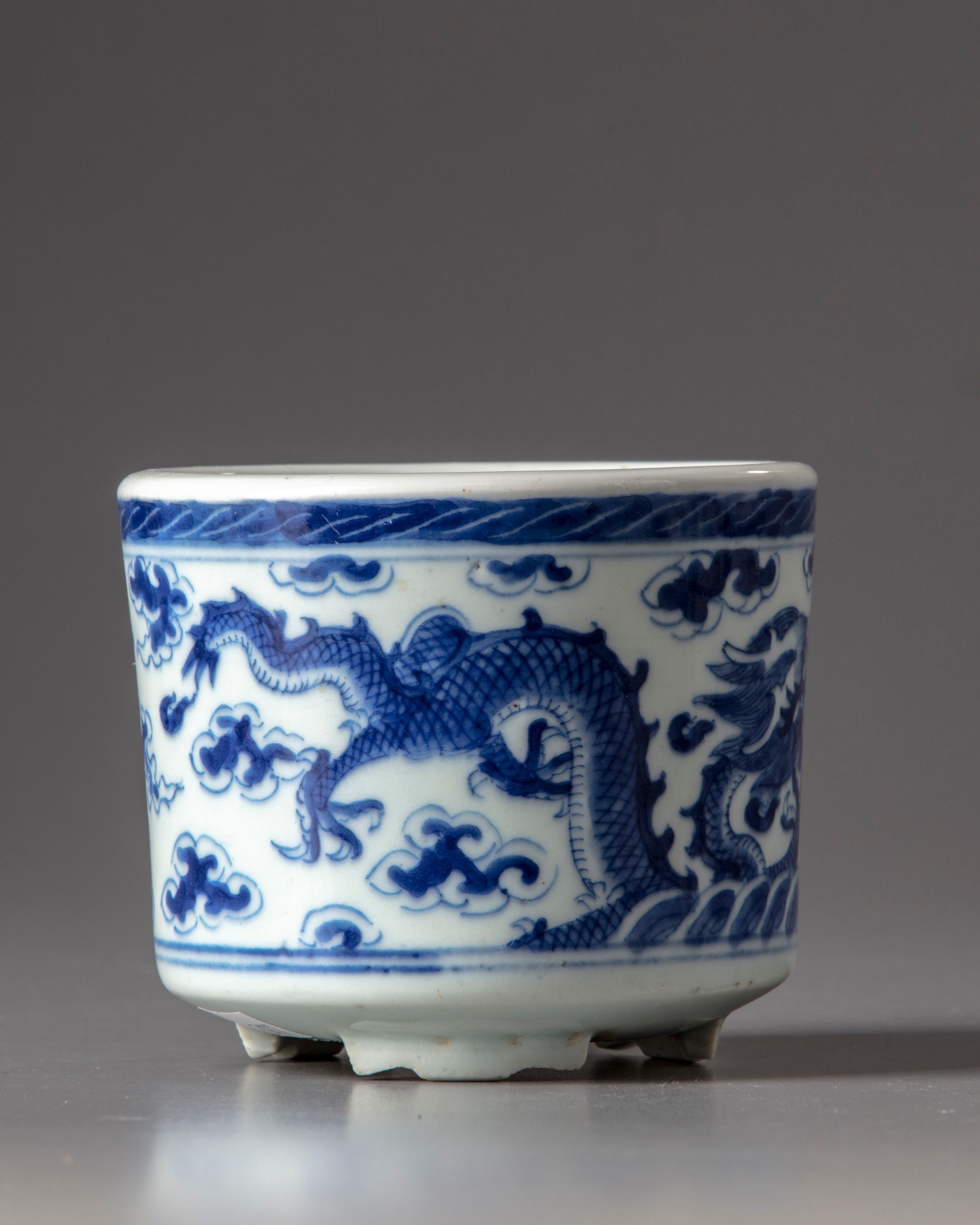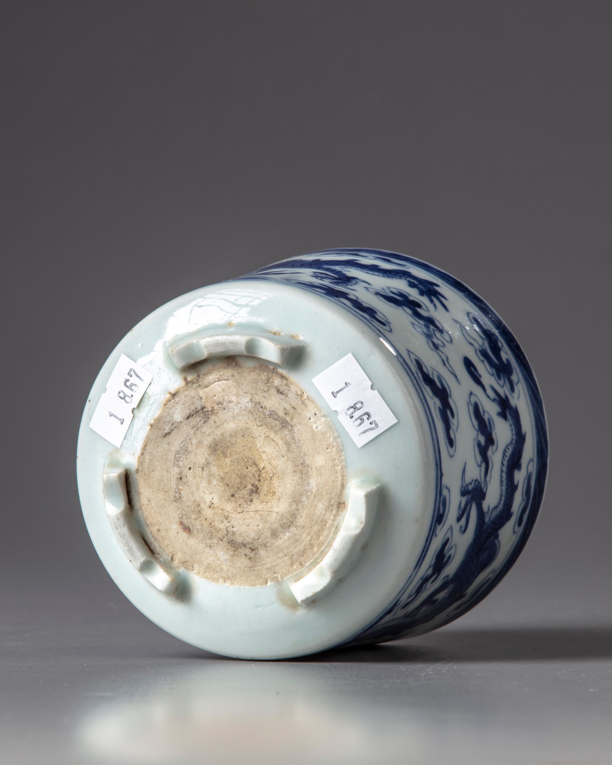 Decorated in underglaze blue with two four-clawed dragons chasing the flaming pearl. Height: 9 cm. Diameter: 10.5 cm.