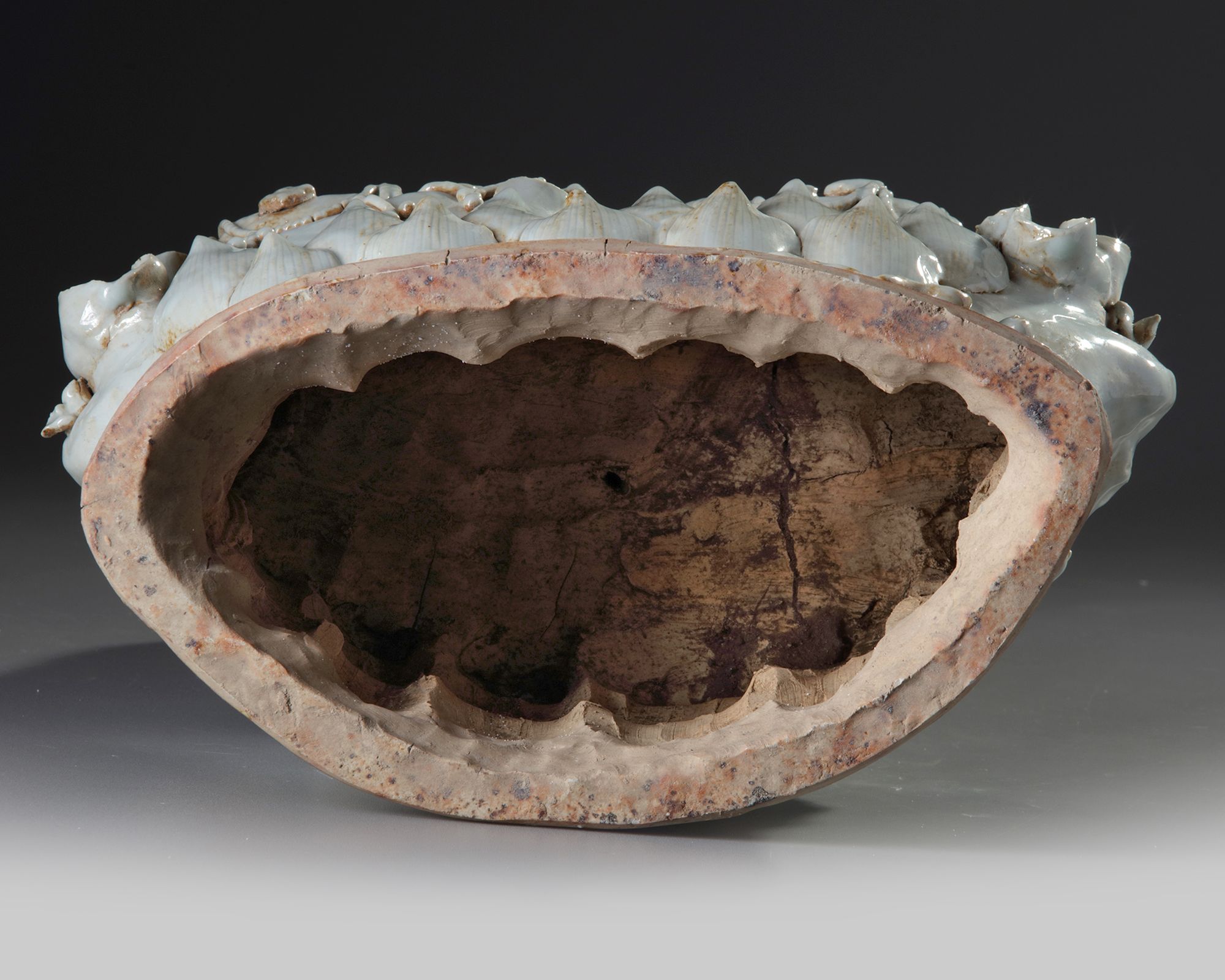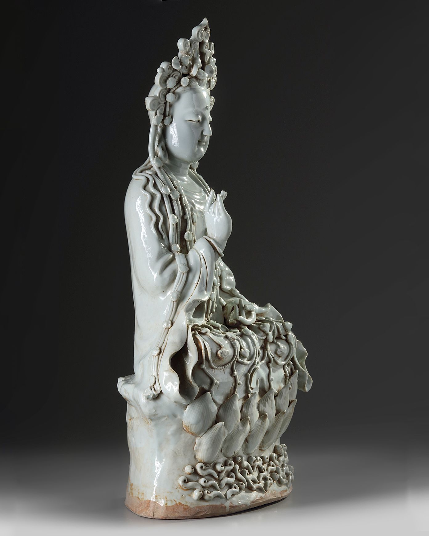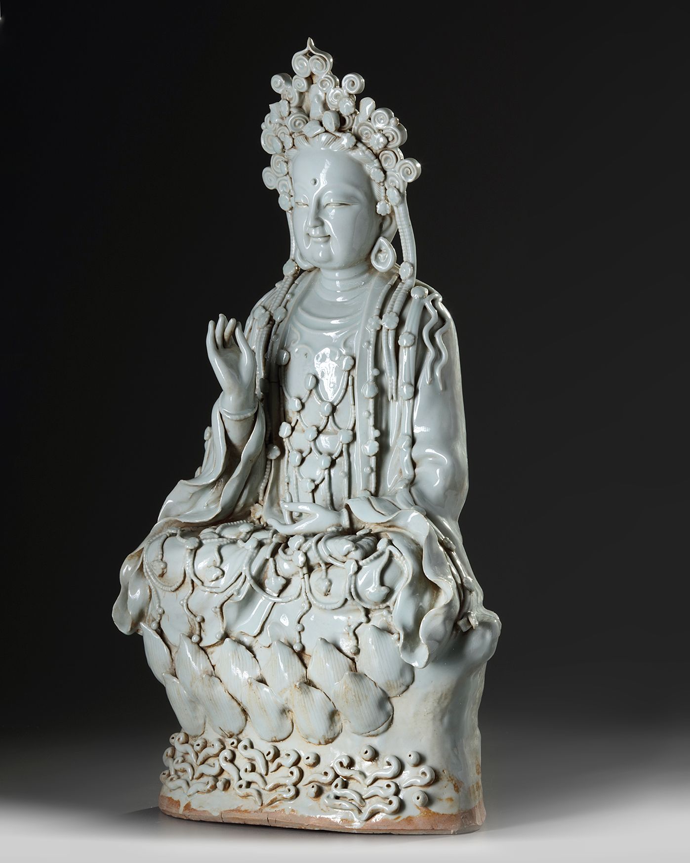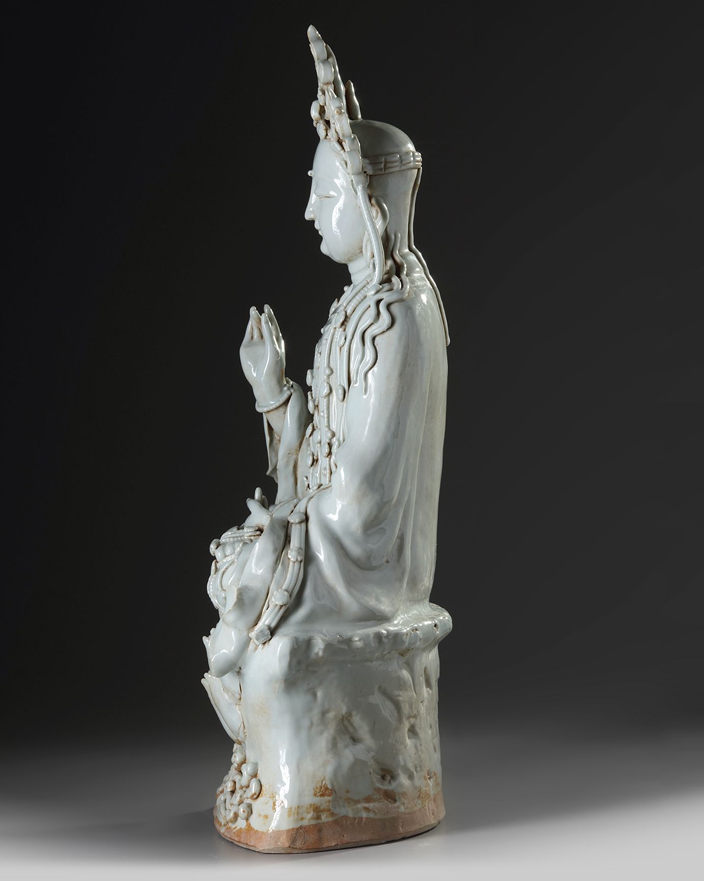 The figure is cast seated in dhyanasana with her hands in dhyanamudra, dressed in loose, flowing robes and elaborate beaded jewellery. The face with a serene expression, the hair upswept into a top knot beneath a foliate crown. The long outer robe open at the chest to expose an elaborate necklace, supported on a connected lotus base.