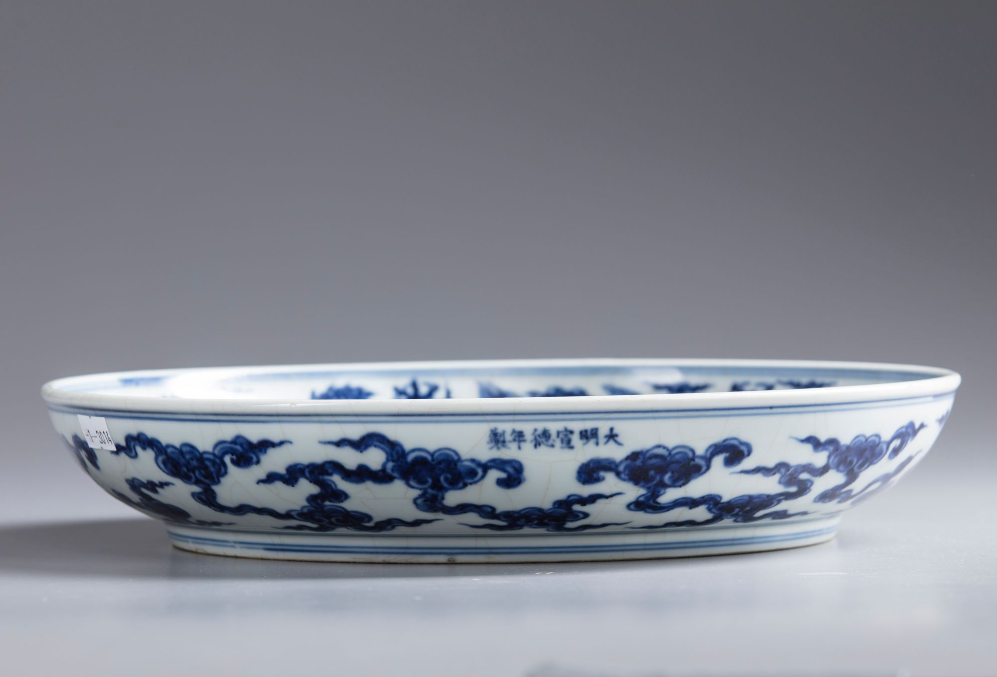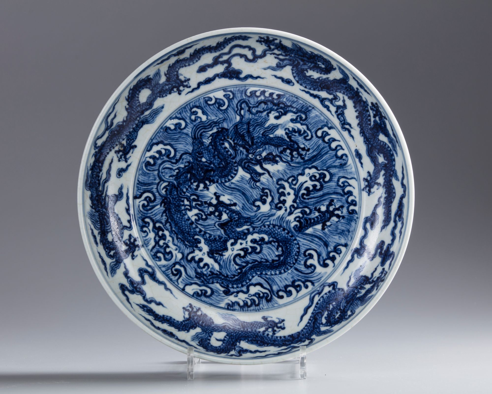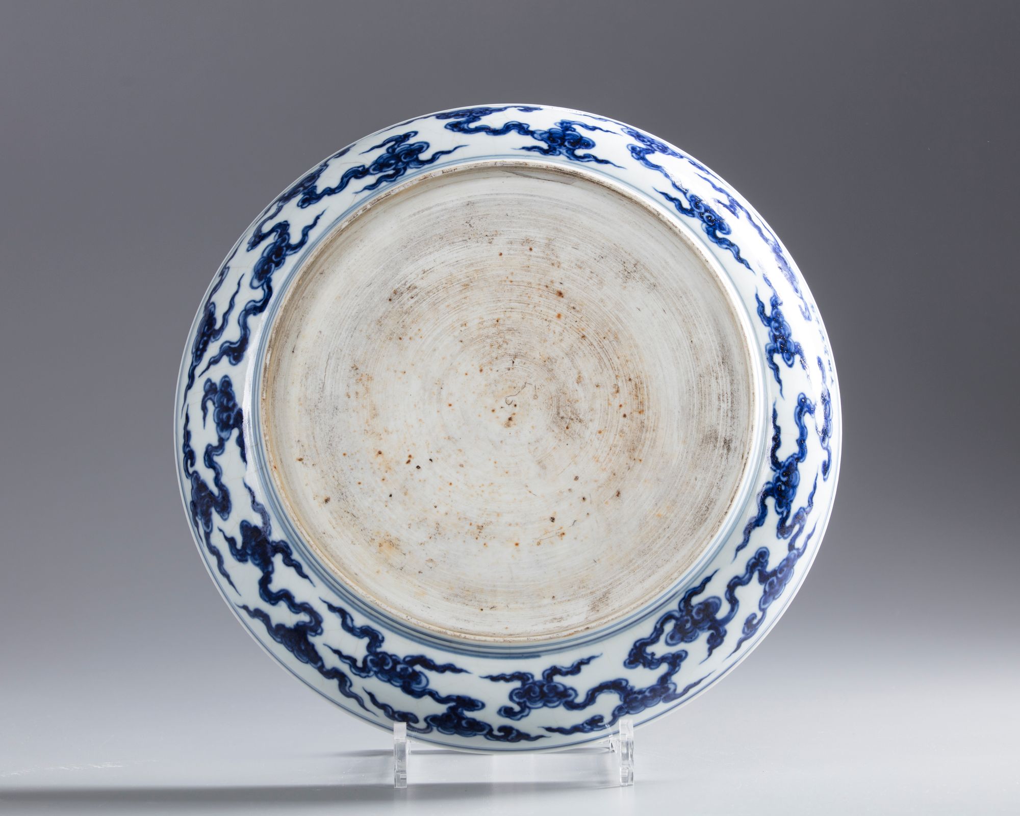 The charger is boldly decorated to the interior with a roundel enclosing a writhing dragon amongst crashing waves, the cavetto is decorated with four further striding dragons amongst clouds. The exterior is decorated with cloud scrolls, and a Xuande mark just below the rim, and the base is unglazed.