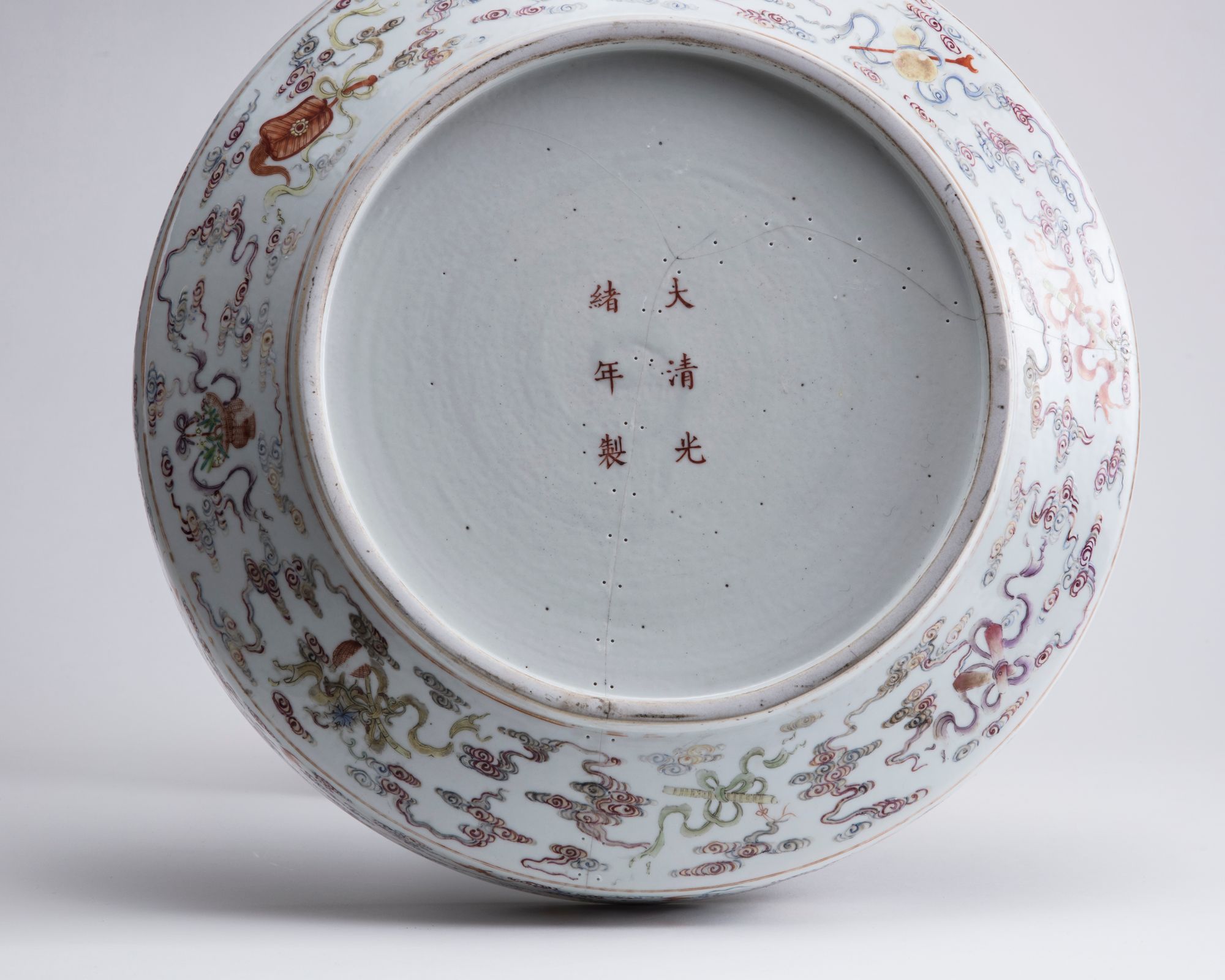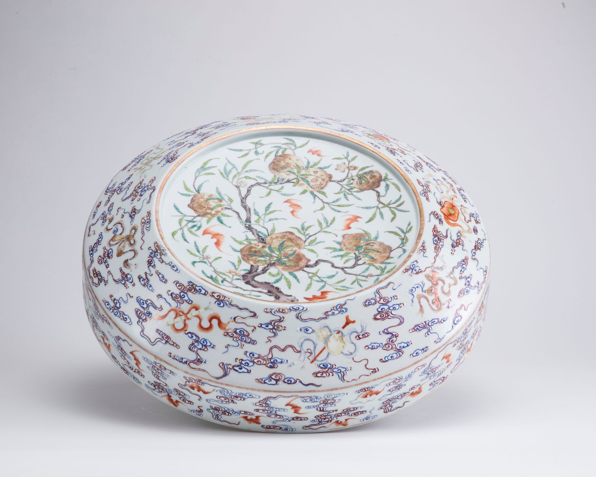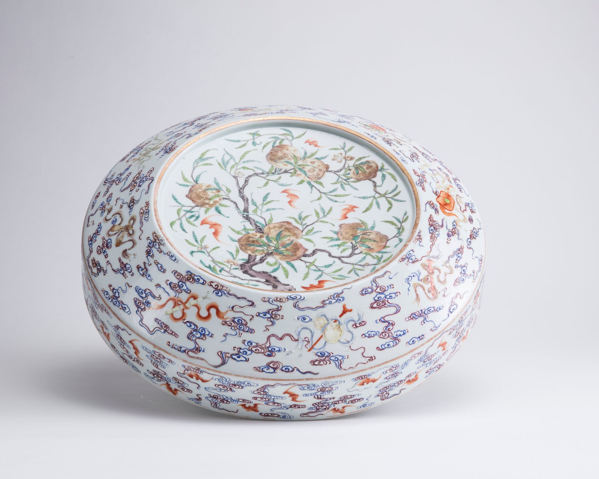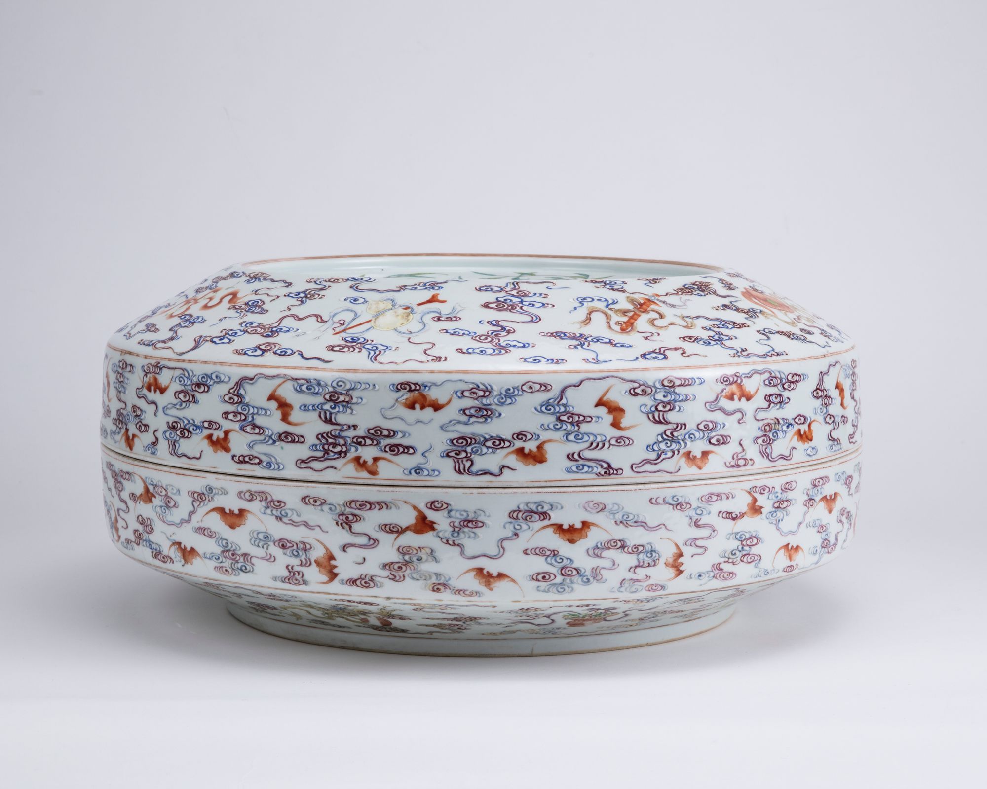 The cover of the box is decorated with a recessed panel enclosing nine peaches on leafy branches amongst five bats in flight, the sides of the cover are decorated with the emblems of the Eight Immortals amongst bats and clouds. The sides of the base of the box is decorated with further bats and clouds, all surrounding a Guangxu mark.