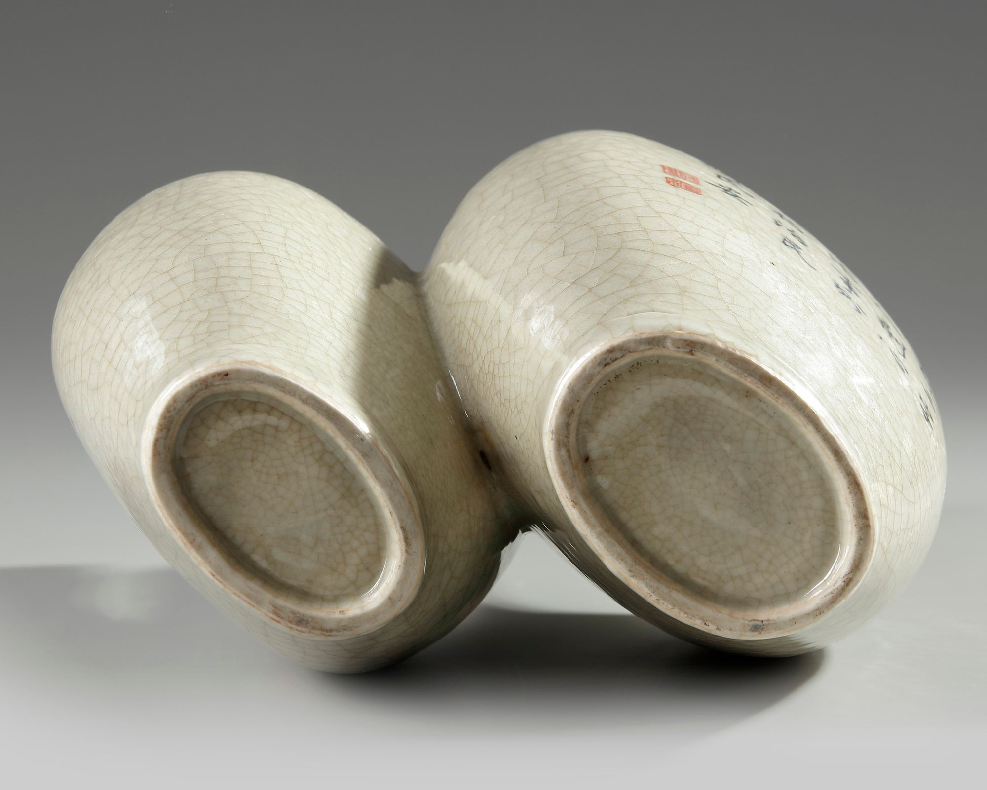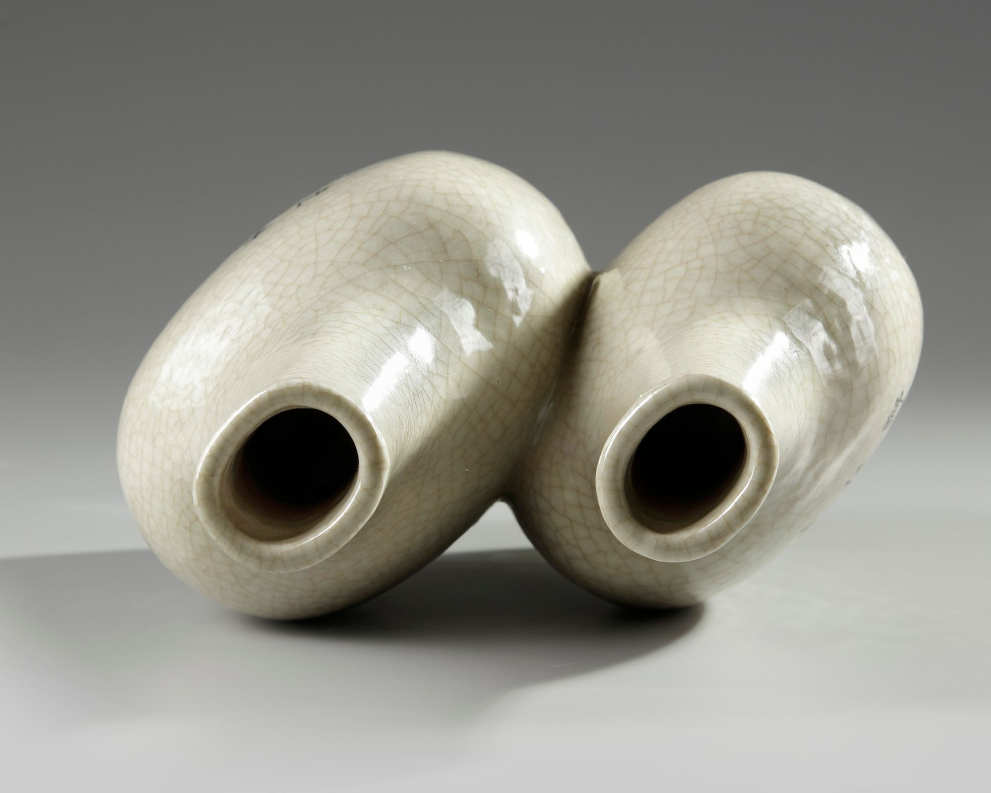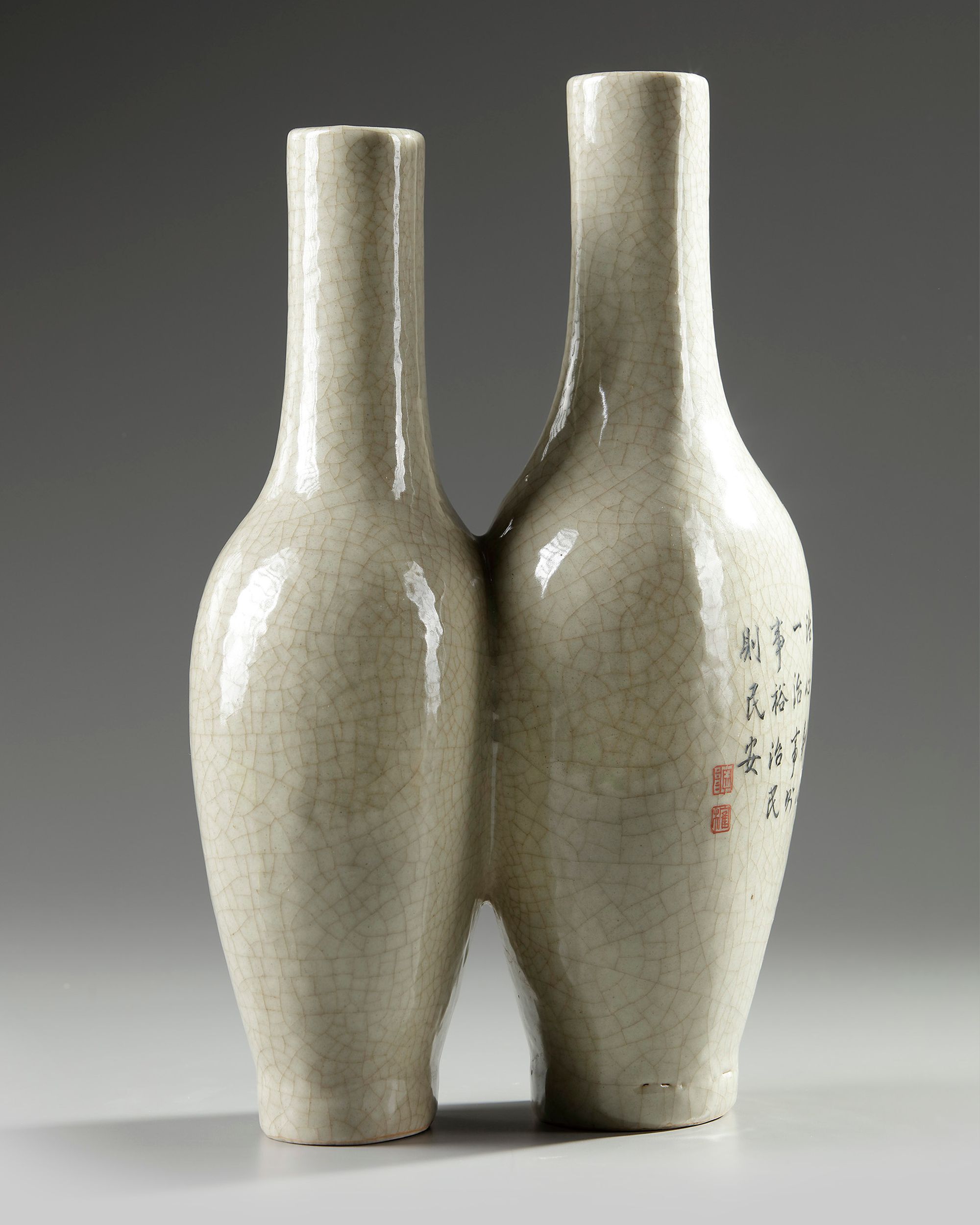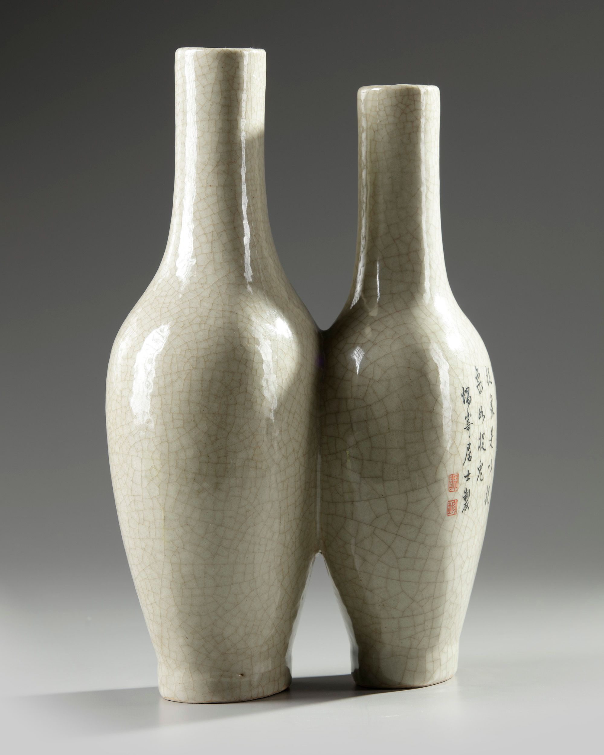 A Chinese crackle glazed 'inscribed' conjoined bottle vase
