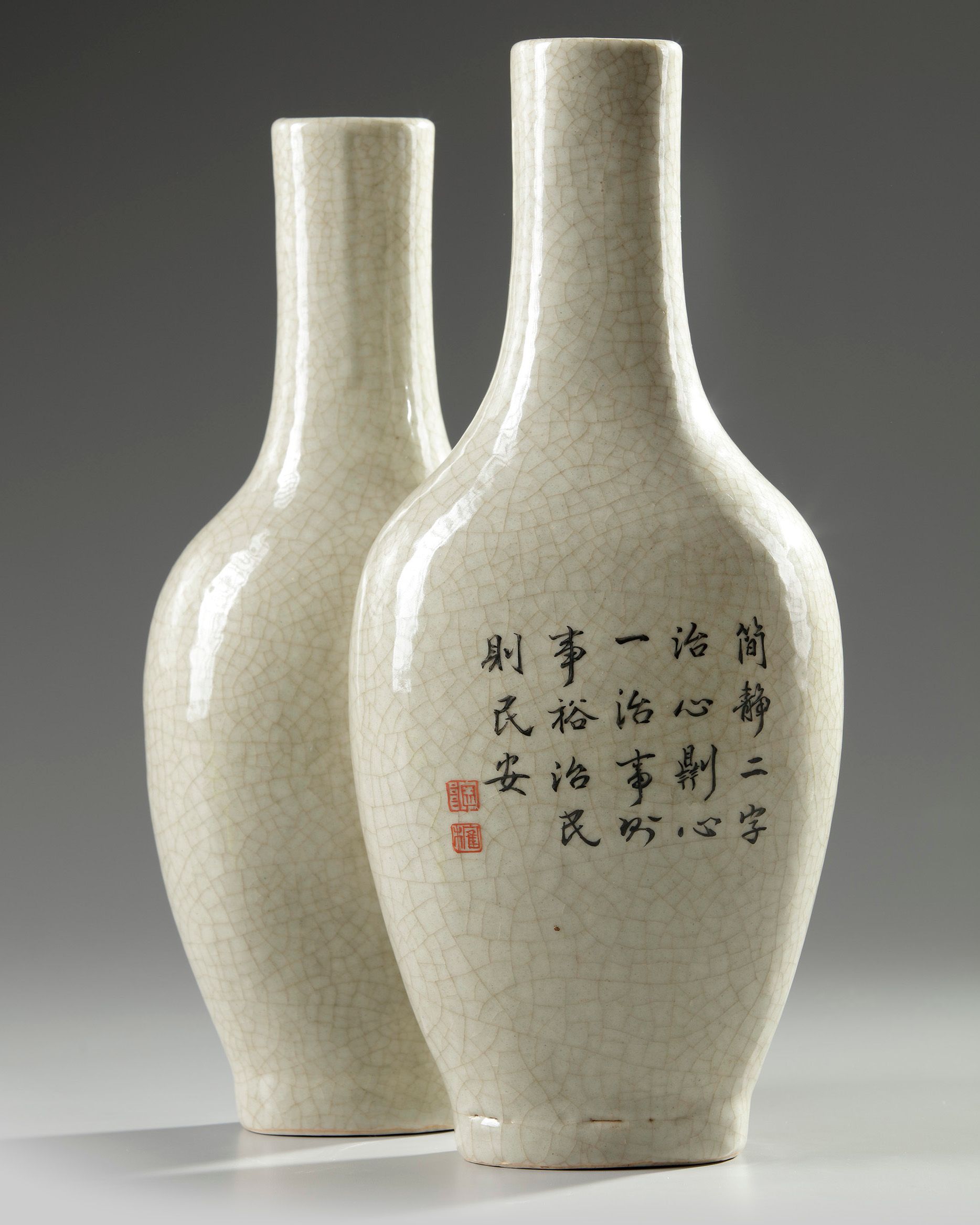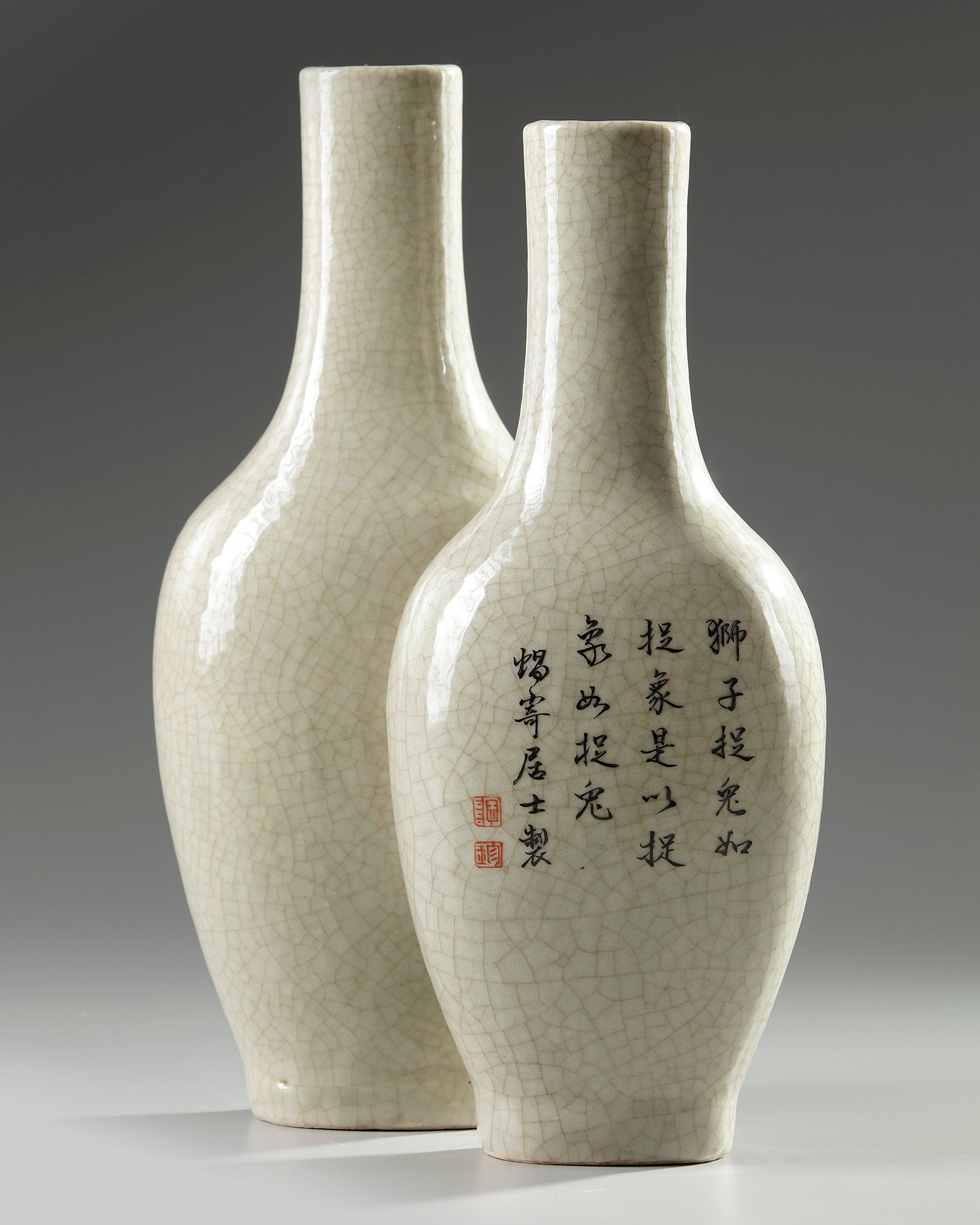 The slender vases are each decorated to one side with a poetic inscription, and one side is signed 'yang qi ju shi zhi' and two iron-red seals. It is covered overall with a pale brown glaze with darker brown crackles.