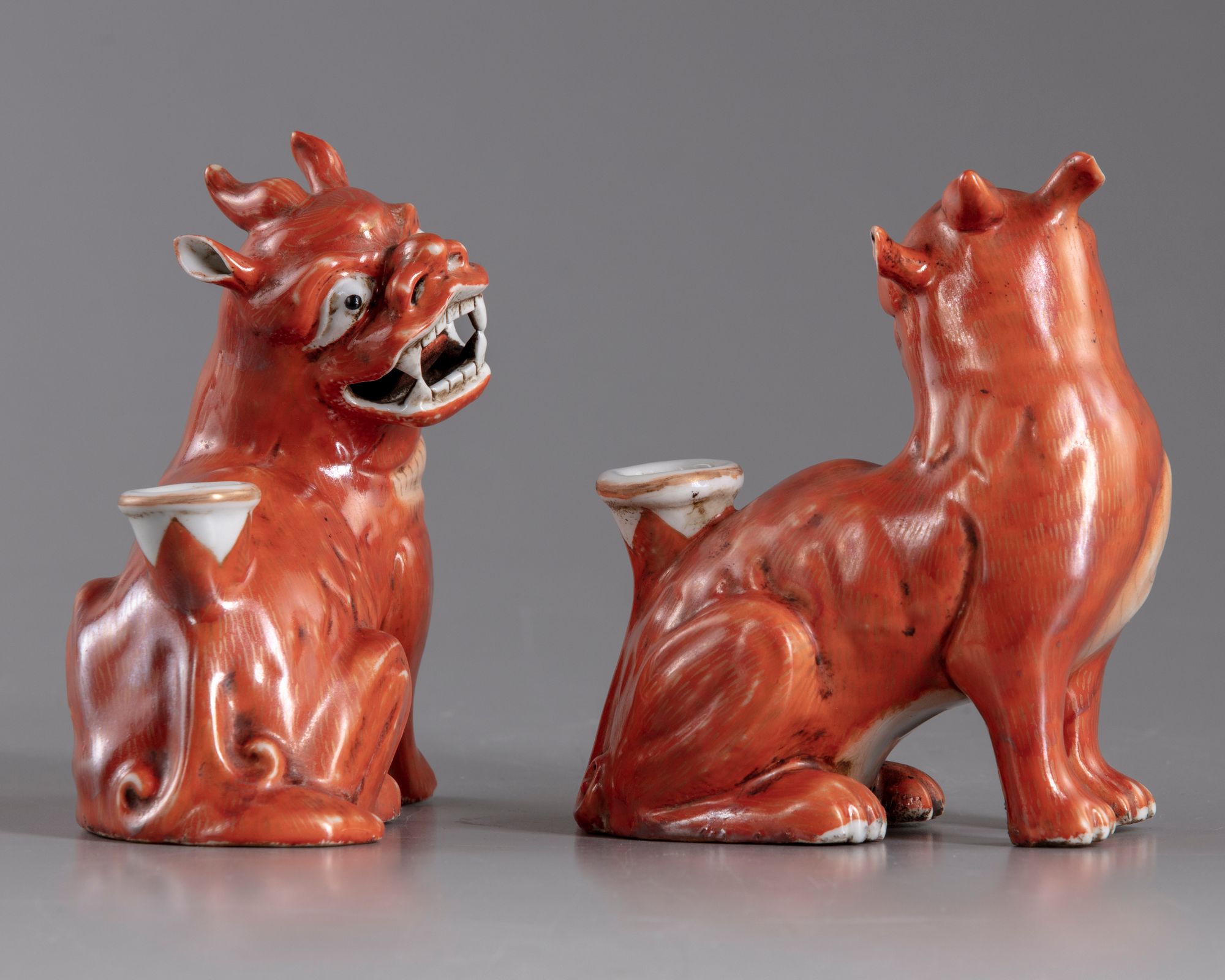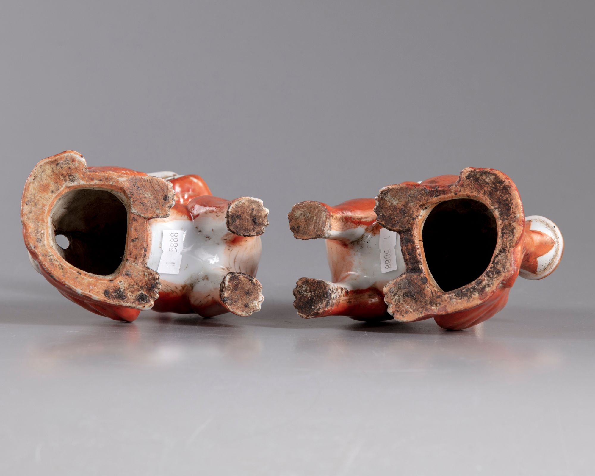 Each modelled seated on its haunches with a smiling face and ears leaning forward, looking slightly over its back and covered with an iron-red glaze.