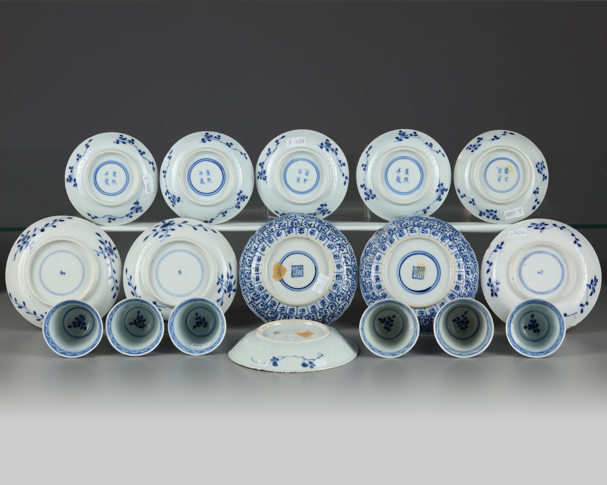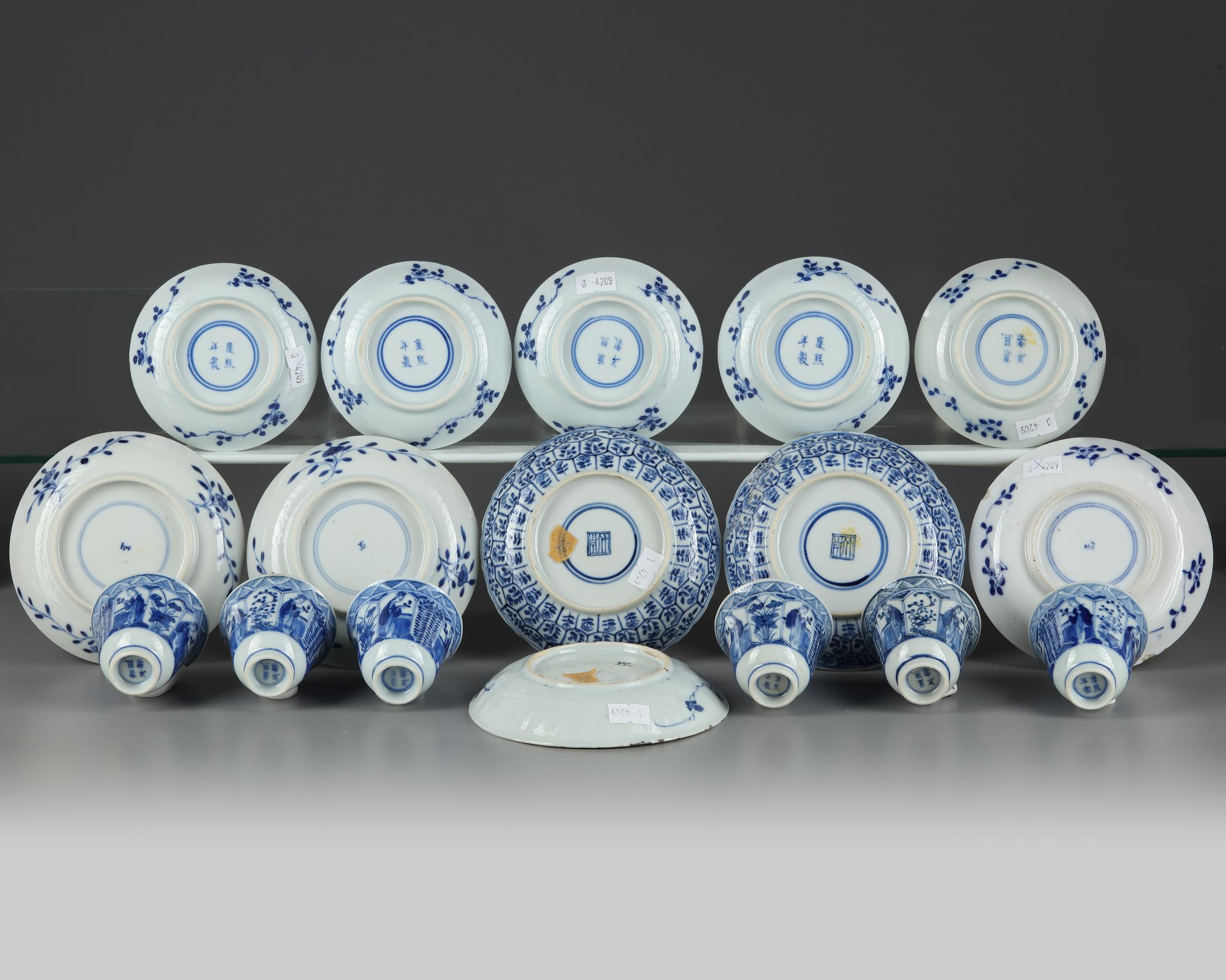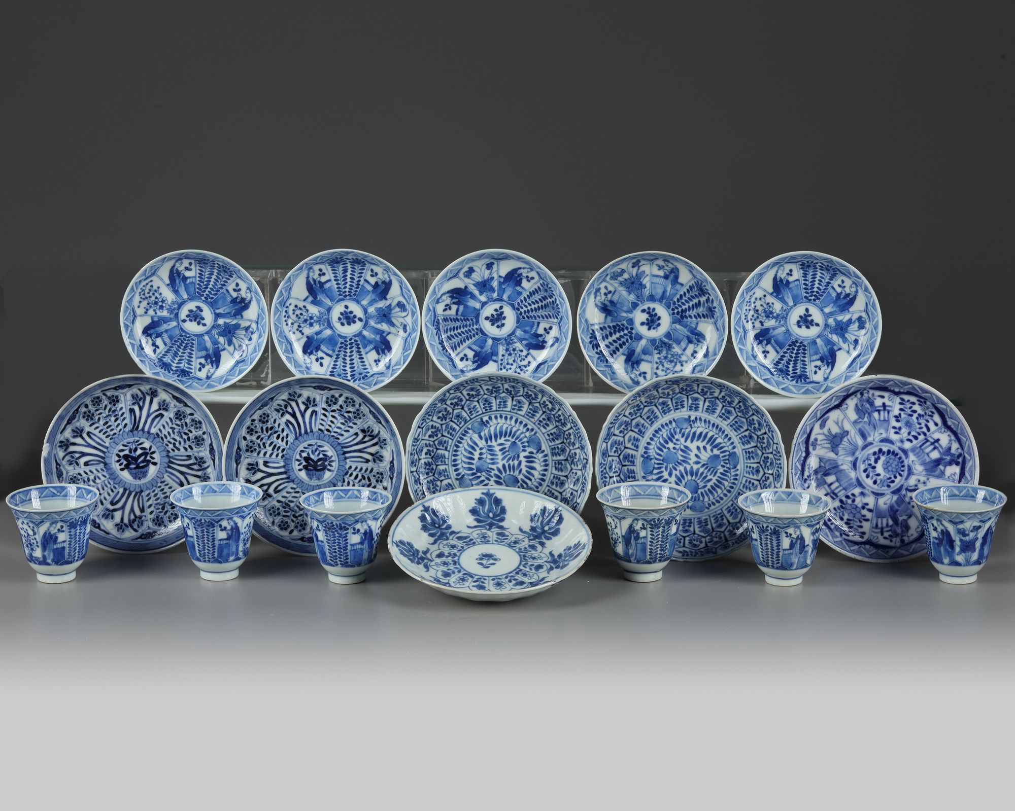 Comprising: six cups decorated with lotus petals enclosing alternating ladies and flowers, and five saucers en suite, each with an apocryphal Kangxi mark; a further saucer similarly decorated with a ‘yu’ (jade) mark to the base; a pair of dishes decorated with lotus petal panels enclosing flowers, the vase with ‘yu’ (jade) marks; a pair of dishes decorated with lotus petal panels, the bases with a two-character seal mark; and a moulded dish with lotus petal panels and flower heads.