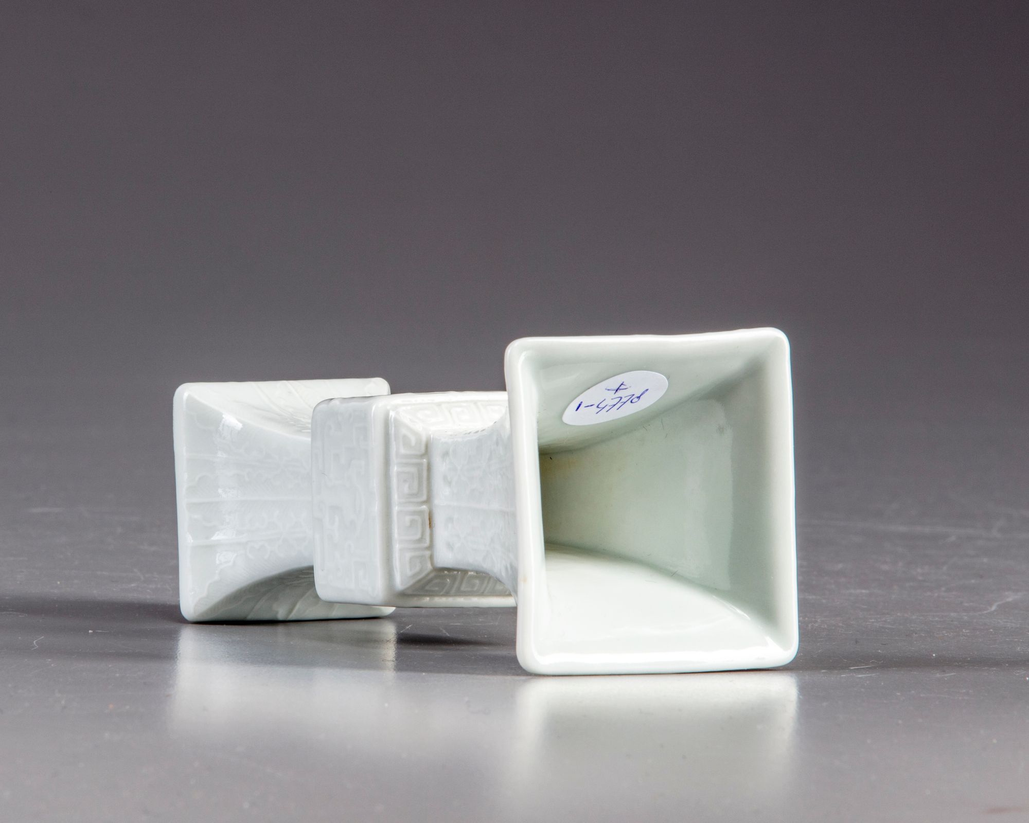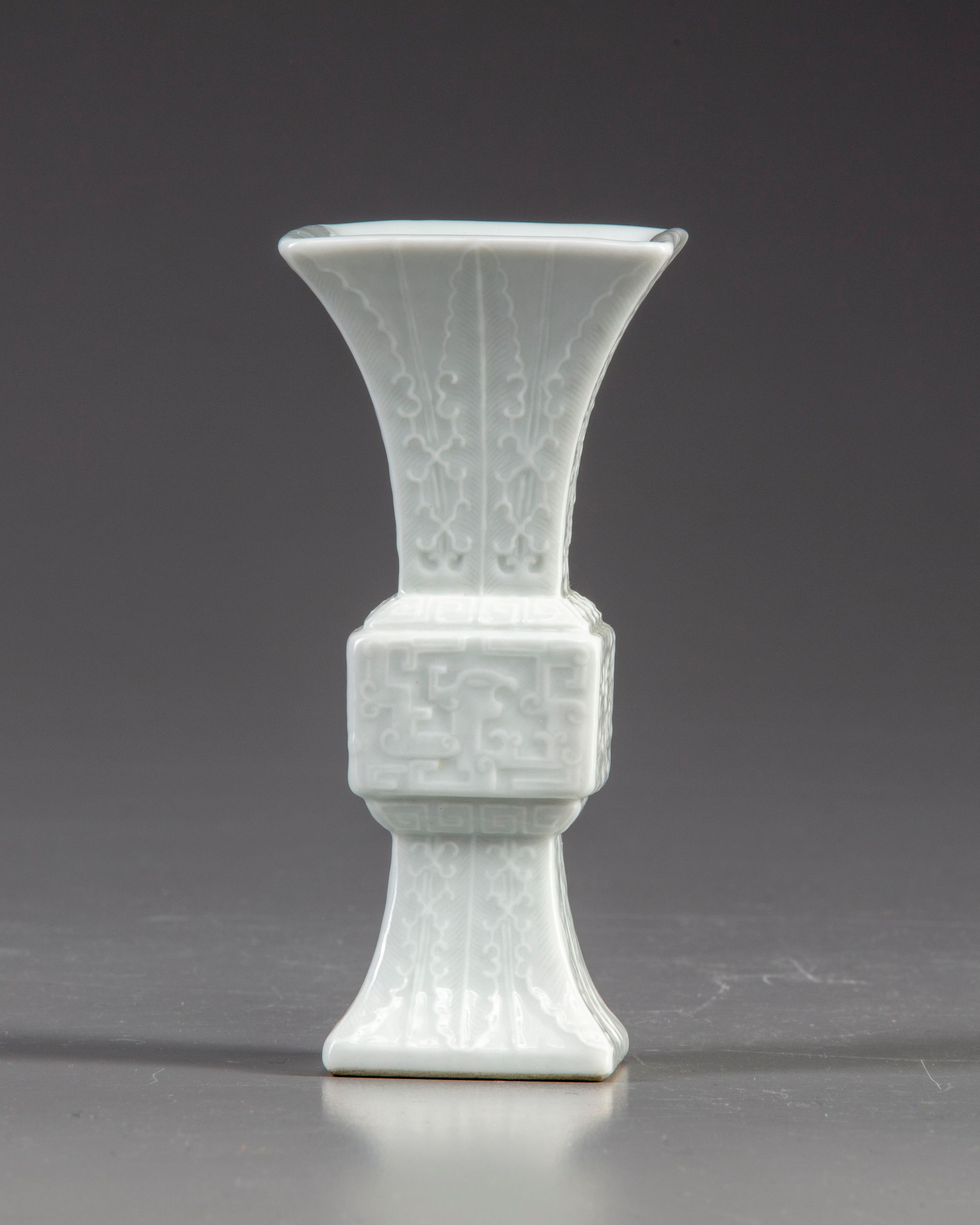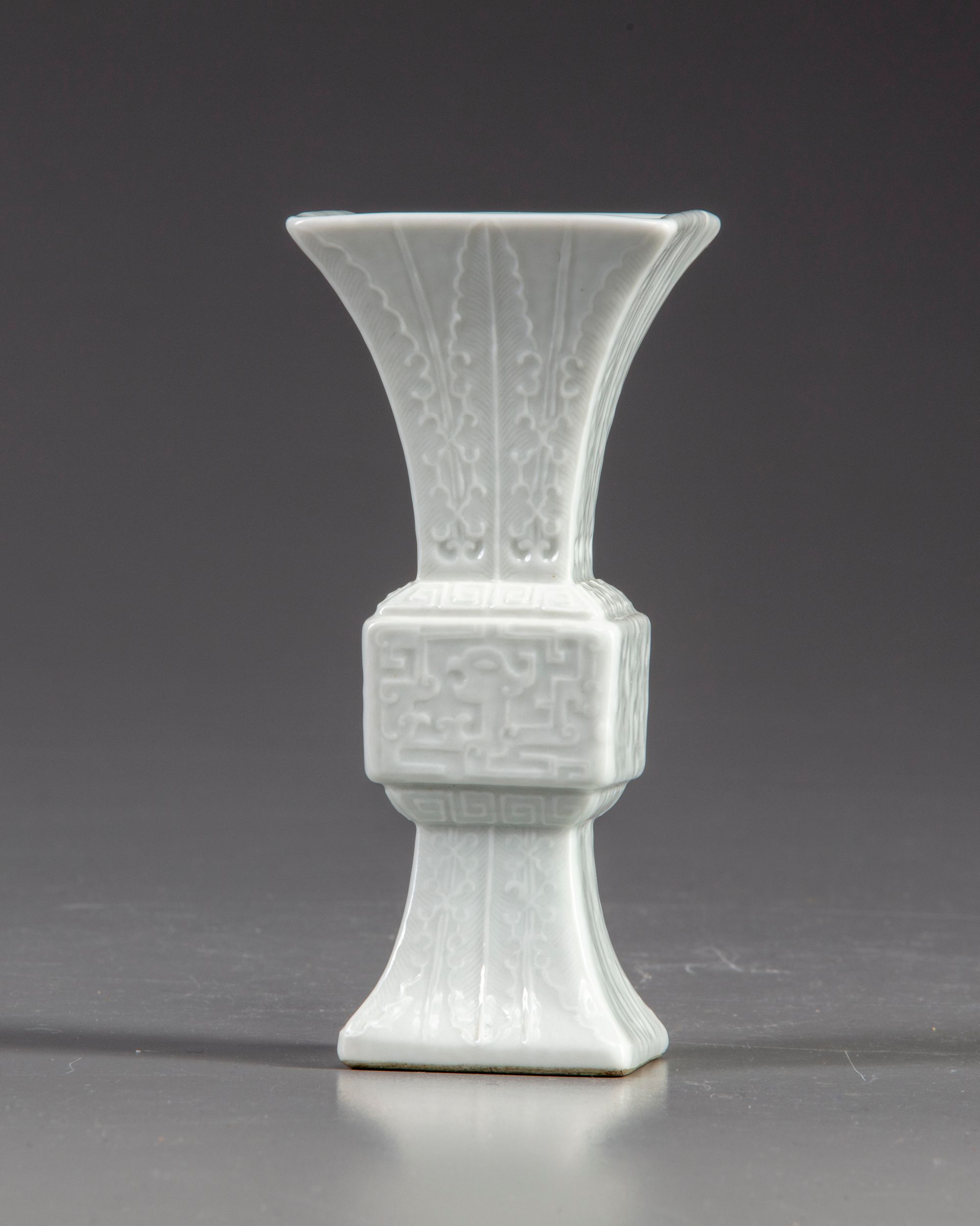 The vase is decorated in low relief with archaistic phoenix between keyfret bands, the neck and foot with stiff leaves. The base with an apocryphal Qianlong mark.