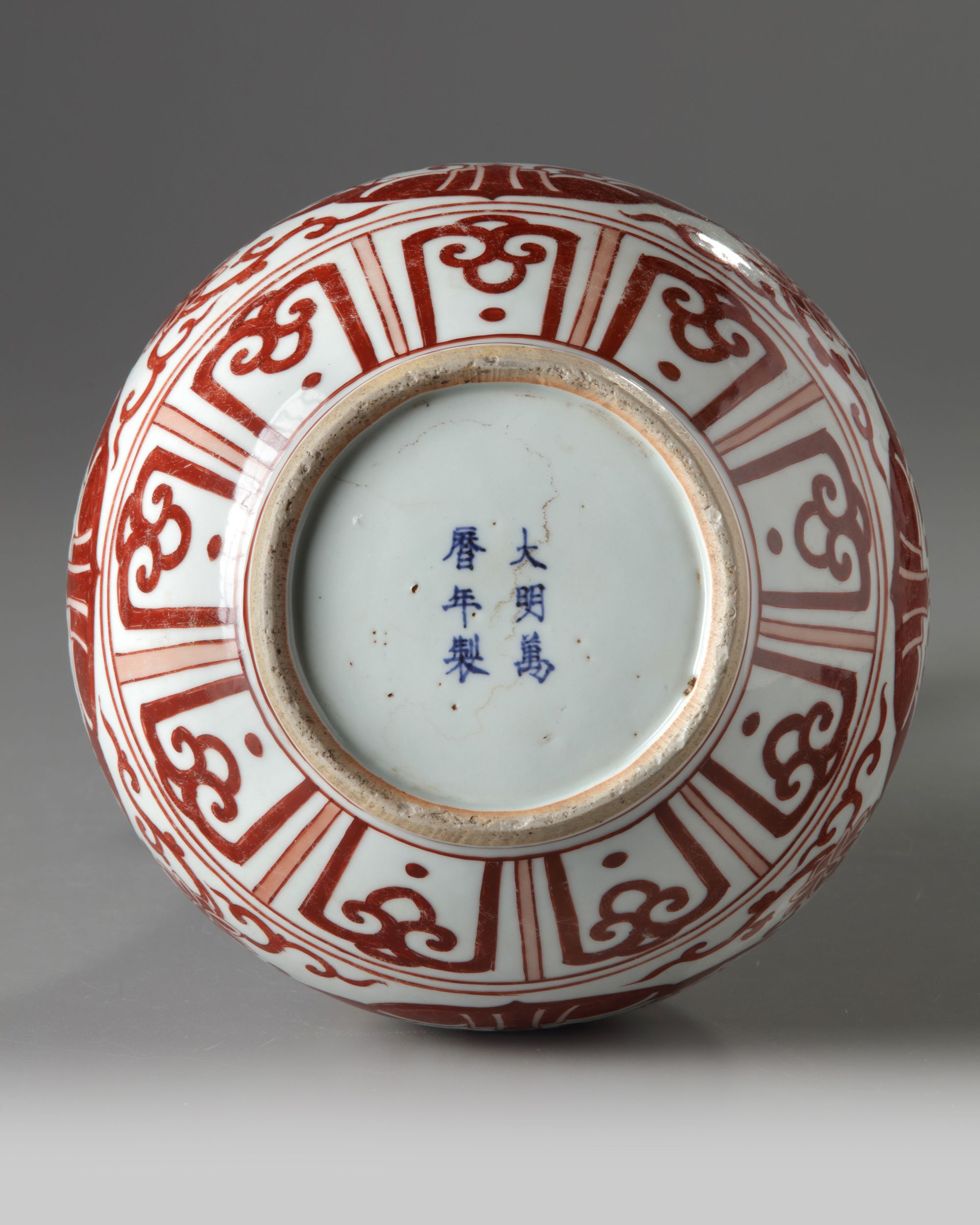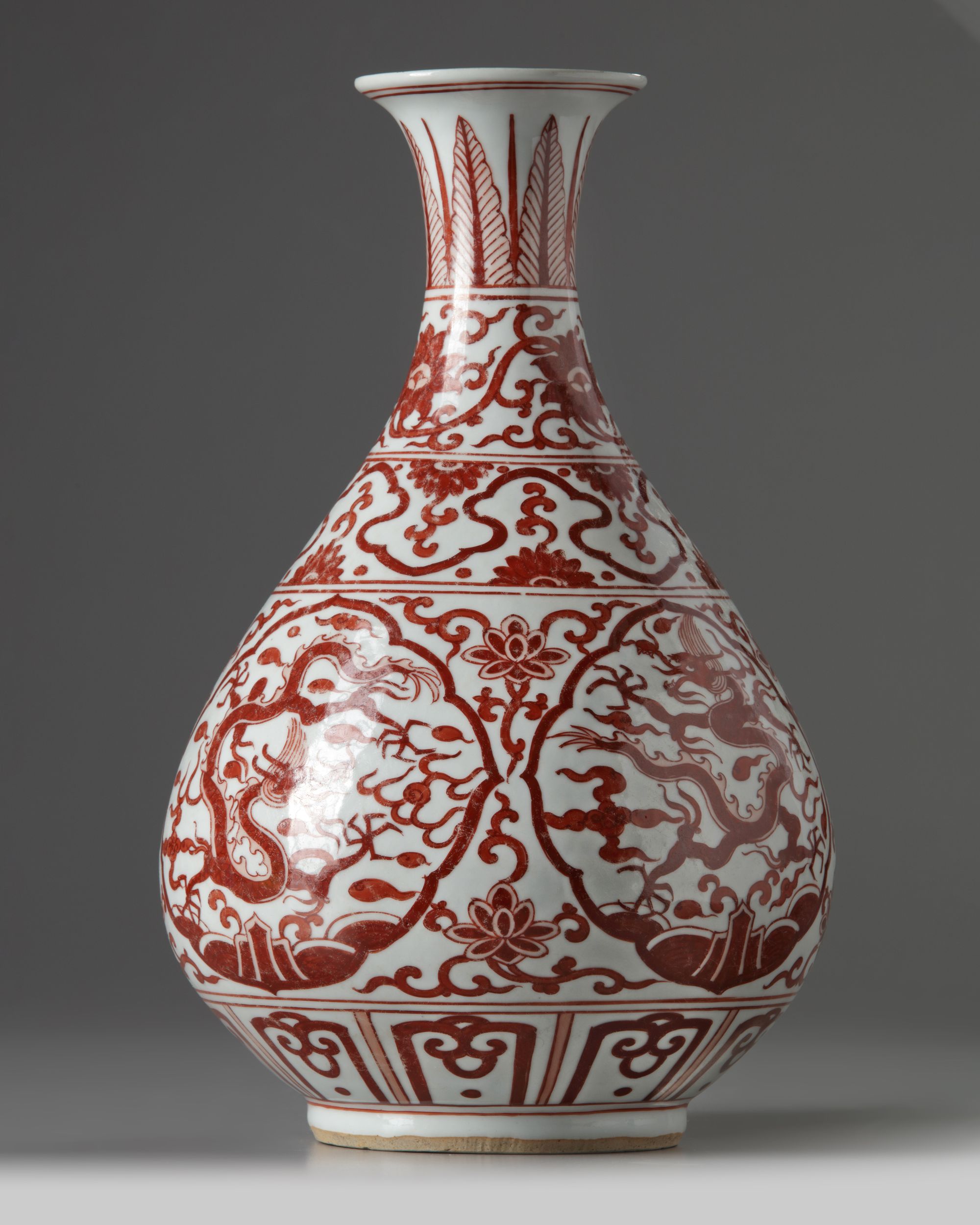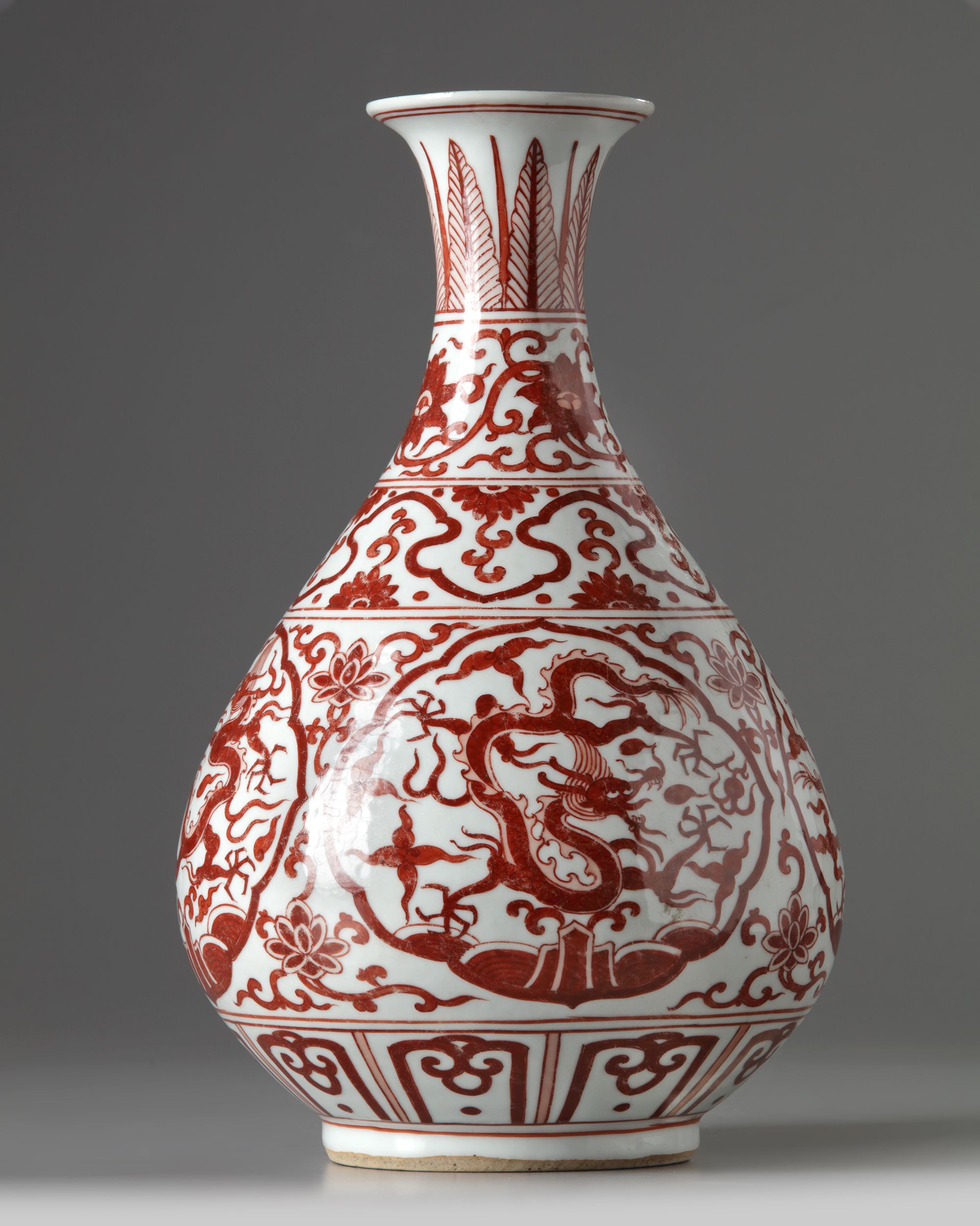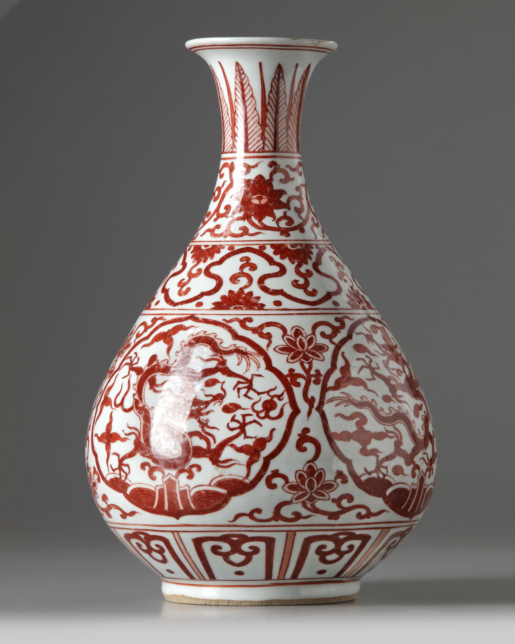 The vase is decorated to the body with four foliate panels enclosing dragons leaping above waves crashing against mountains interspersed with lotus flower sprays. The neck is decorated with flowers enclosed in ruyi panels, below a lotus scroll and stiff leaves at the neck. The base bears an apocryphal Wanli mark.