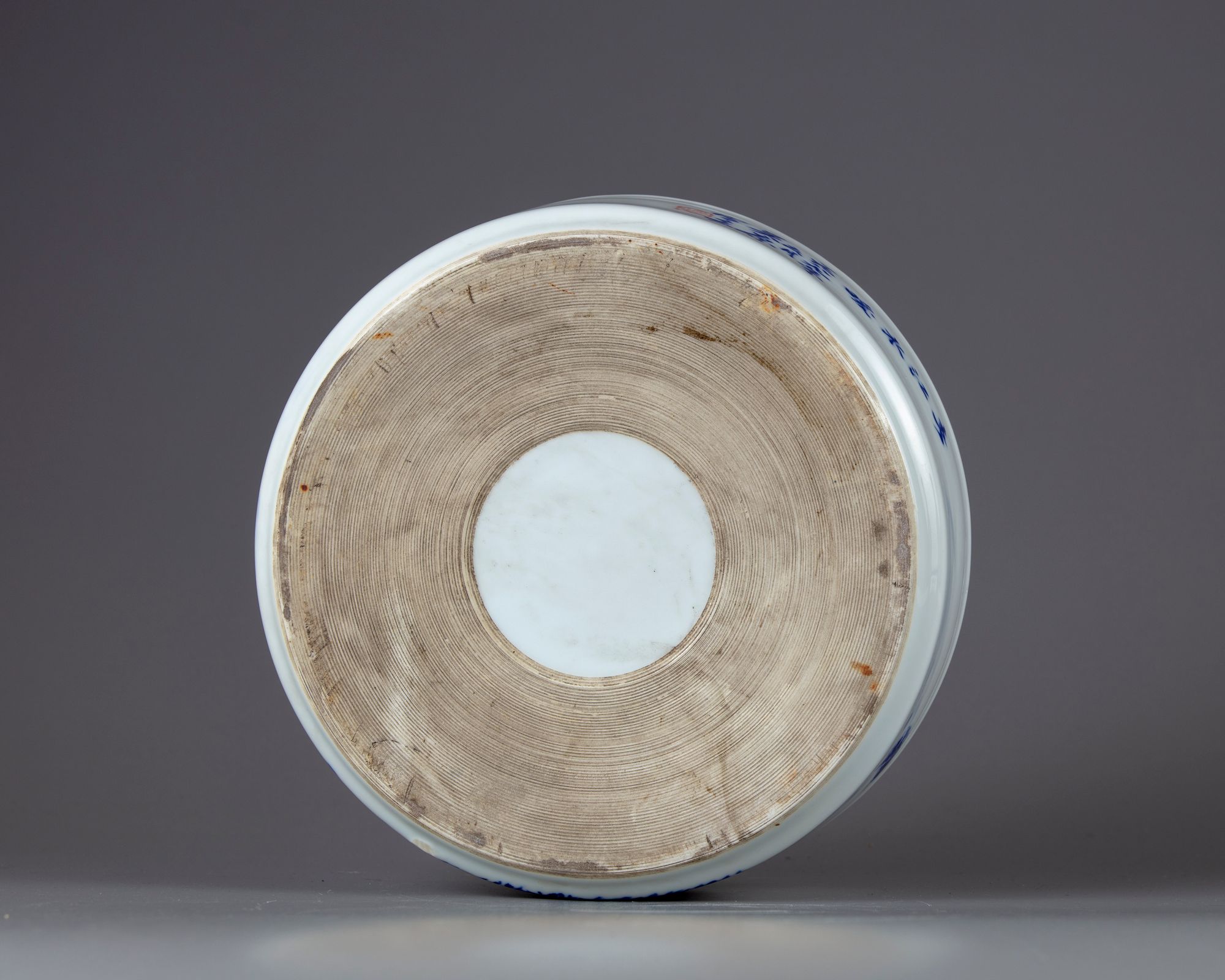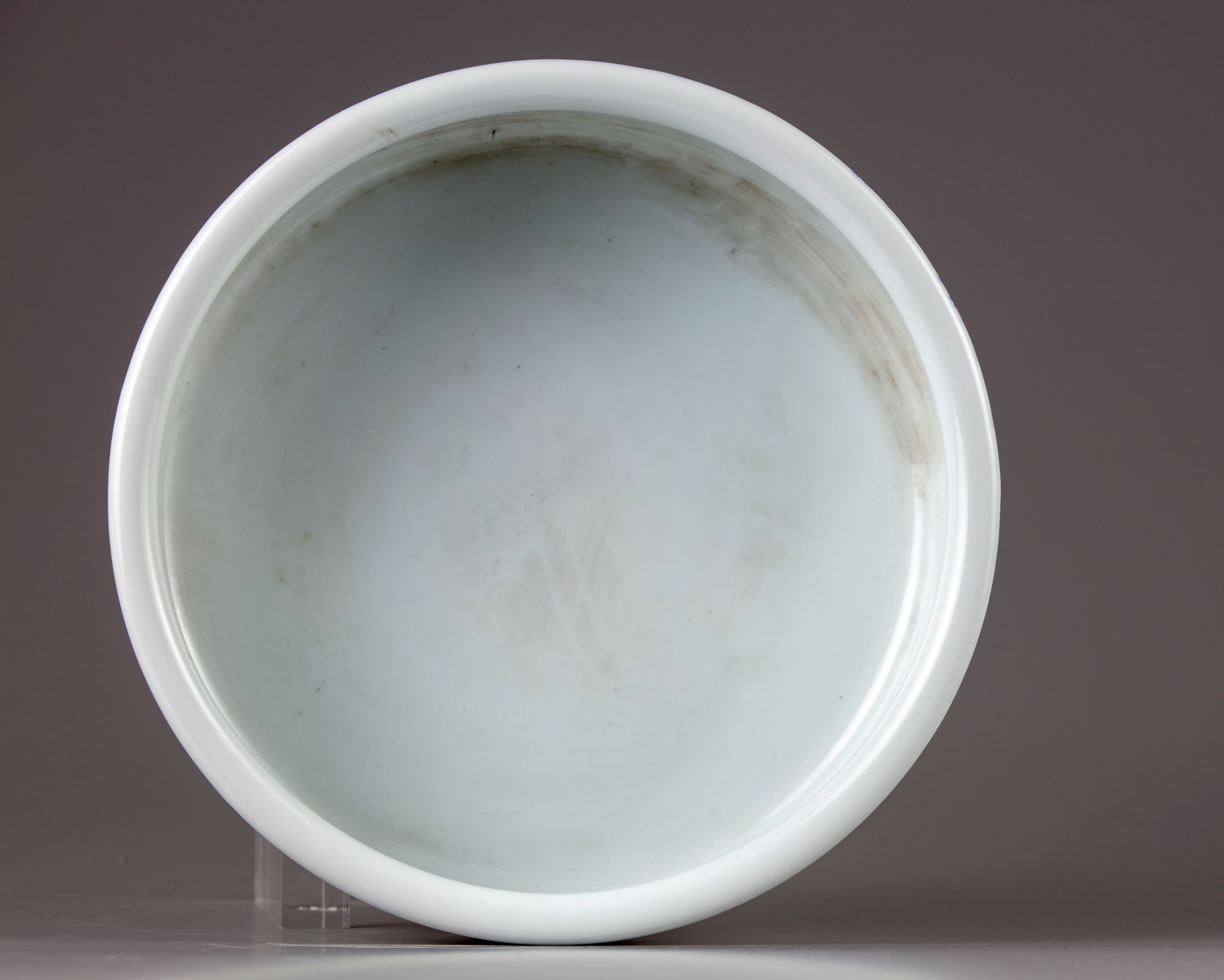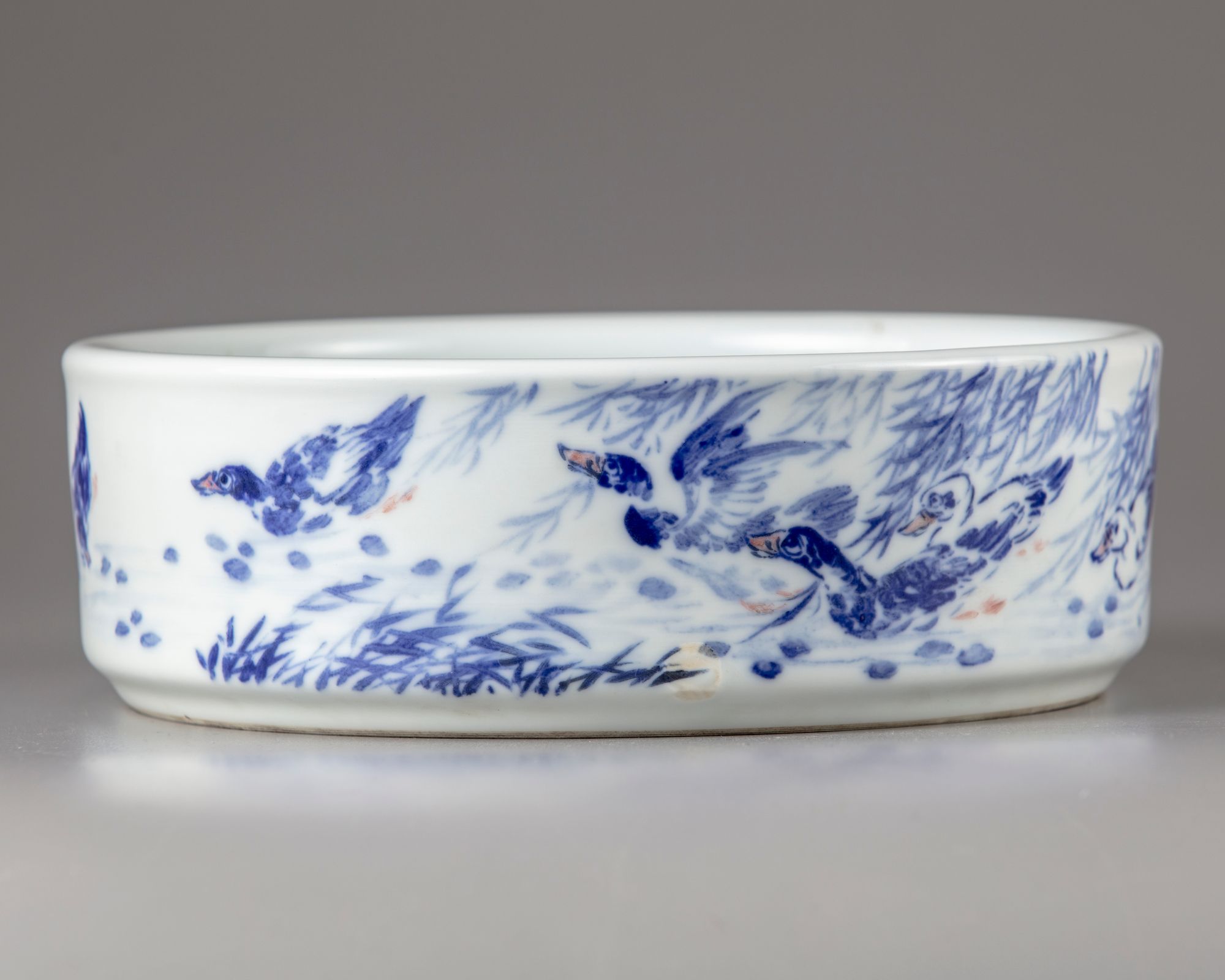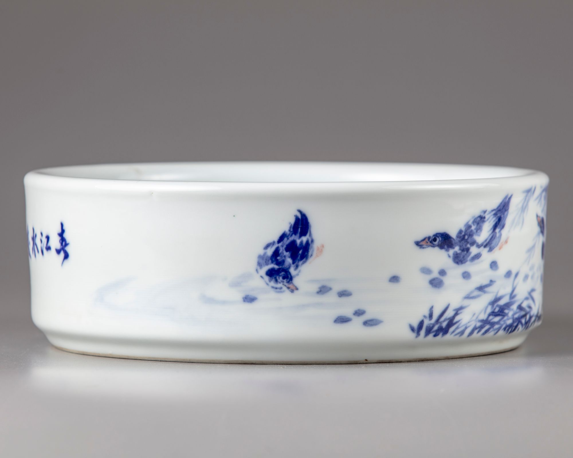 The washer is decorated to the sides with ducks in variety of postures amongst grass, The reverse with a Chinese calligraphy and a seal mark.