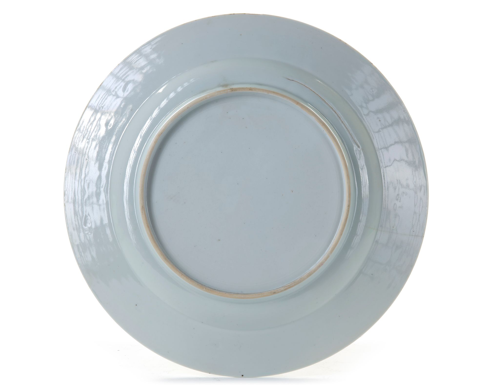 A Chinese porcelain famille rose dish, decorated to the centre with large chrysanthemum sprays issuing from a gilt vase. The sides with a repeating pattern of a gilt butterfly and flowering branches with pomegranates, peaches and citron. 31 cm. diam.