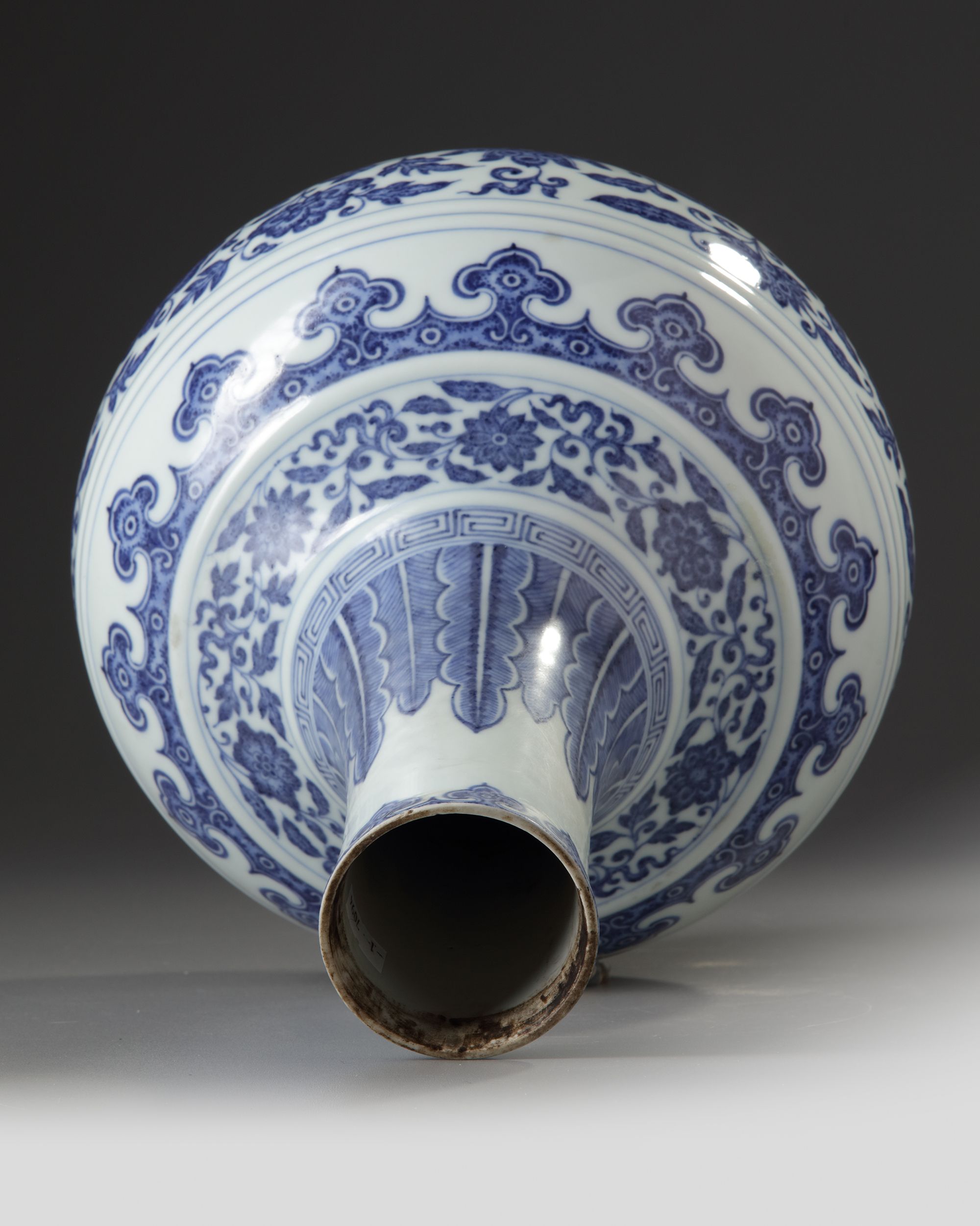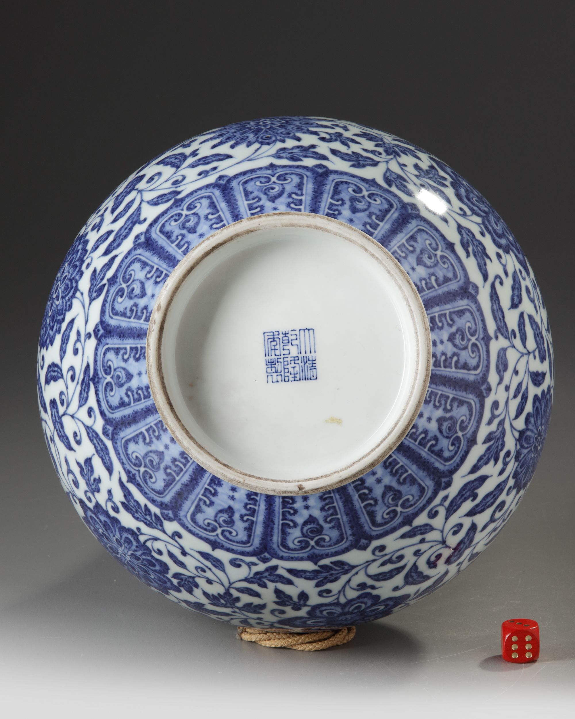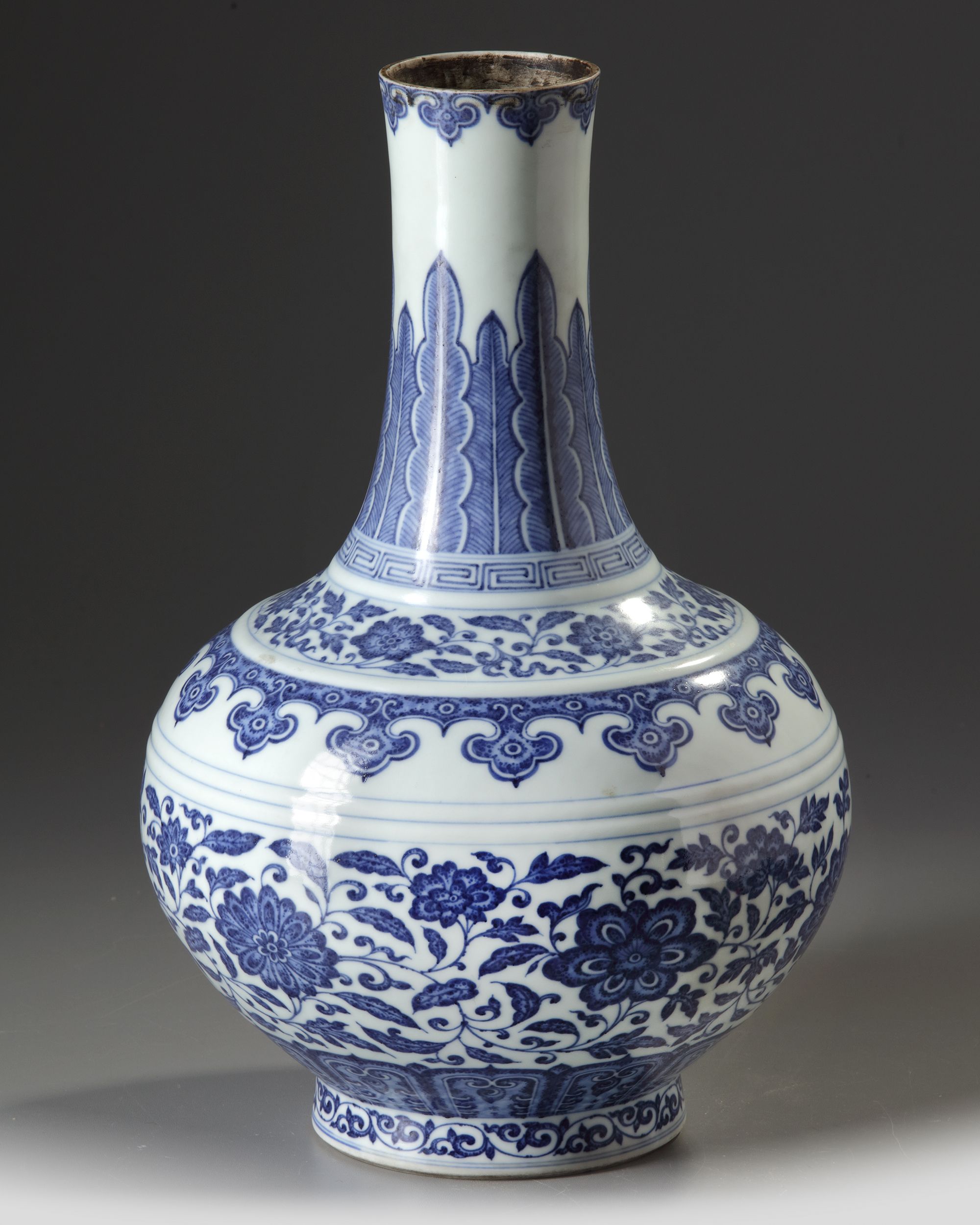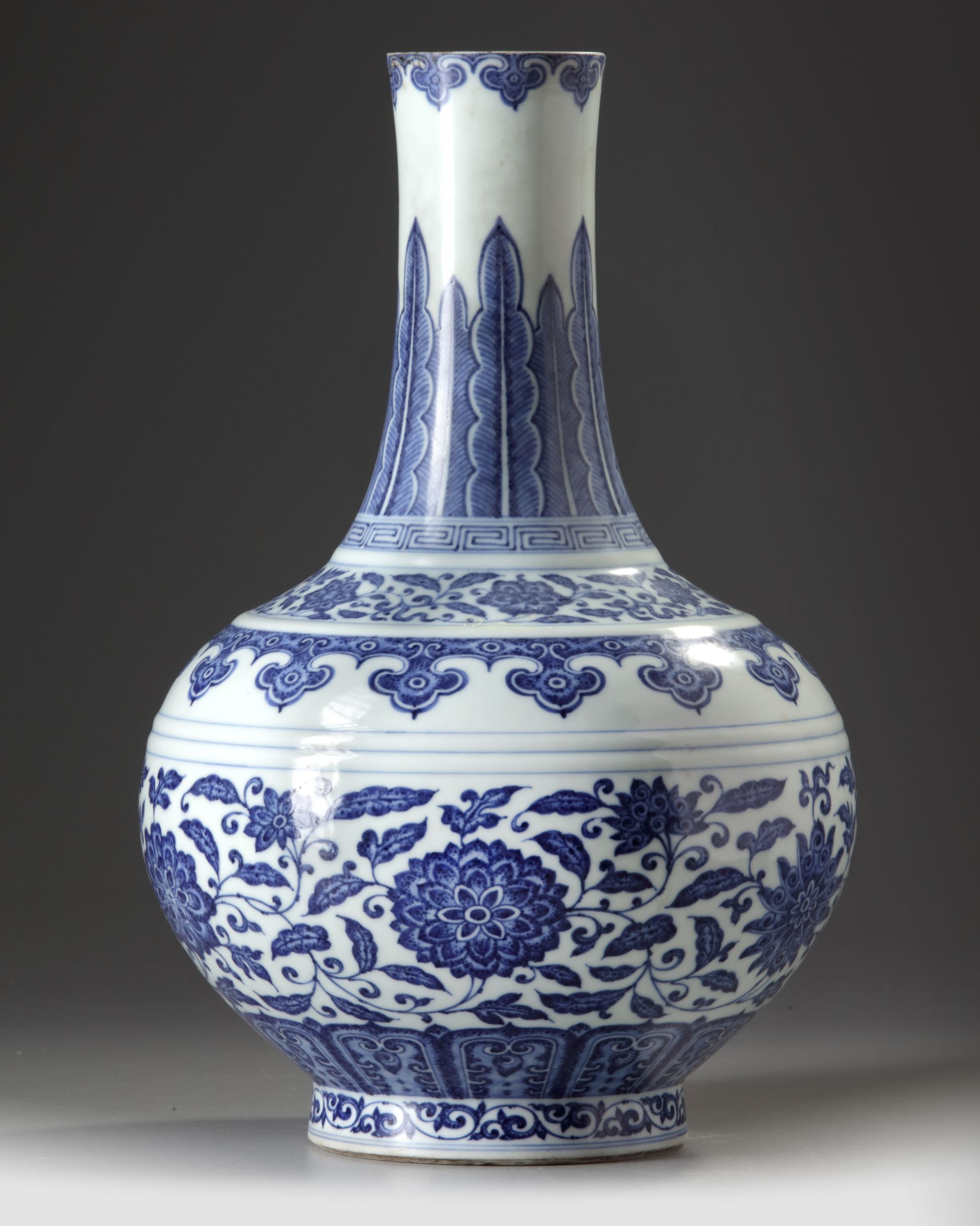 The globular body of the vase is delicately painted to simulate 'heaping and piling', with a band of composite foliate scroll above a border of petal lappets. There is a further foliate scroll and a ruyi-band around the shoulder, and the neck has upright leaves rising from a key-fret border. There is a further ruyi-head border to the mouth rim, The base with a Chinese Qianlong seal mark.