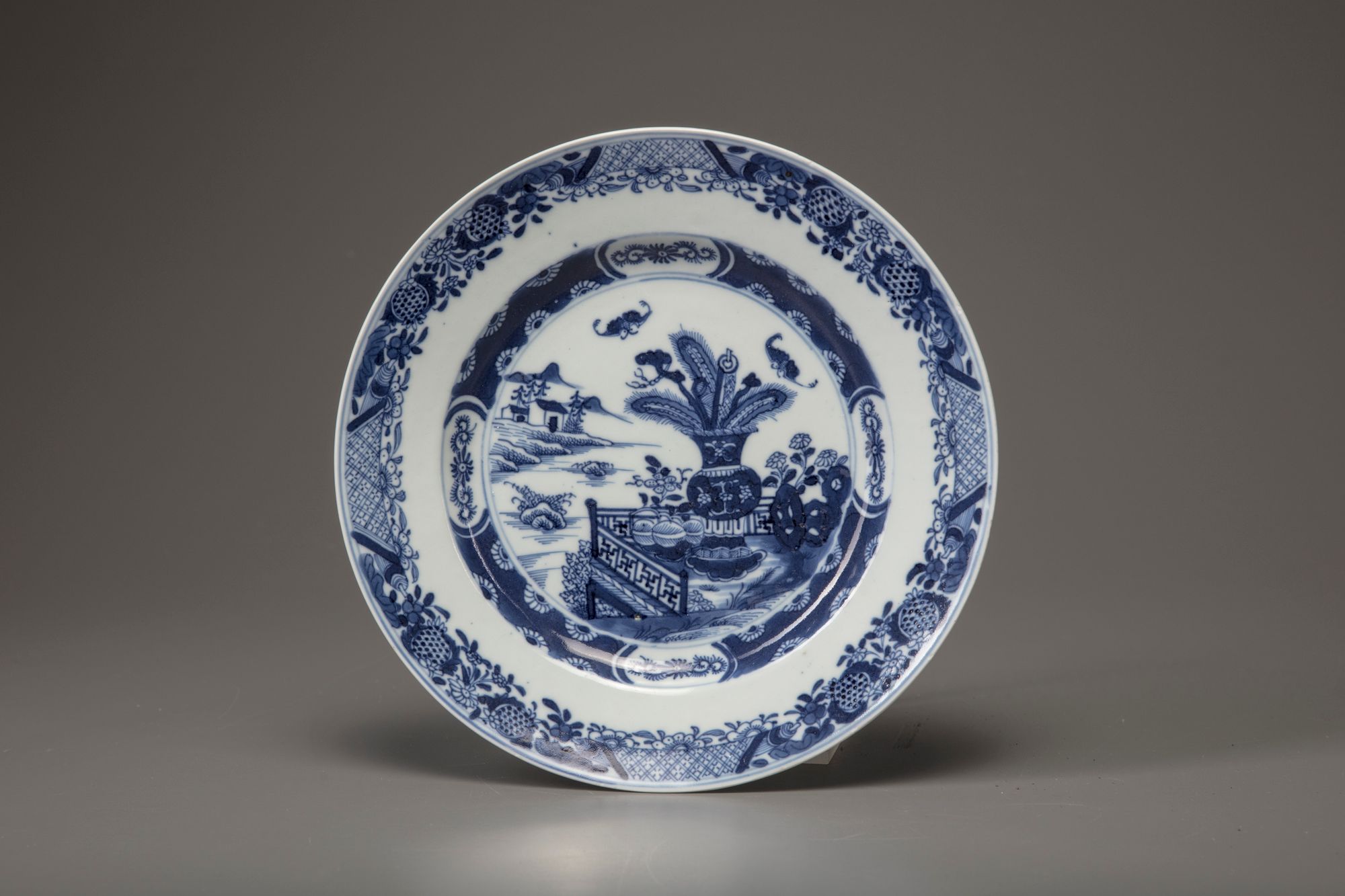 Each dish is decorated with a vase bearing feathers and scrolls in a fenced garden below to bats. The scene is surrounded by a pomegranate and trellis border.