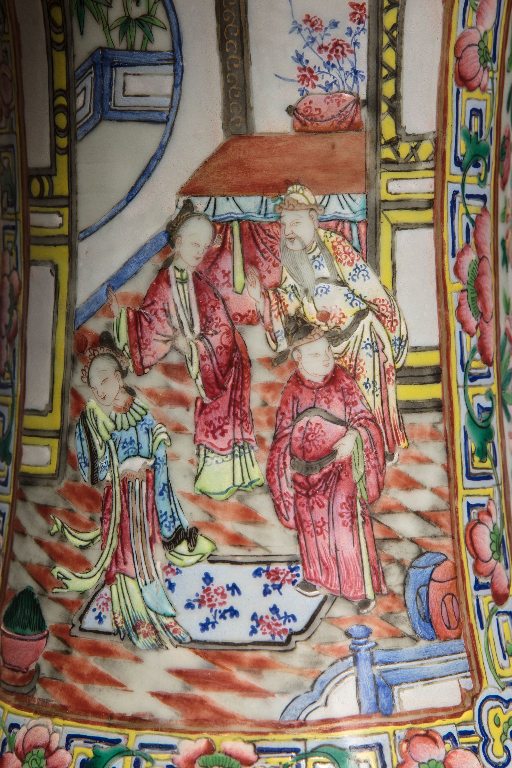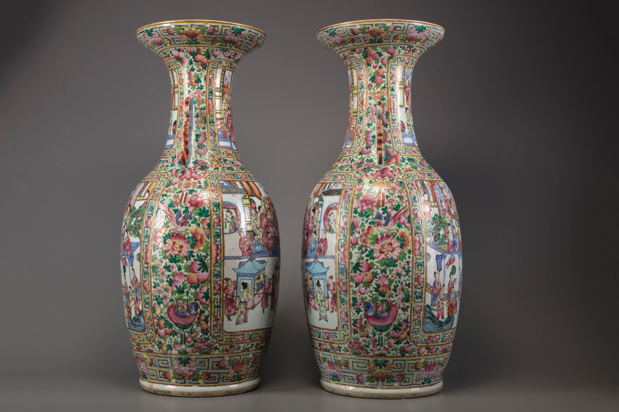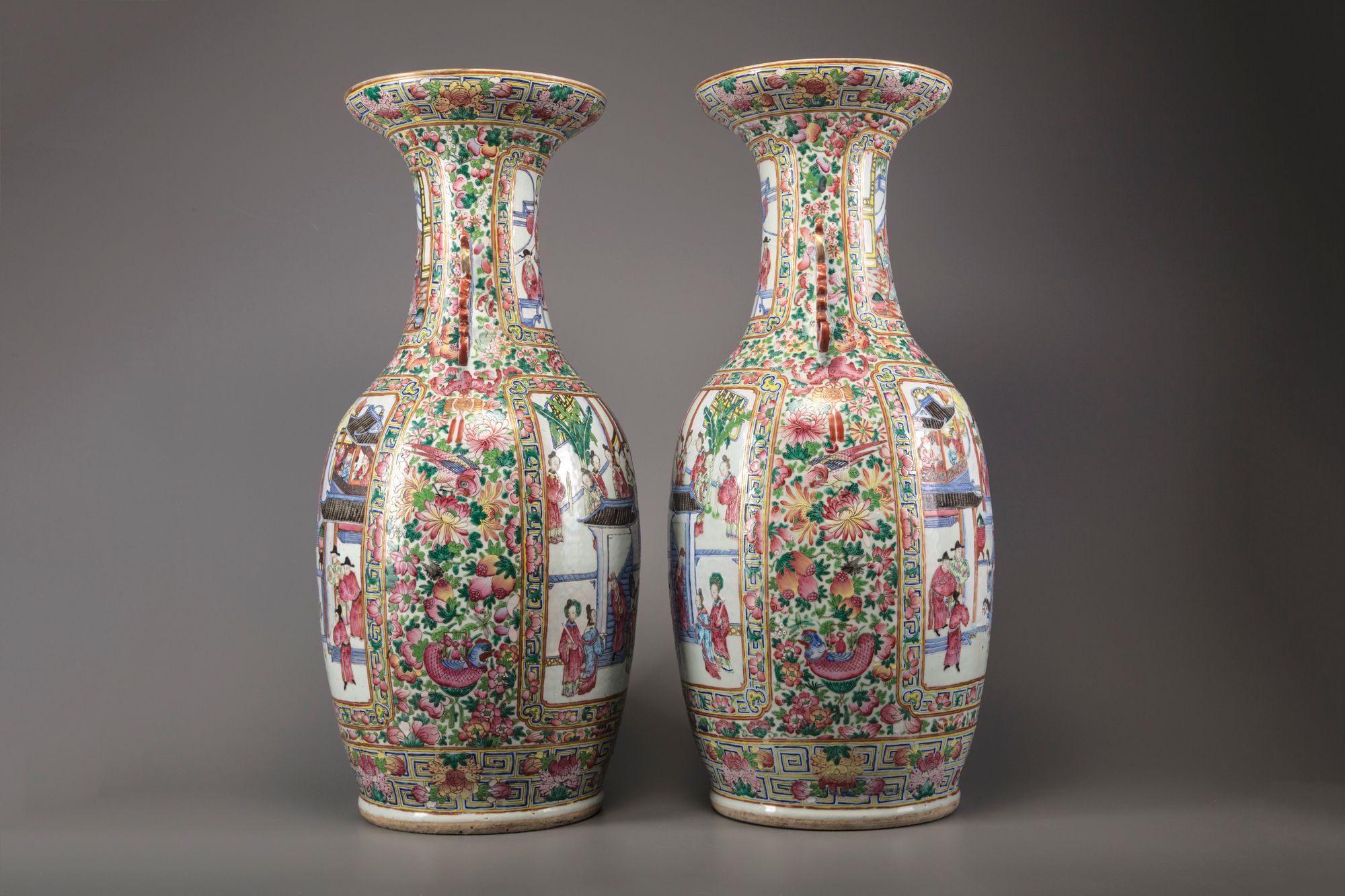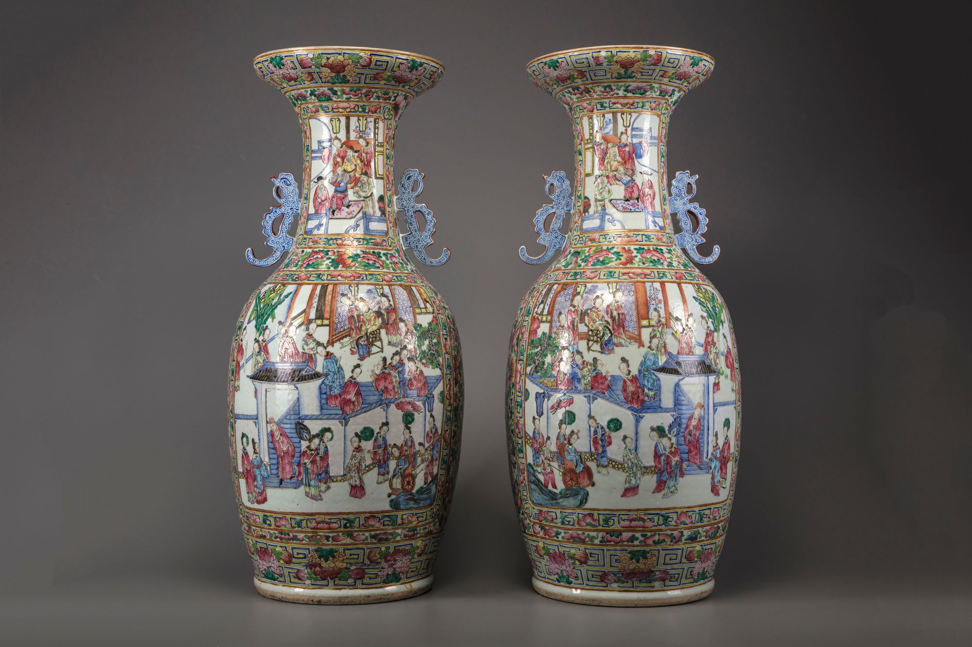 The vases are decorated and gilt in mirror image with shaped panels enclosing narrative scenes depicting officials, ladies, and scholars, all surrounded by a floral border on a yellow scroll ground. The panels are interspersed with a multitude of flowers, birds, and bats holding coins. The necks with two stylised beast handles and the interiors glazed turquoise.