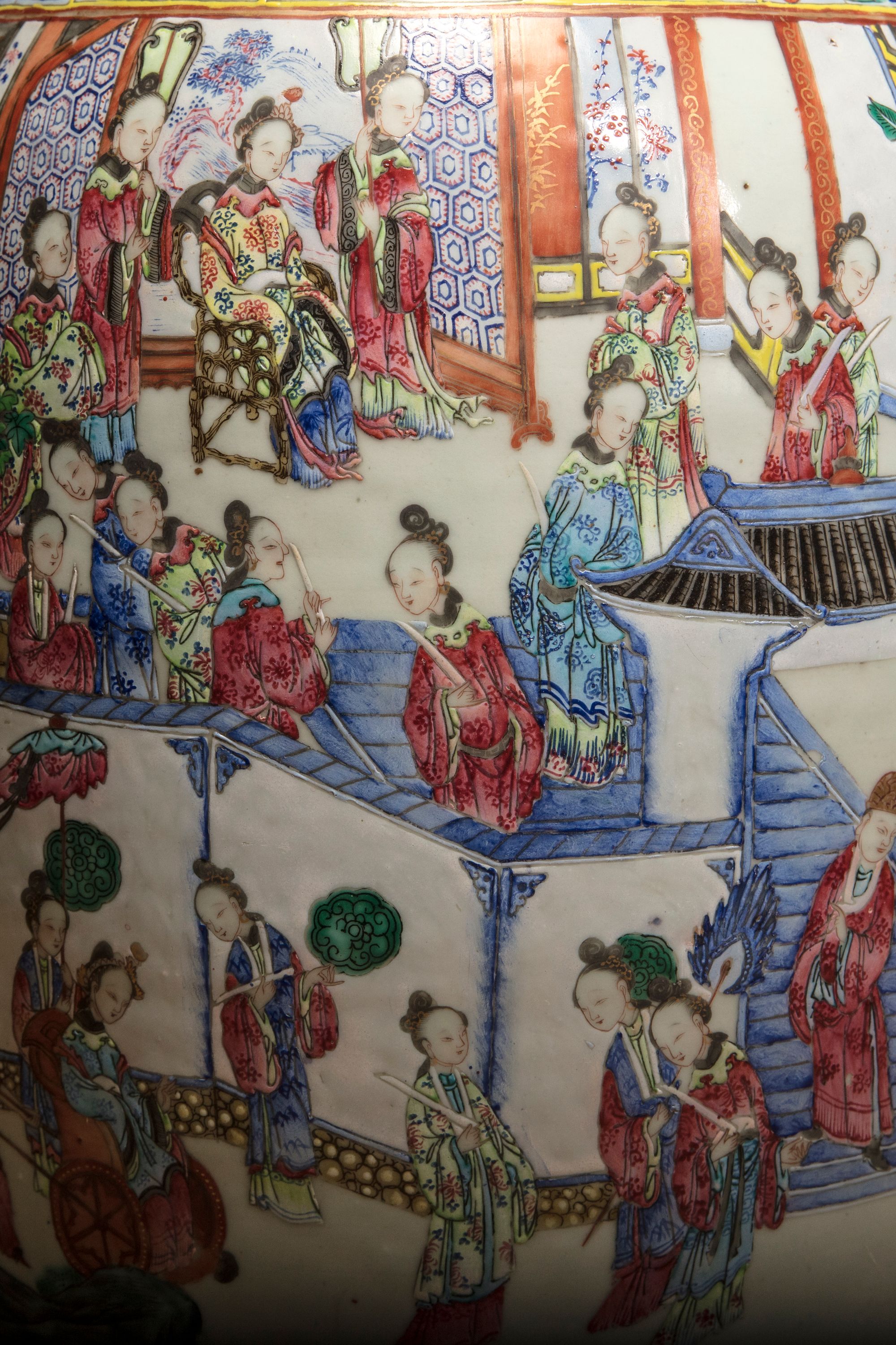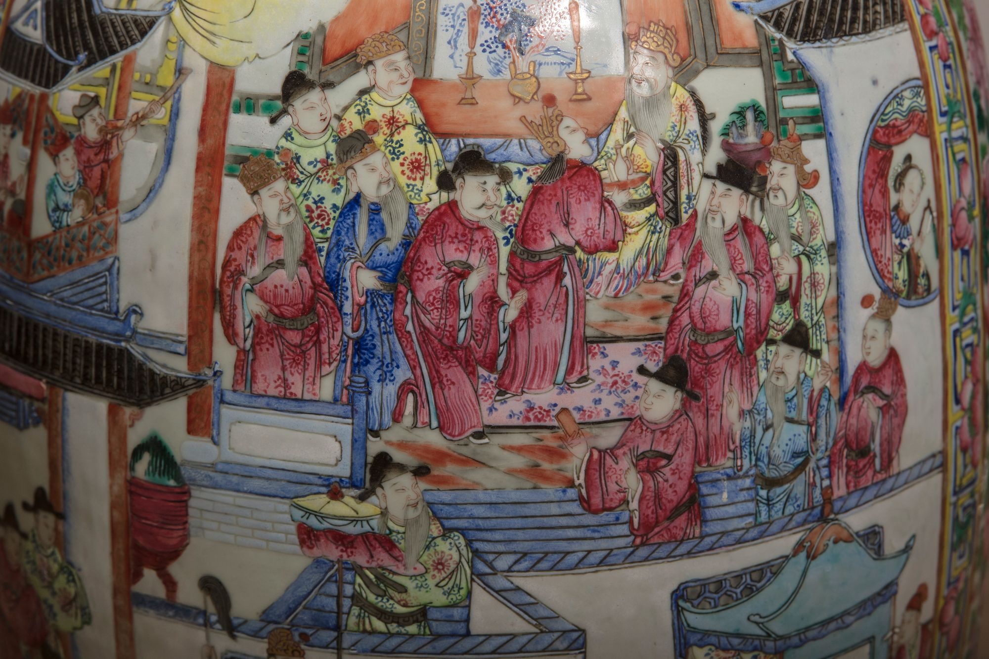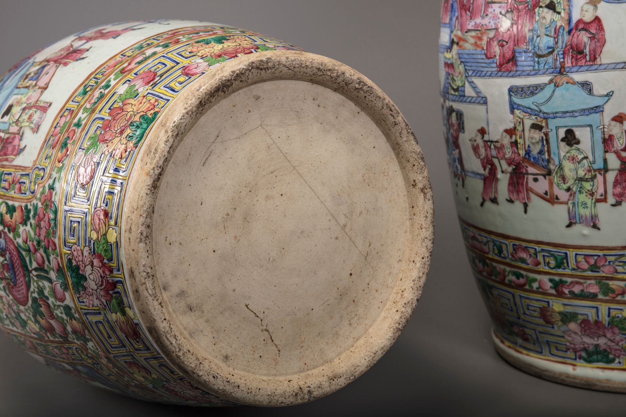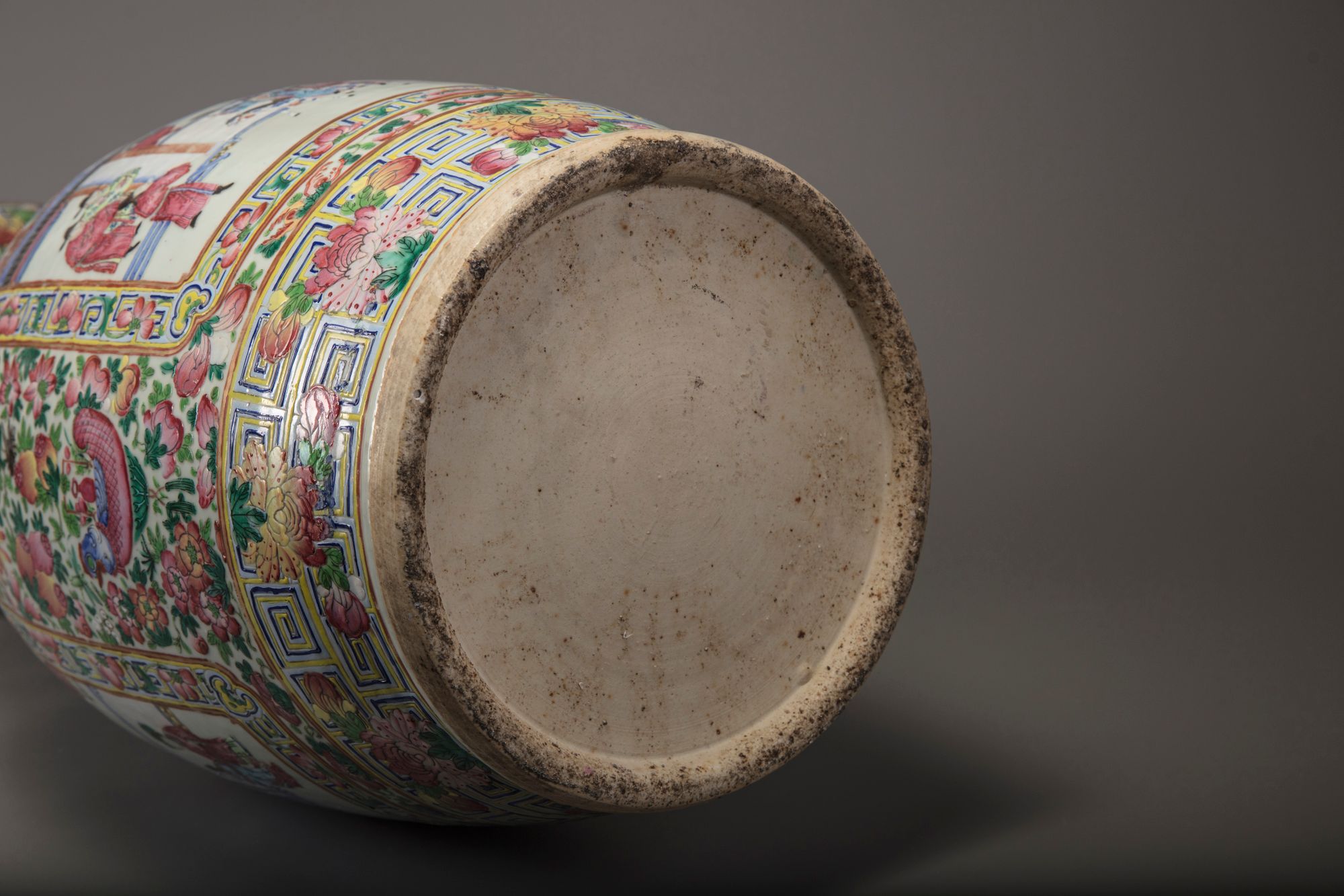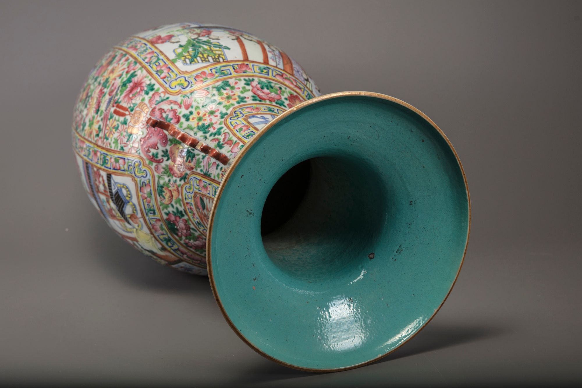 The vases are decorated and gilt in mirror image with shaped panels enclosing narrative scenes depicting officials, ladies, and scholars, all surrounded by a floral border on a yellow scroll ground. The panels are interspersed with a multitude of flowers, birds, and bats holding coins. The necks with two stylised beast handles and the interiors glazed turquoise.
