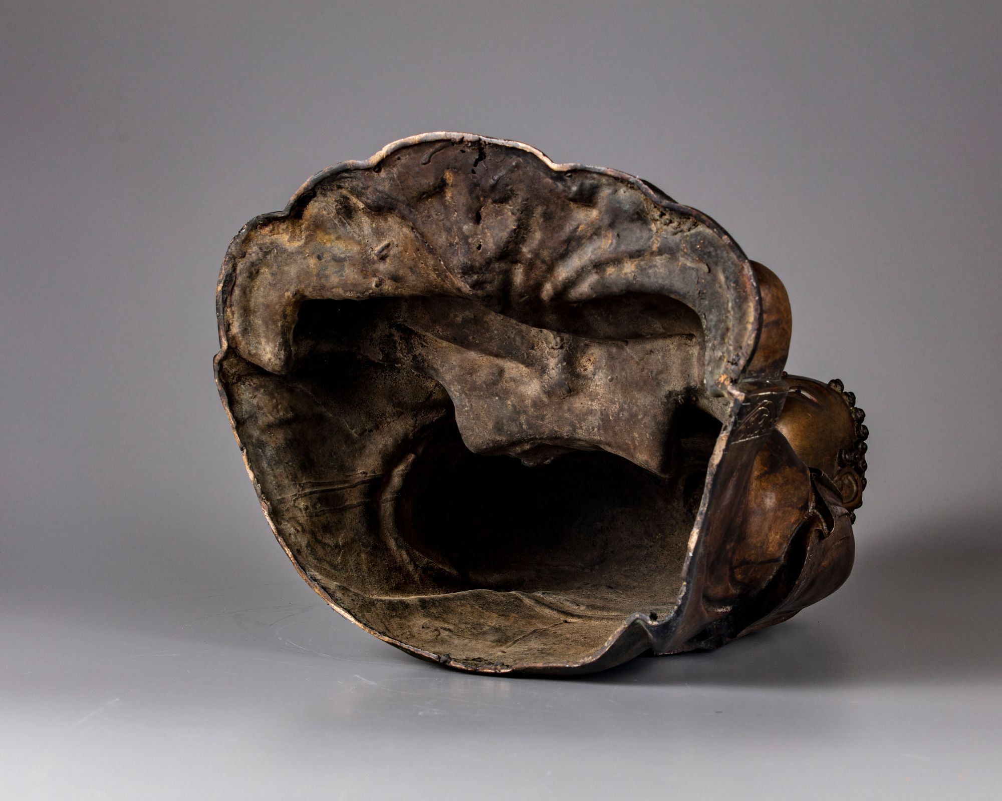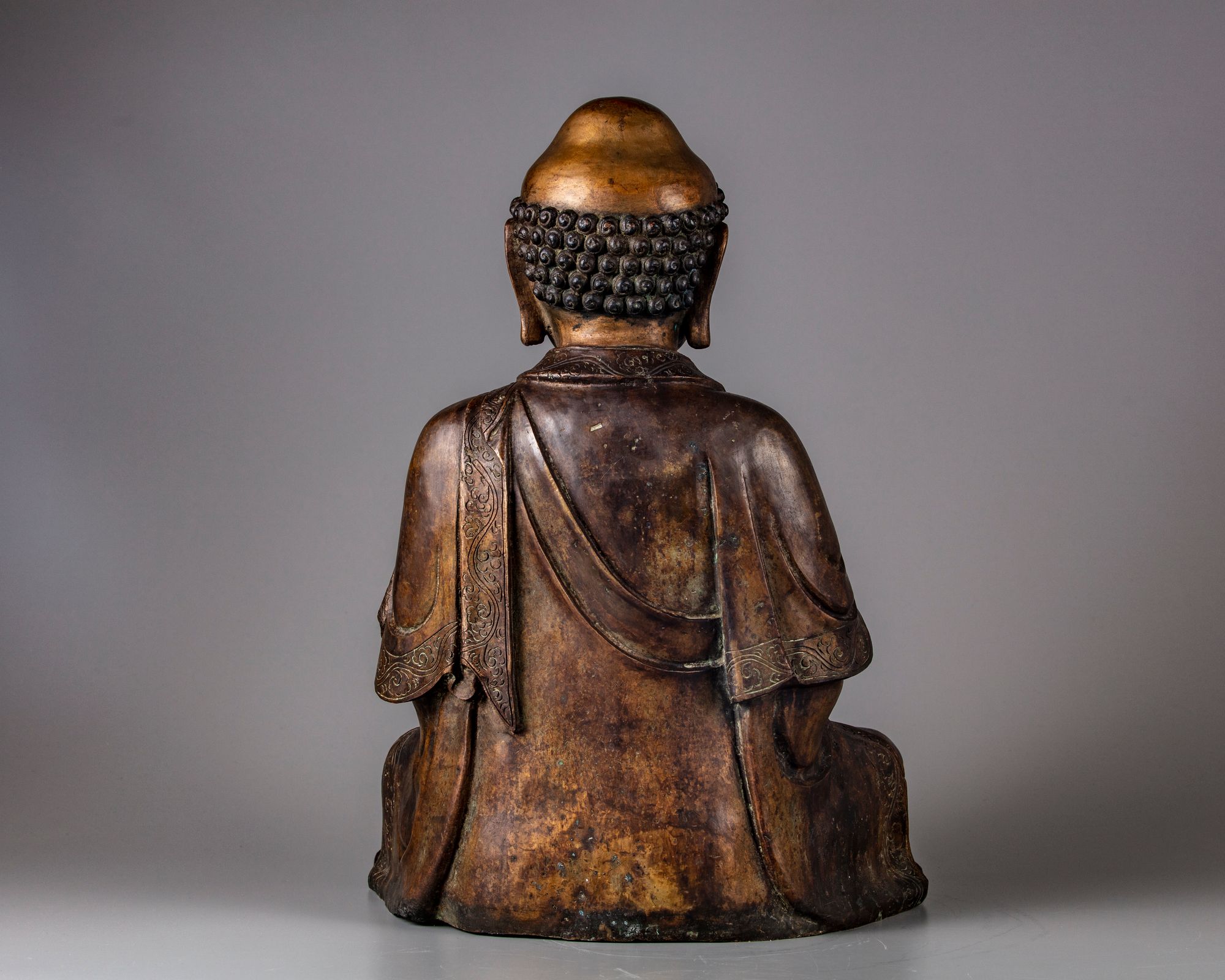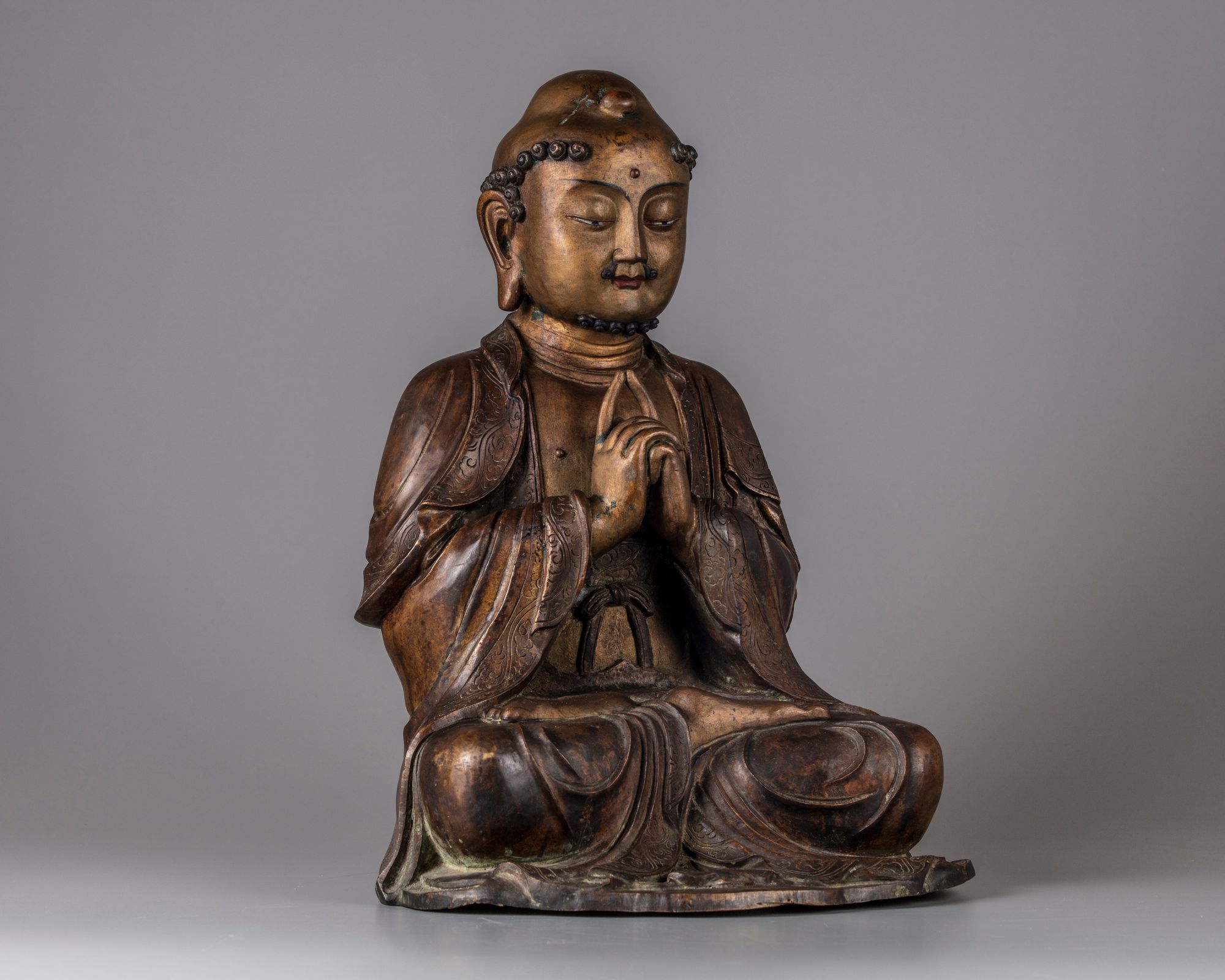 The figure is cast seated in dhyanasana and his hands in uttarabodhi mudra. The face is well cast with a serene expression, with a small urna in the forehead, wearing long robes incised with floral scrolls and bare chest.