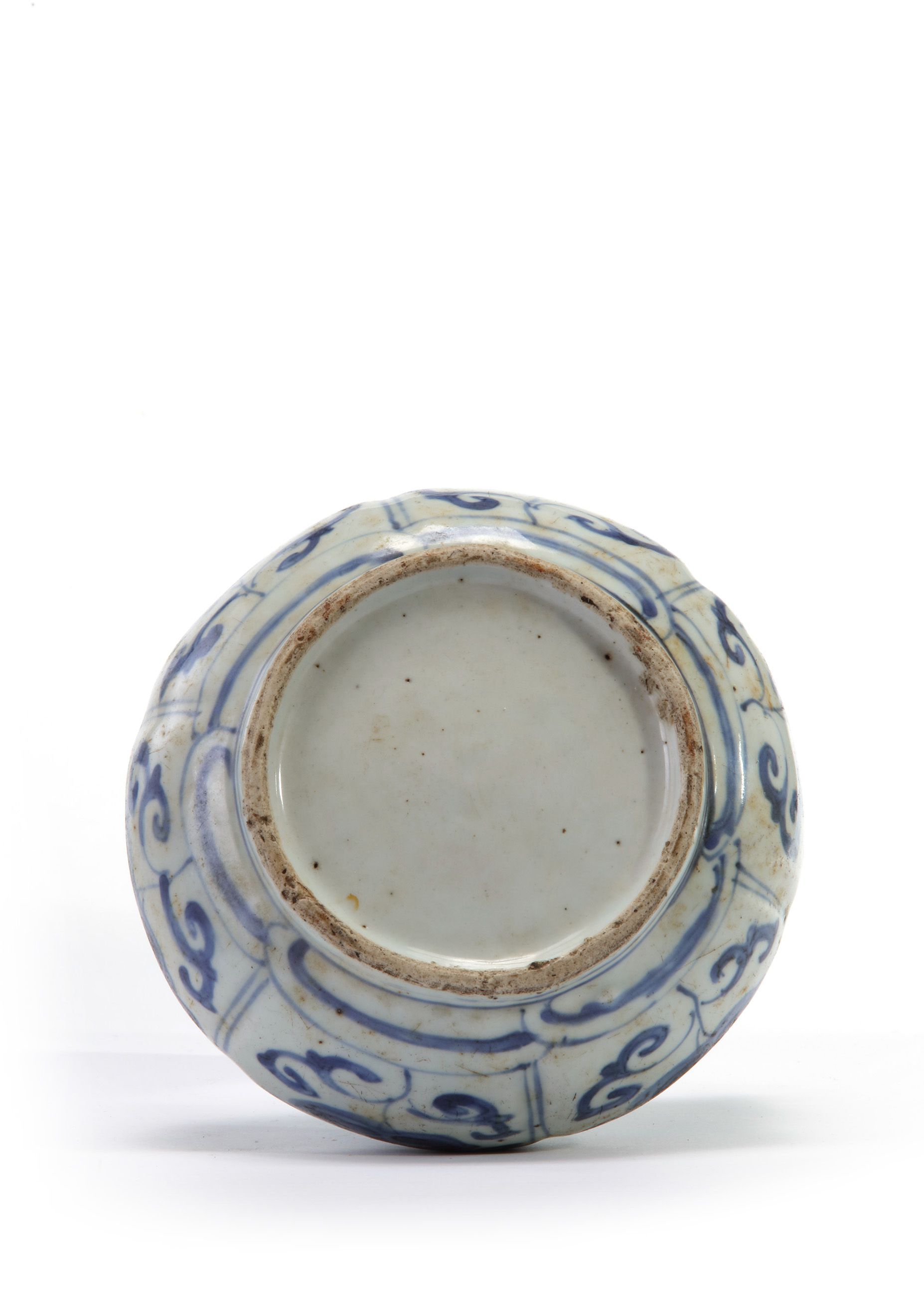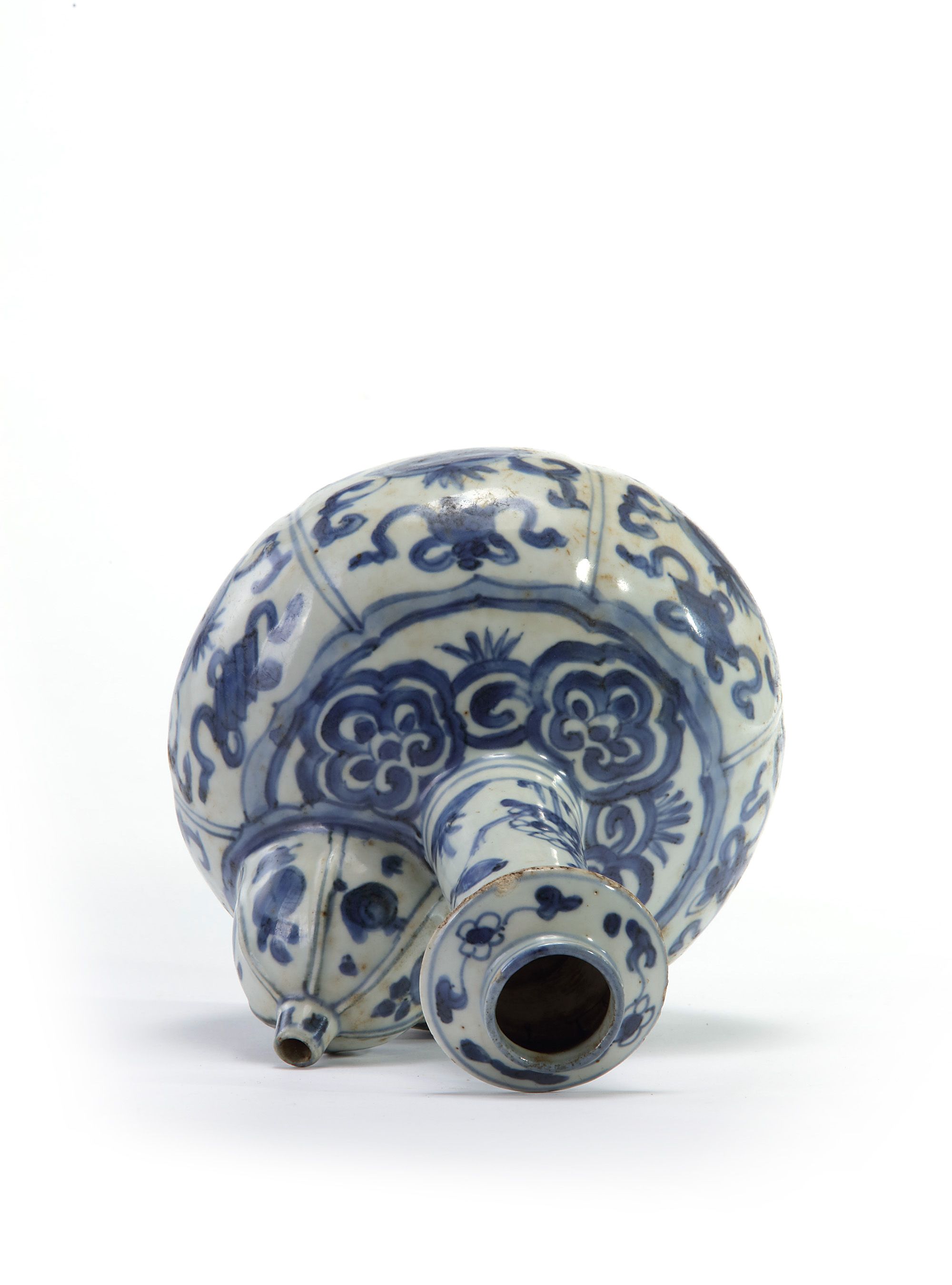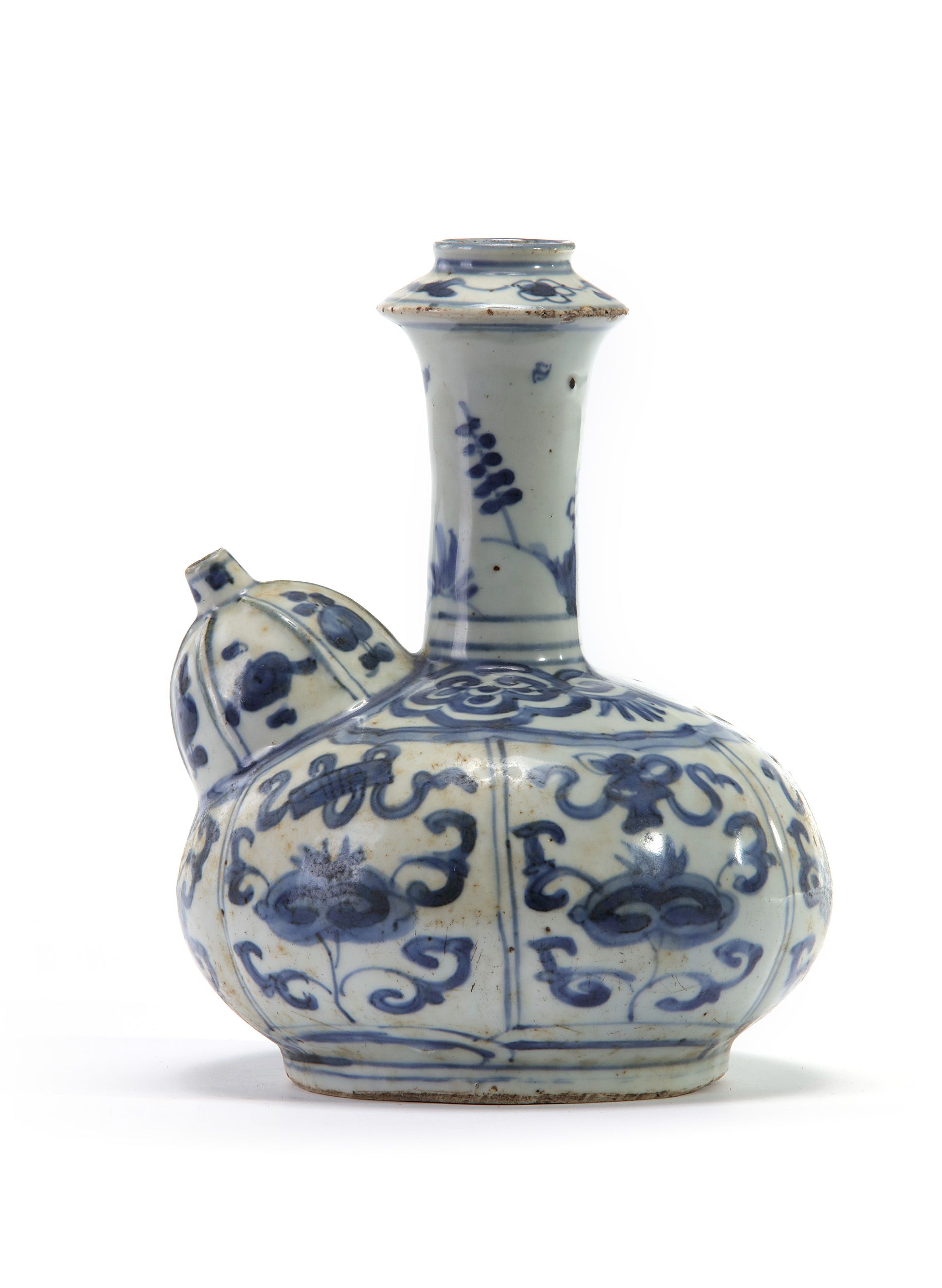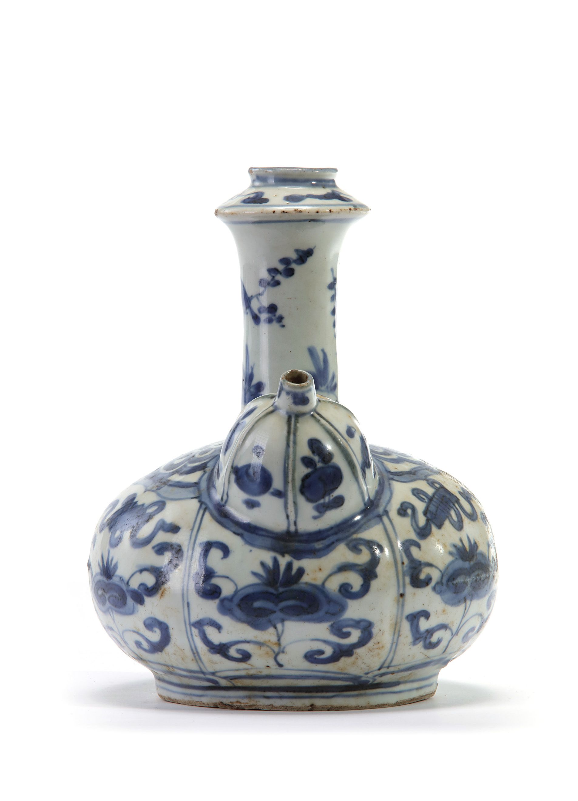 The body is moulded into six panels each enclosing a beribboned precious object above a large lingzhi spray. The shoulder is decorated with a wide band of ruyi-heads, all below birds perched on a flower branch at the neck. the bulbous spout is moulded with ribs separating further decoration.