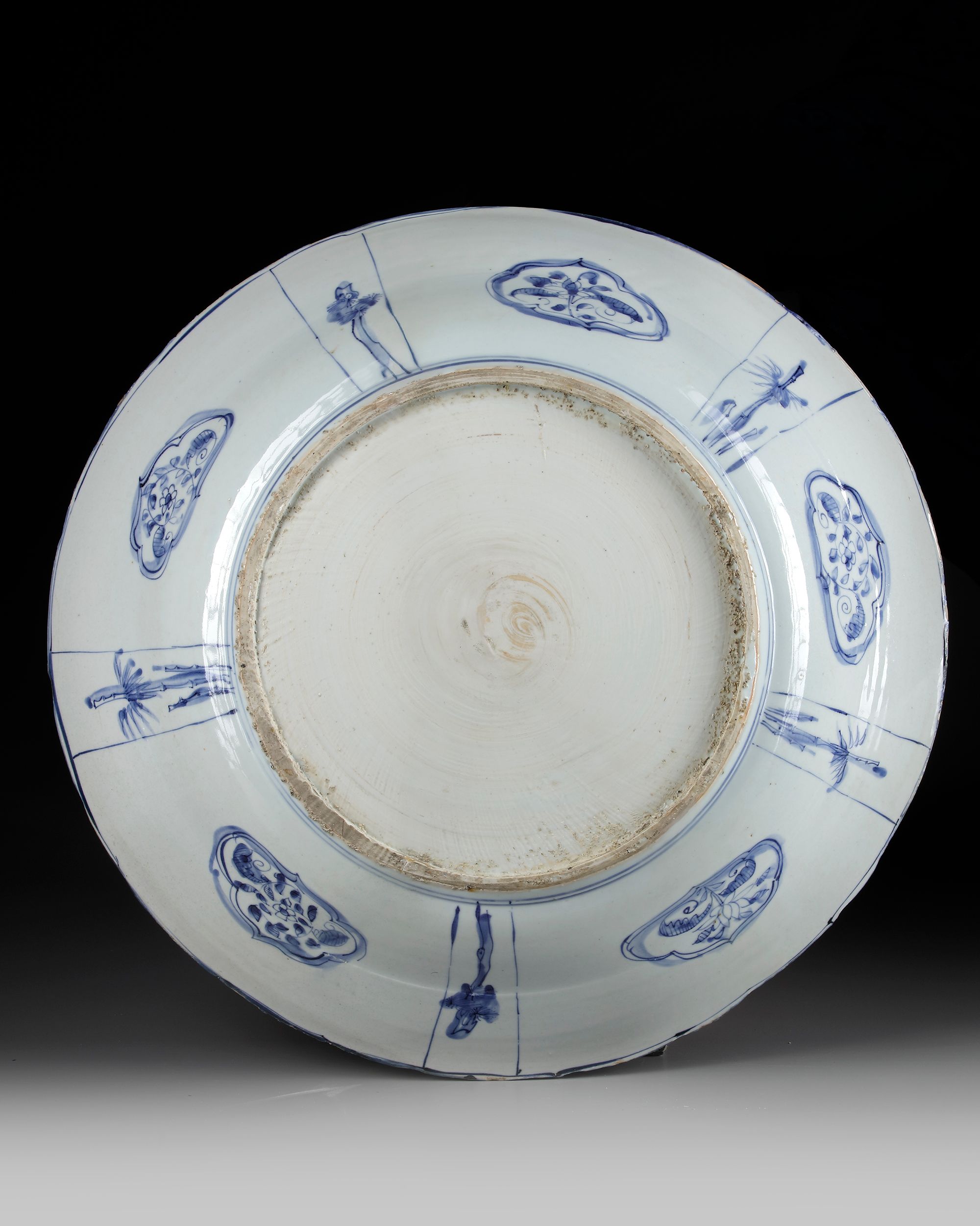 The centre is decorated with a panel depicting a scholar with an attendant holding a fan in a fenced garden, surrounded by a petal band. The cavetto and rim are decorated with panels of farmers and scholars interspersed with European flower sprays. The exterior is decorated with shaped cartouches enclosing flowers interspersed with pine tree and bamboo panels.