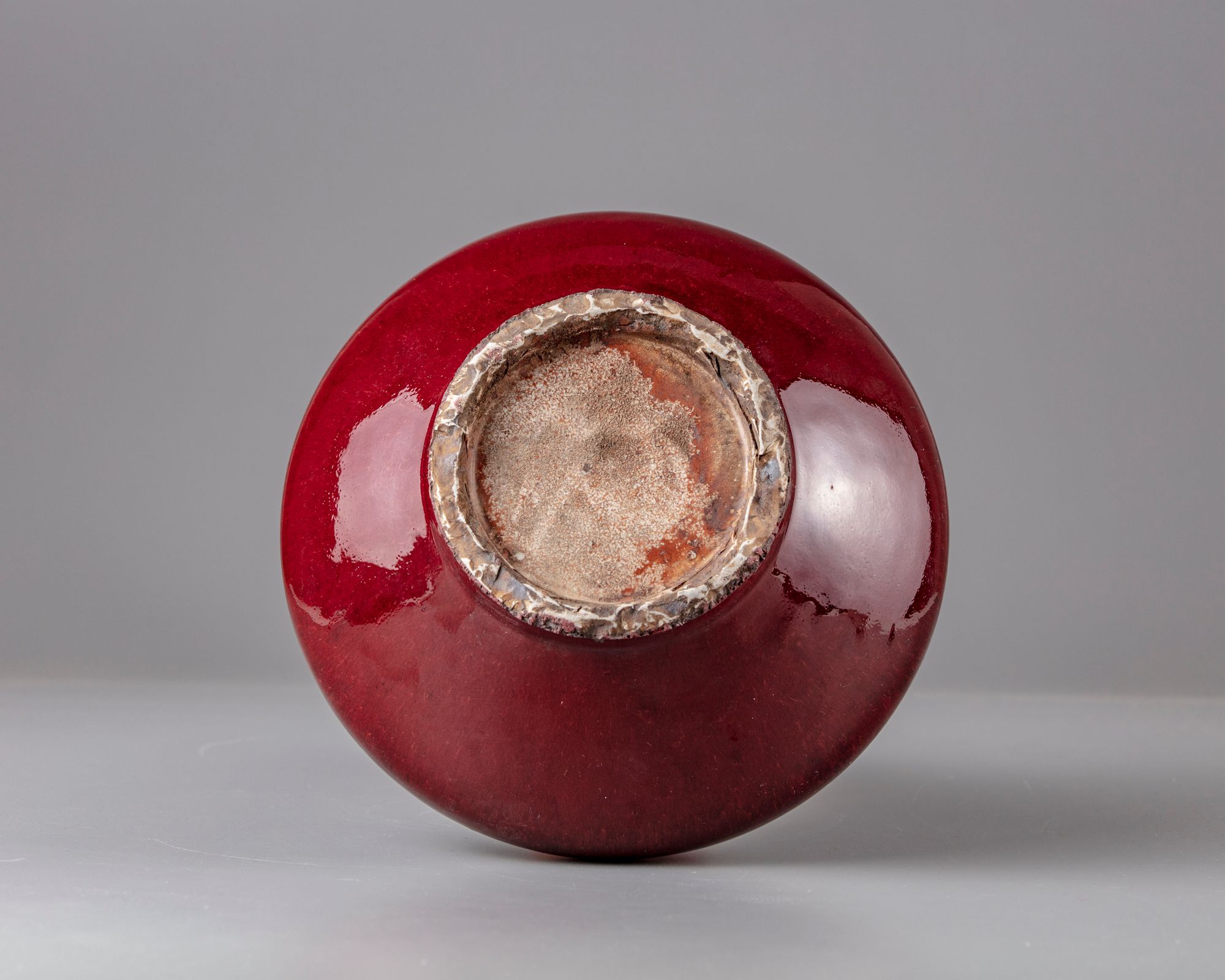The vase with bulbous body is covered in a streaked dark strawberry-red glaze thinning to a white-cream colour at the mouth rim.