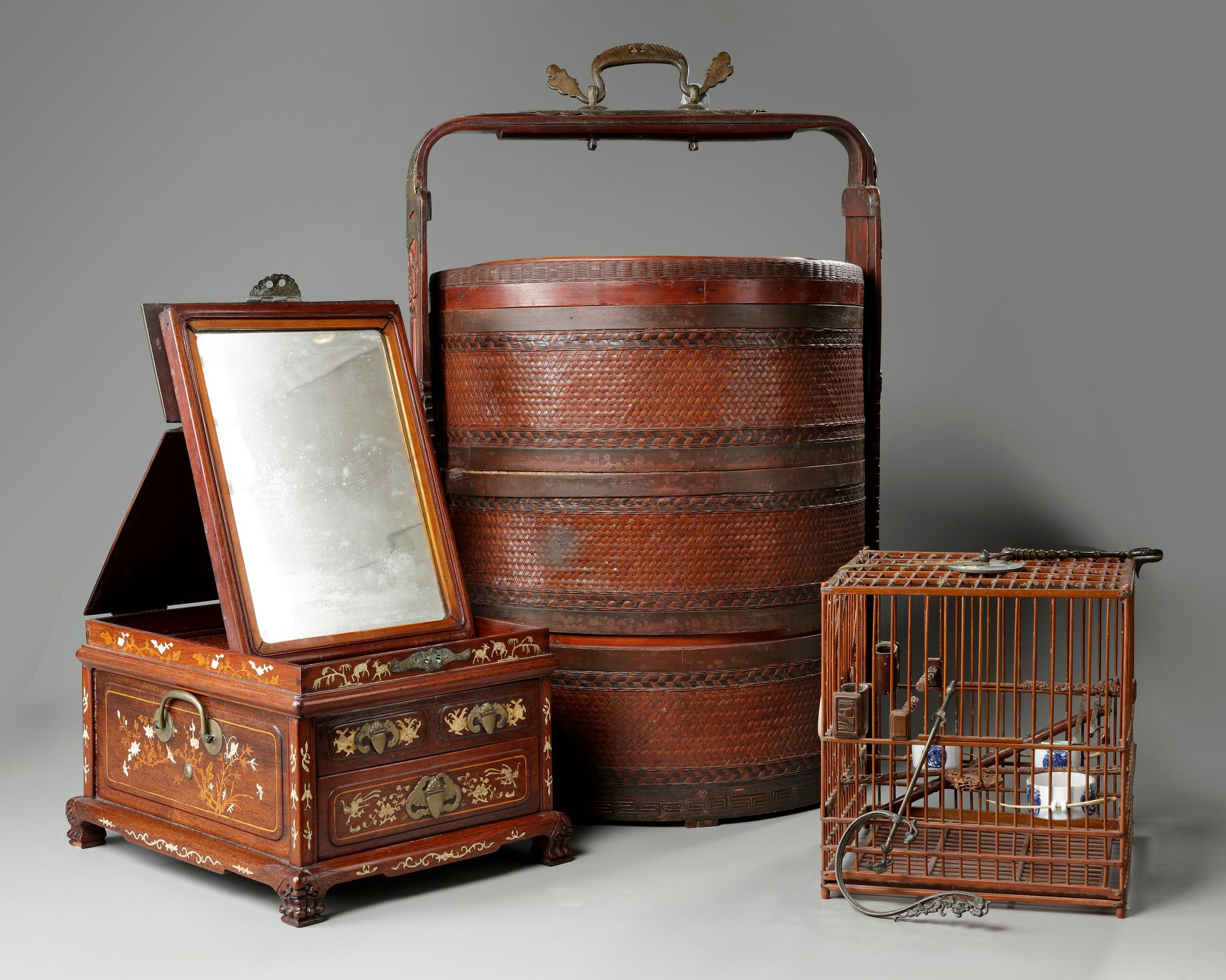 The lot comprises a bird cage carved with openwork panels and fashioned with blue and white porcelain feeders; a circular tiered rattan shuangxi wedding box with the handle carved with openwork flowers trailing upwards and copper hinges; and the vanity box is decorated with three drawers to the front and a top section which opens to contain a mirror. The box is inlaid with bone designs of deer, auspicious fruits, phoenix, and panels enclosing figures to the upper surface.