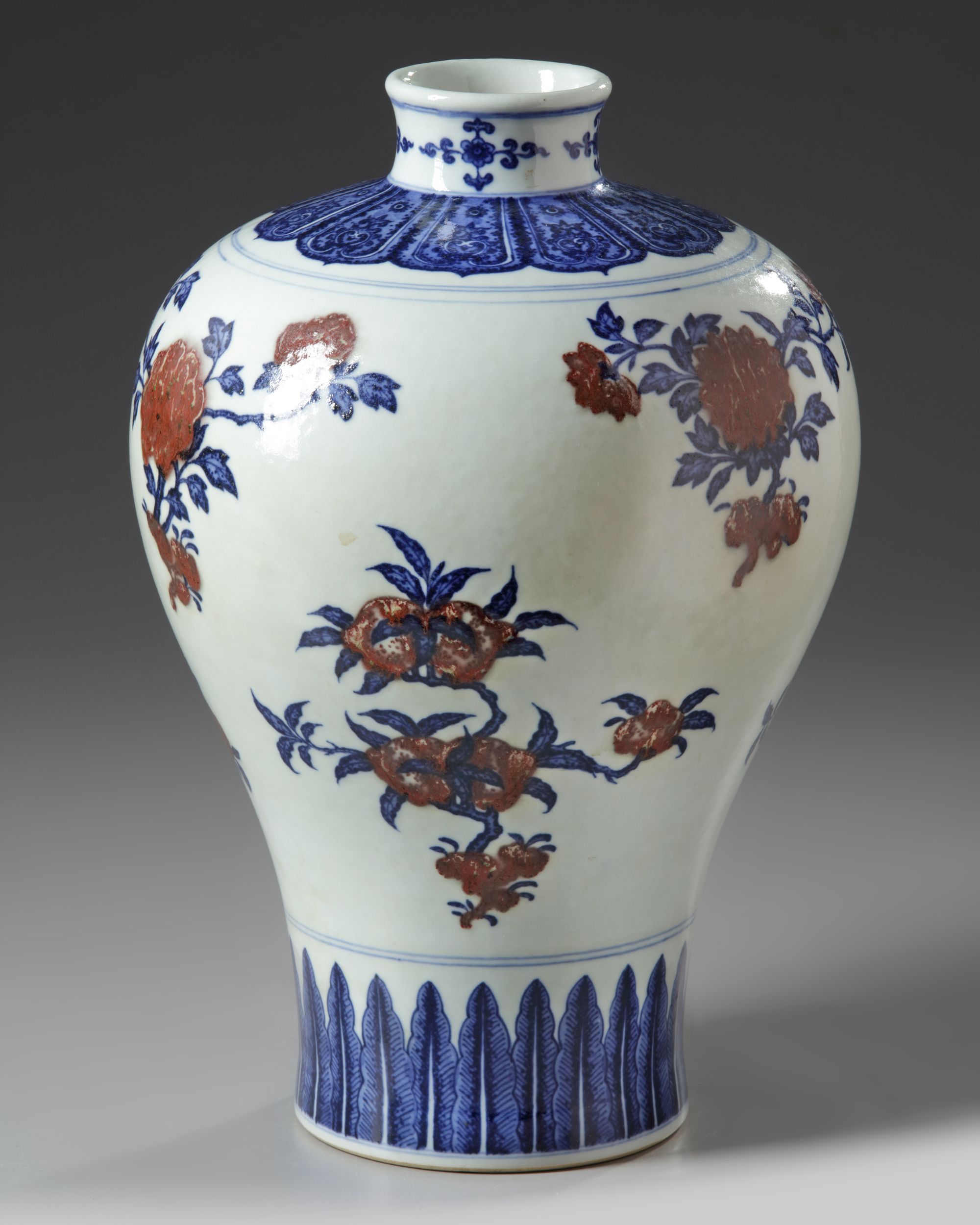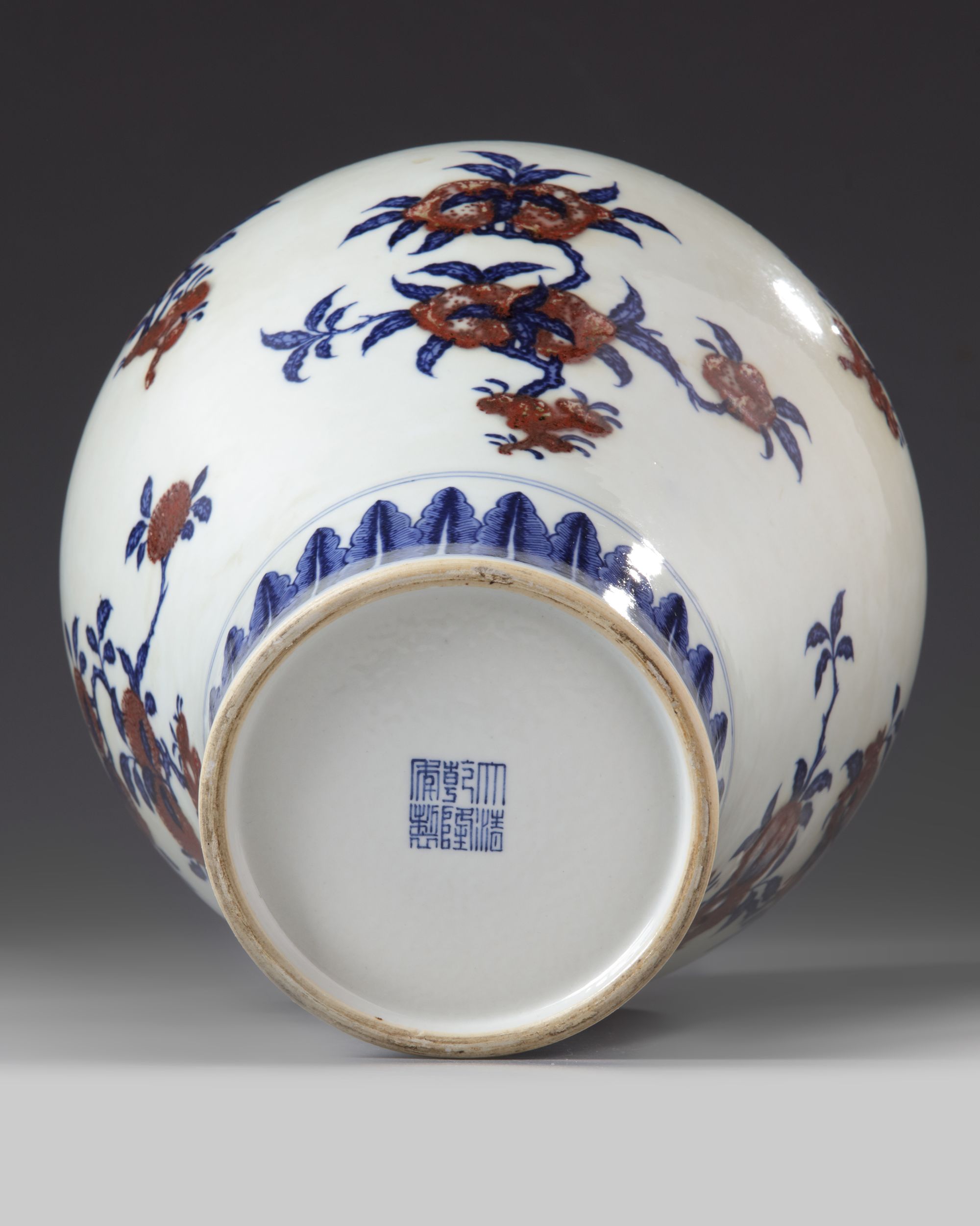 The vase is decorated to the body with various sprays of pomegranate, prunus, peach, rose, and lychee. The foot is encircled by a stiff leaf band and the rim is encircled by a lappet band below flower sprays. The base with an apocryphal Qianlong mark.