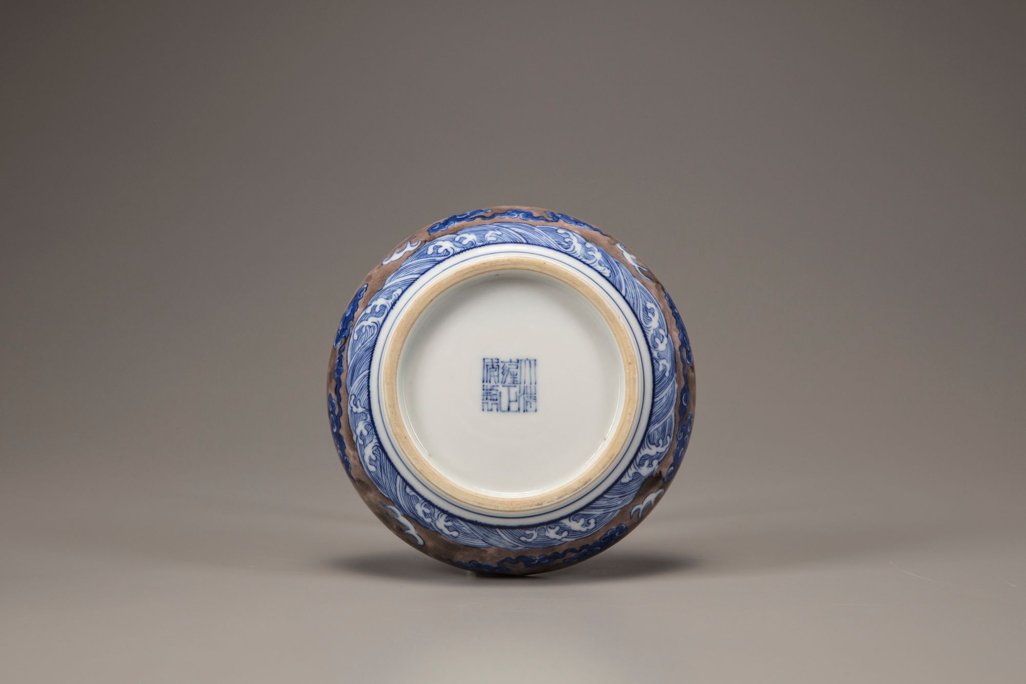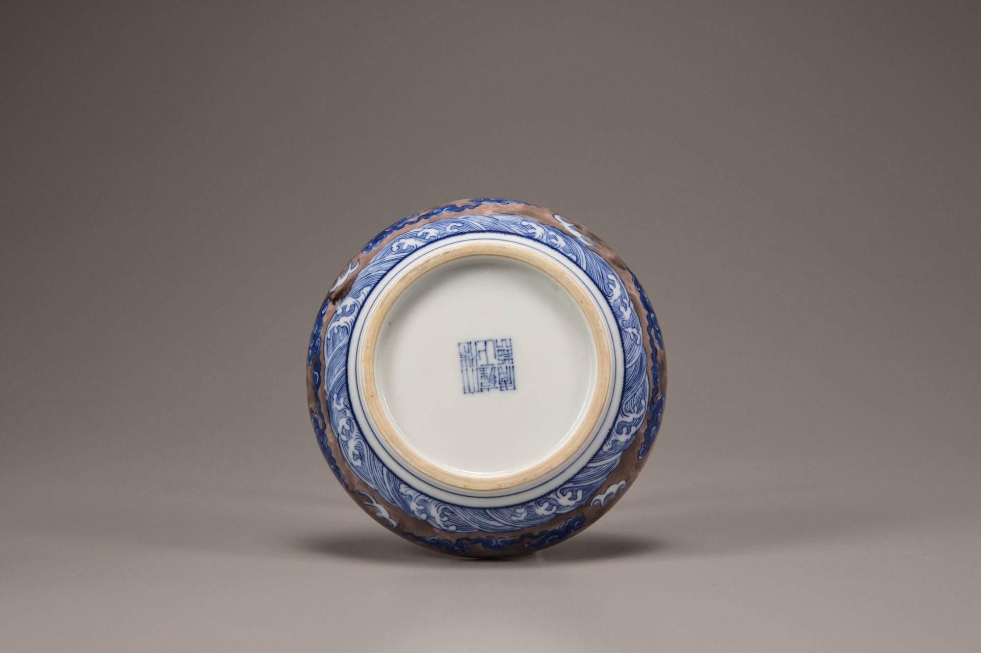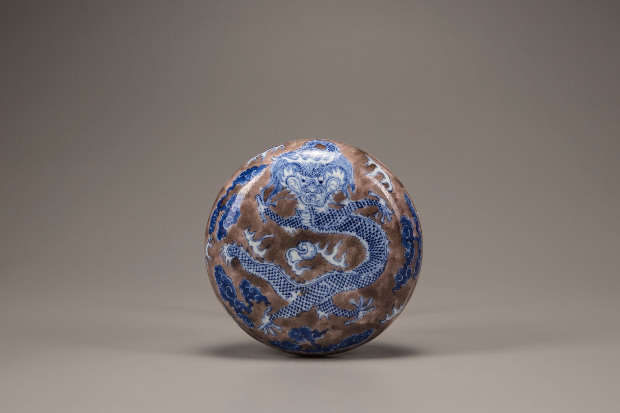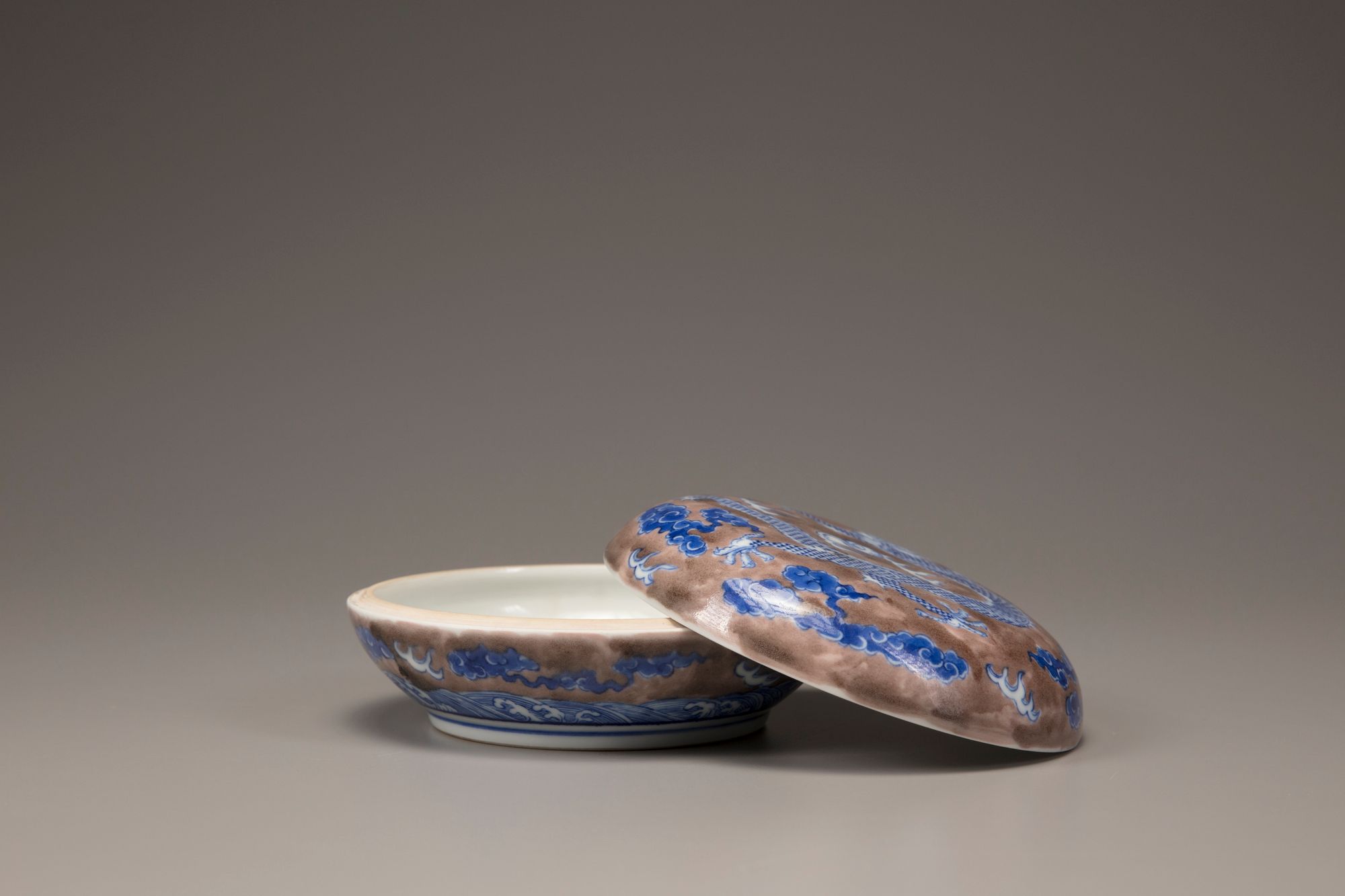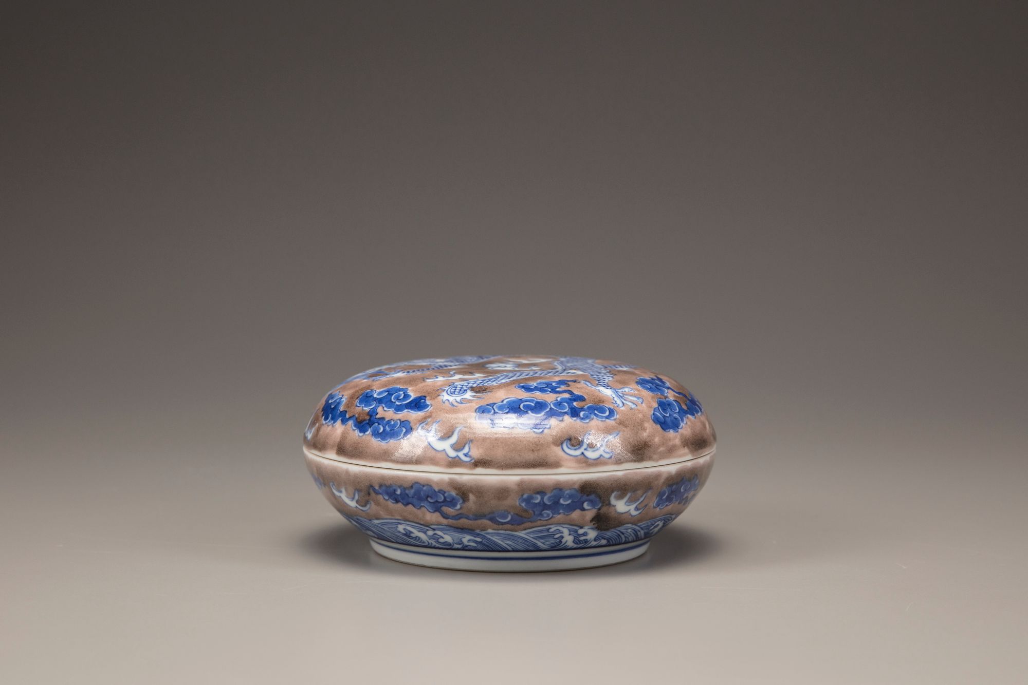 The cover is decorated with a front-facing dragon chasing the flaming pearl amongst ruyi-shaped clouds and flame scrolls, all reserved on a rich aubergine ground. The box base is similarly decorated, with an apocryphal Yongzheng mark to the underside.