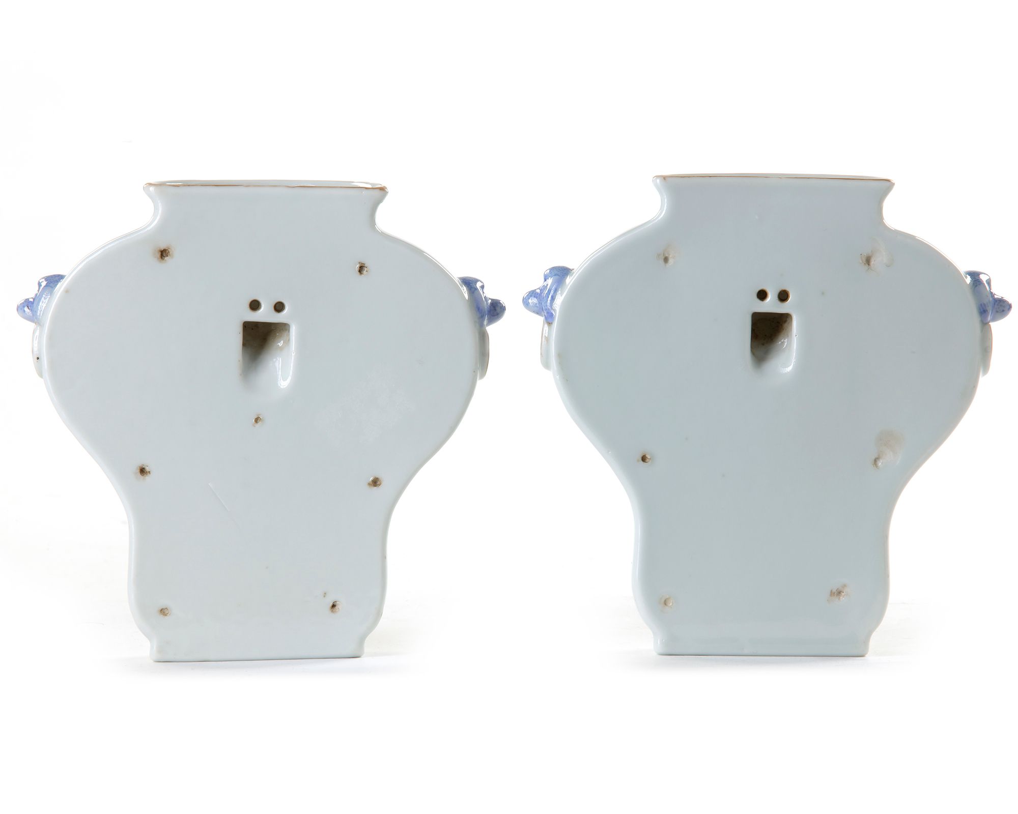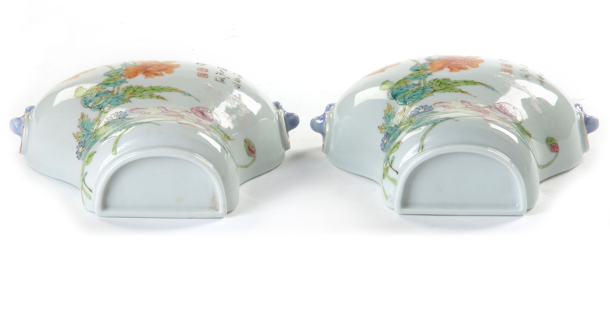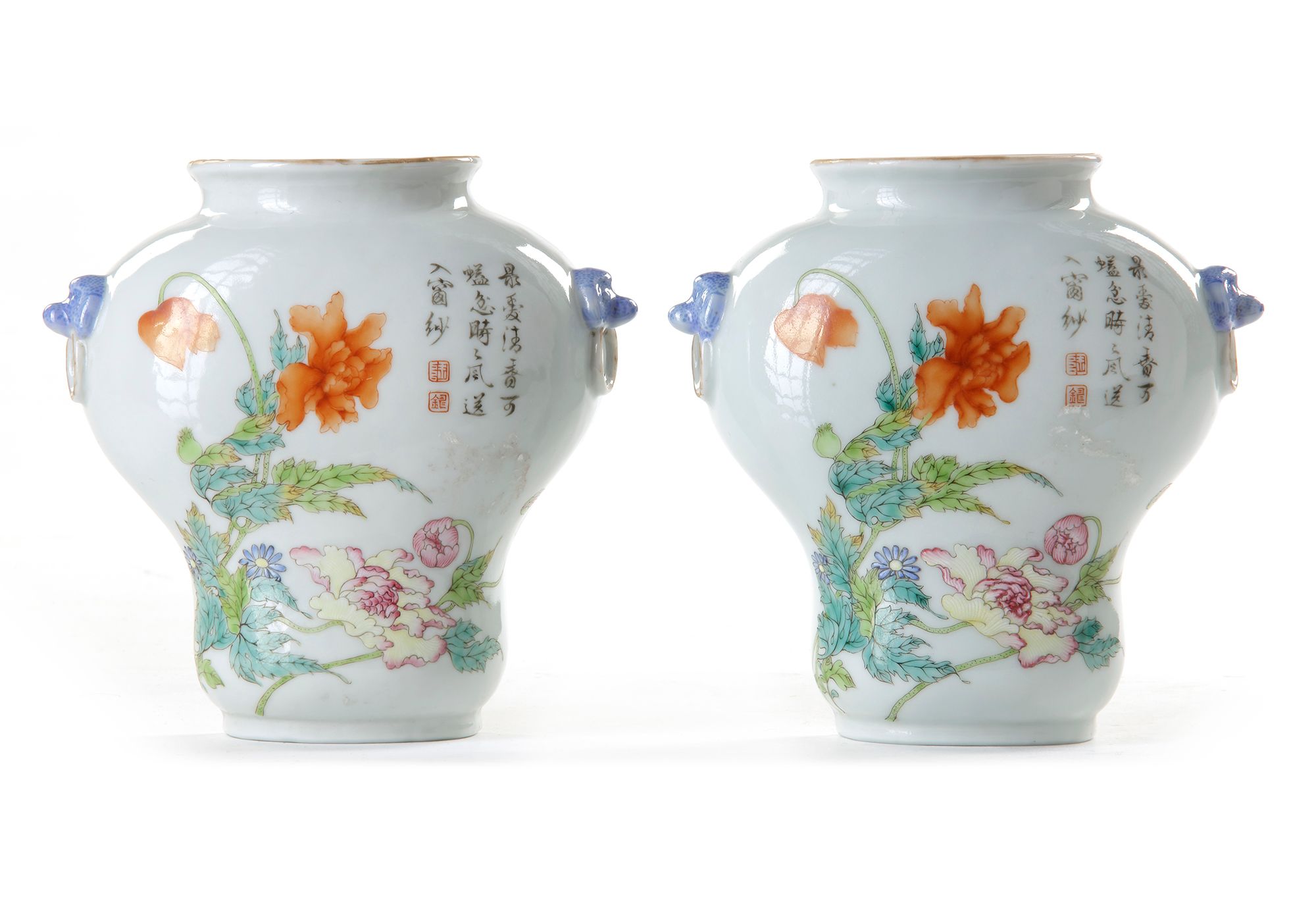 Each vase is decorated large chrysanthemum and peony flowering branch. Further stylised with animal shaped handles and Chinese inscriptions"poems".