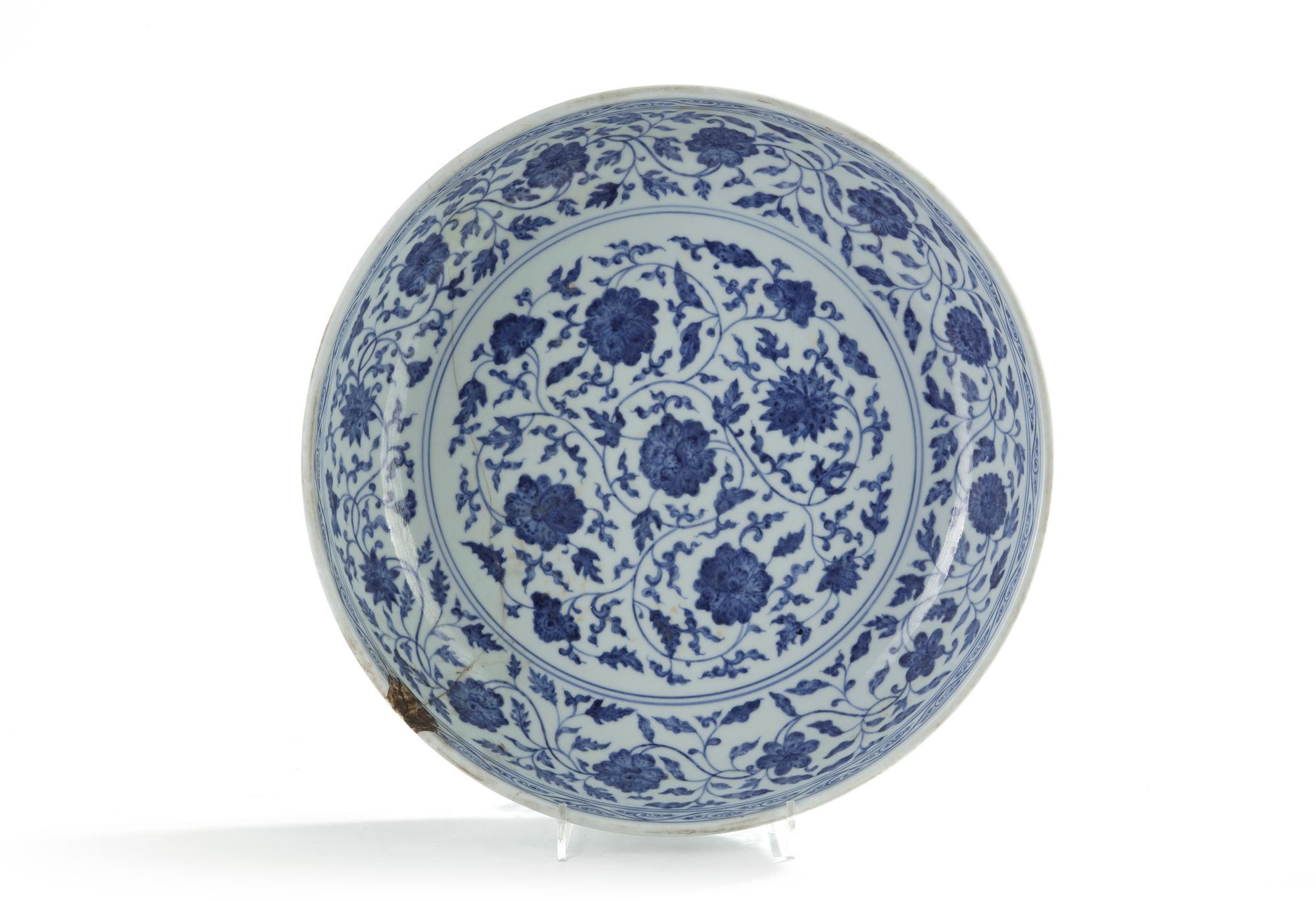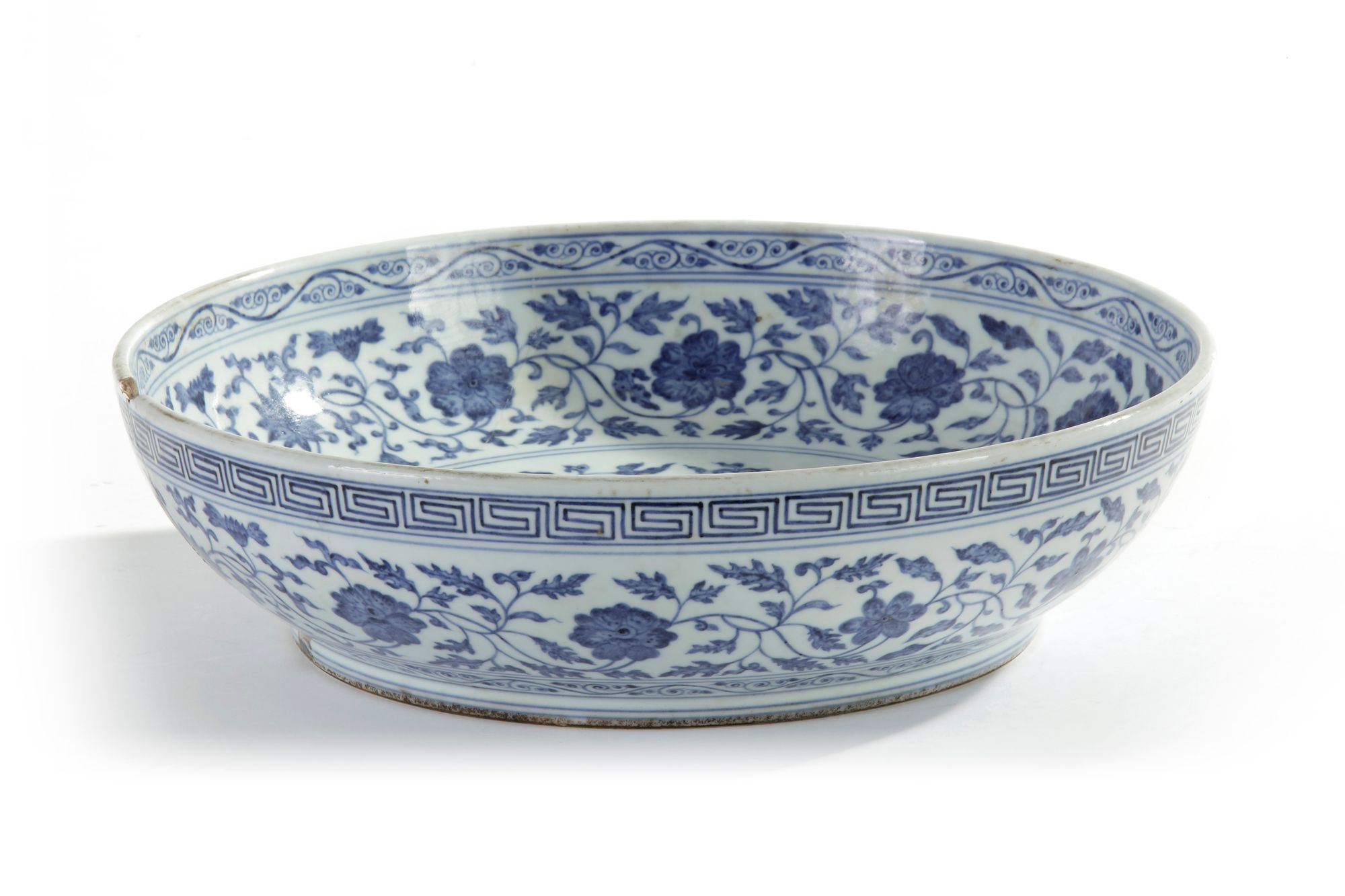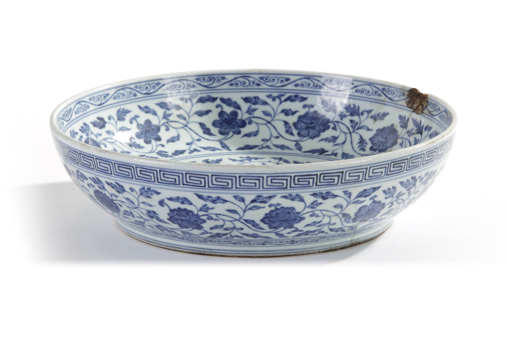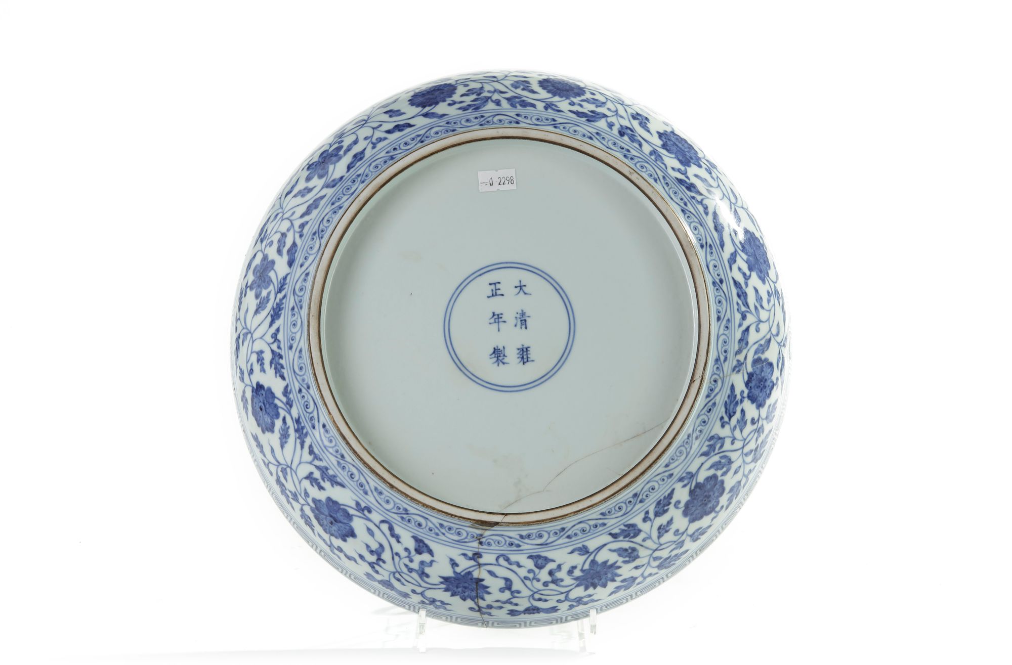The charger is decorated in an 18th century style imitating the blue and white wares of the Ming dynasty. The dish is decorated to the centre with a roundel enclosing various flowers on densely scrolling foliage. This design is repeated on the cavetto and on the exterior, all between a band of scrolls and key frets. The underside with an apocryphal Yongzheng mark to the base.