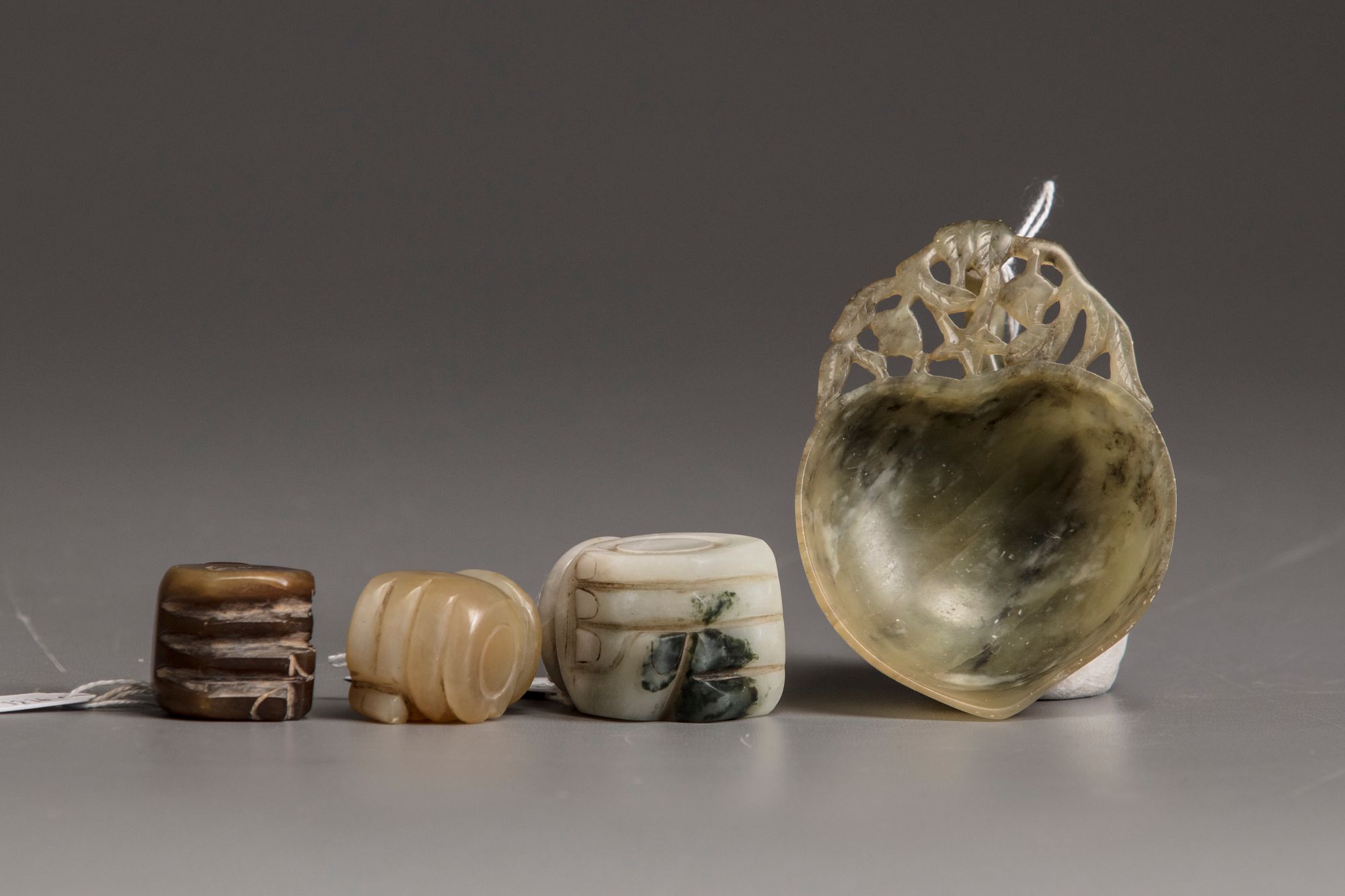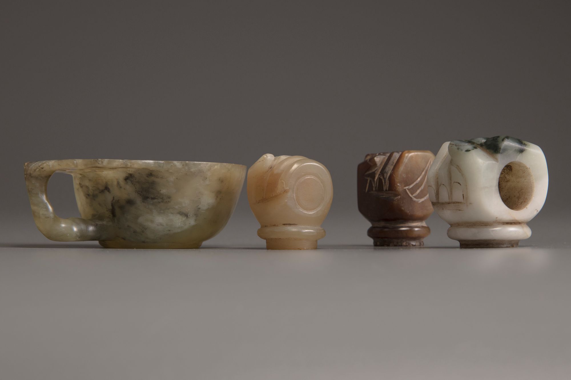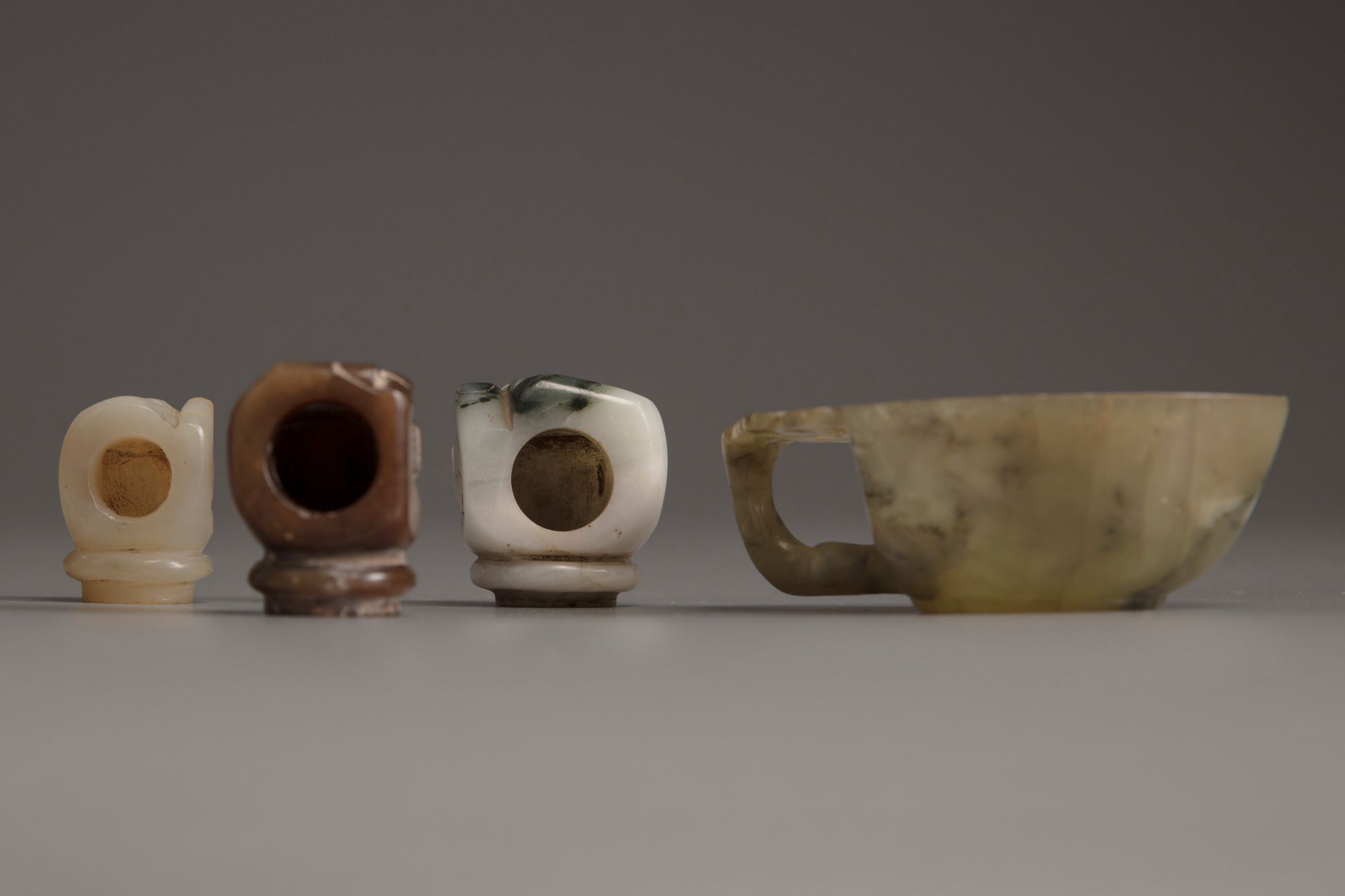 Each holder is carved as a closed fist with an aperture to the upper surface, comprising one of white and grey jade, pale celadon agate, and brown agate. The celadon and grey hardstone coupe is carved as a peach, the handle carved in openwork as a flowering leafy branch bearing peaches. The stone is of a celadon tone with grey and white inclusions.