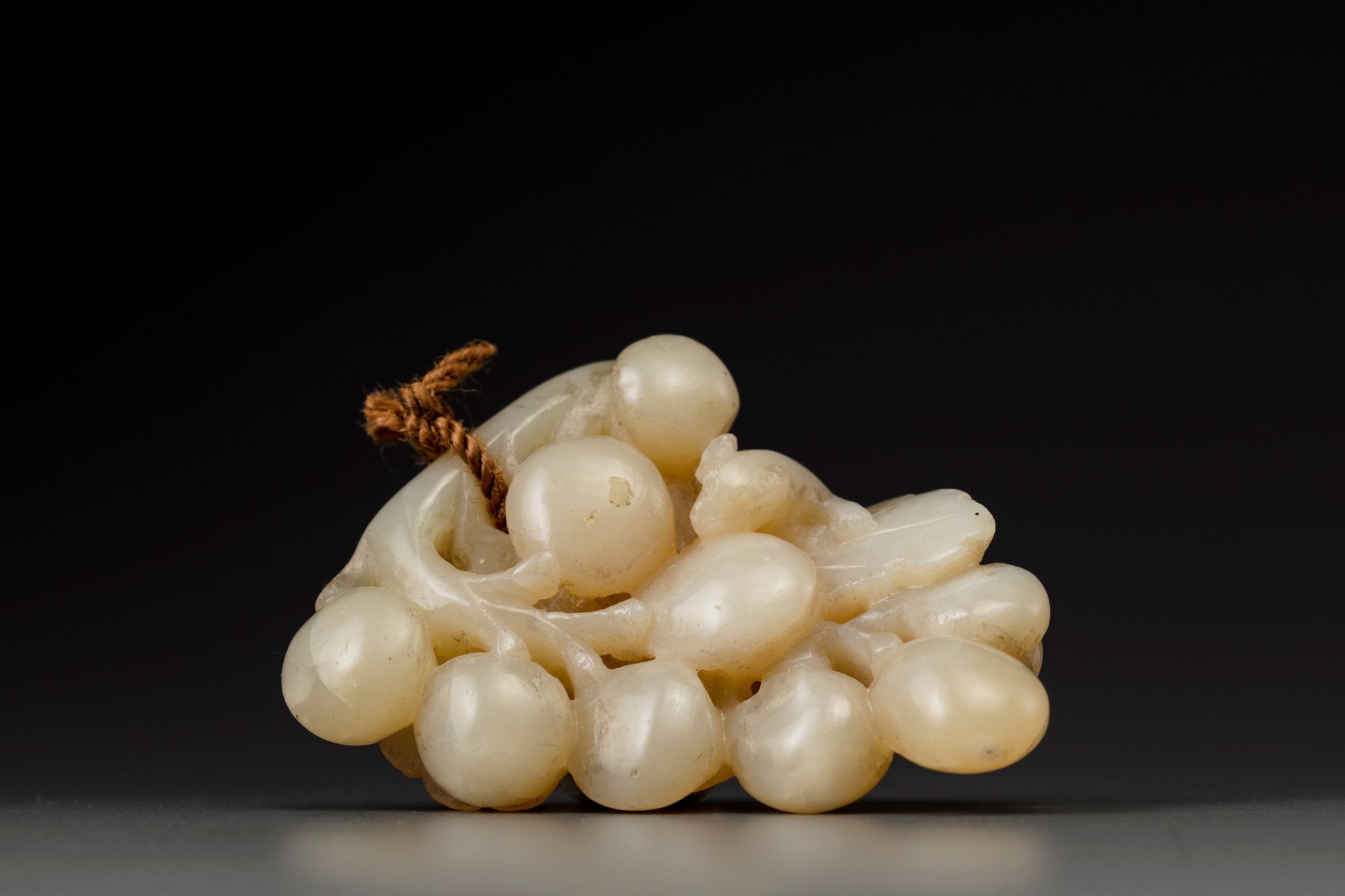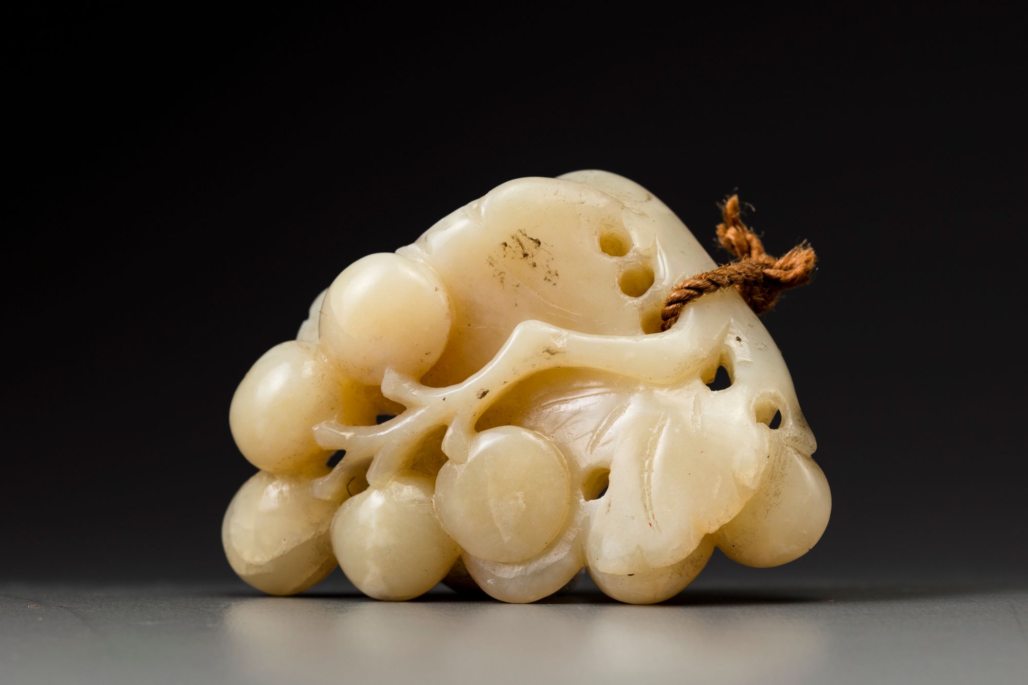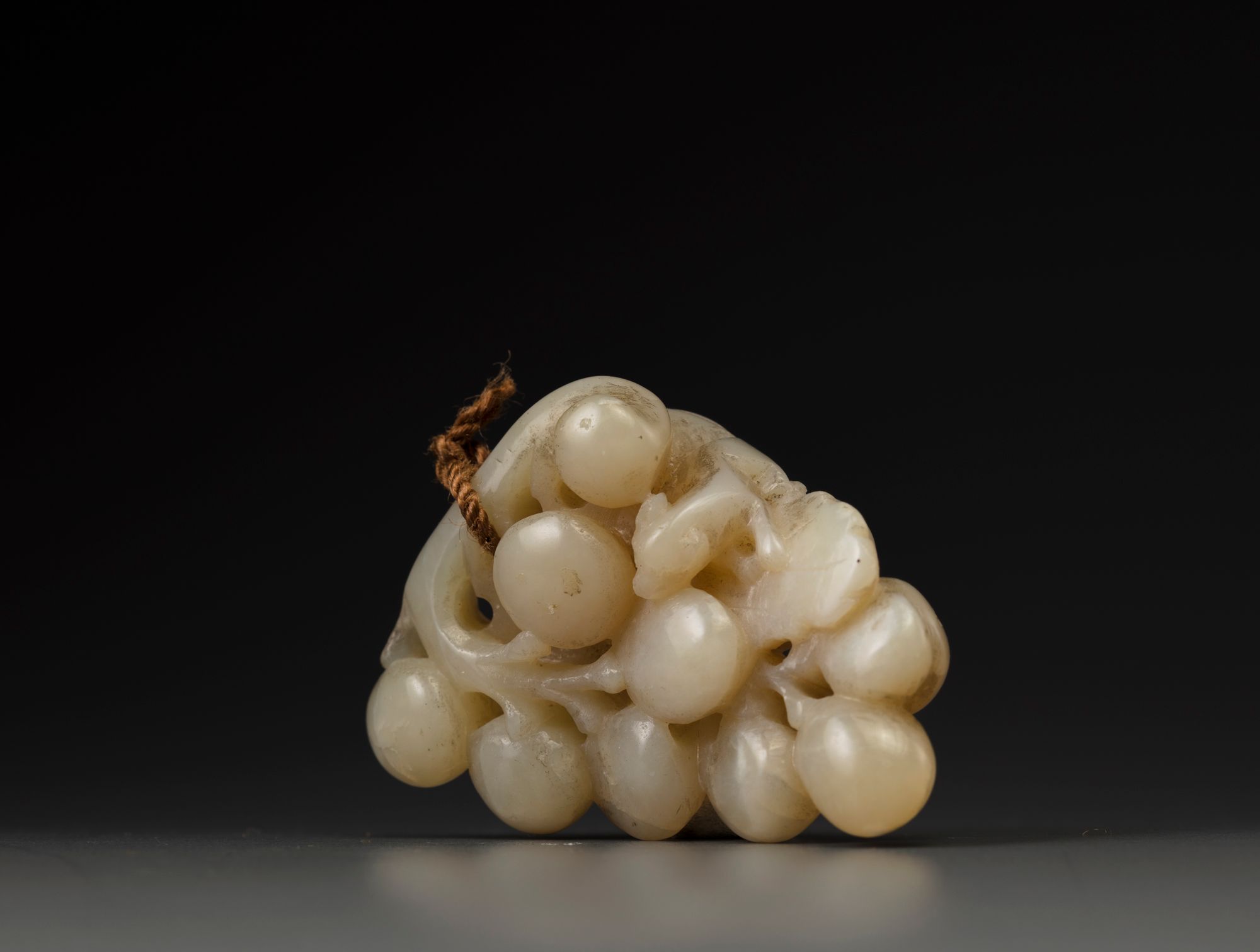 The openworked piece is carved in the round with a squirrel clambering amongst a bunch of grapes growing on a leafy branch. The stone is of an even ivory tone.