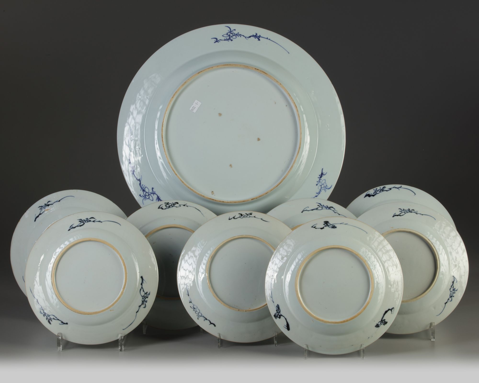 The group comprises eight smaller plates and one large plate, each plate is decorated in pencil style with a central floral roundel surrounded by a foliate band and further floral and insect panels. The reverse is decorated with scattered flower sprays.