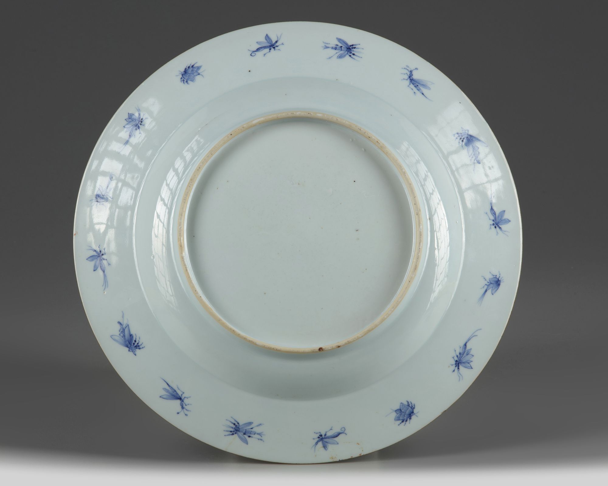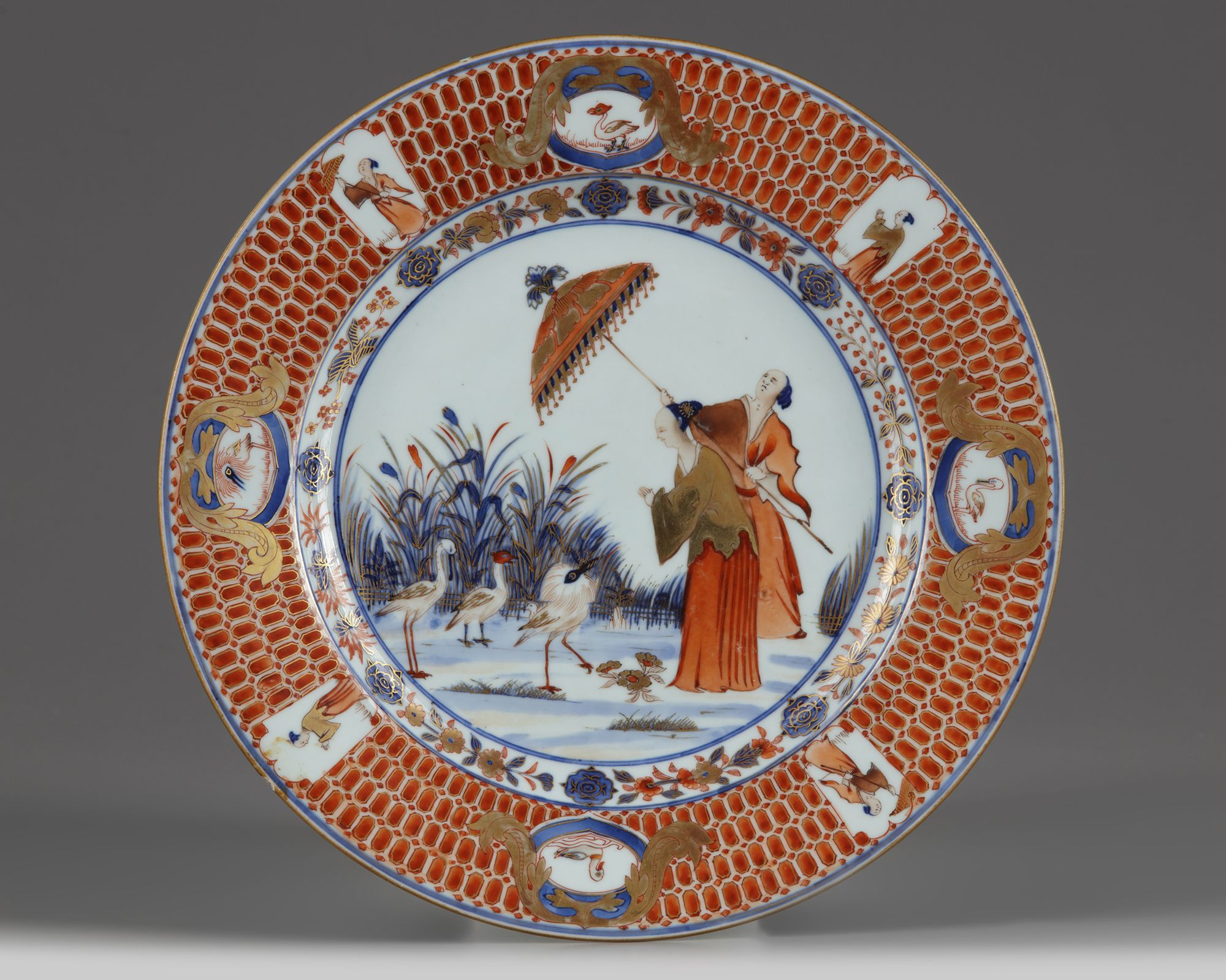 The dish is painted and gilt with the 'Dame au Parasol' design, encircled by figure and bird cartouches on a cell-pattern ground.